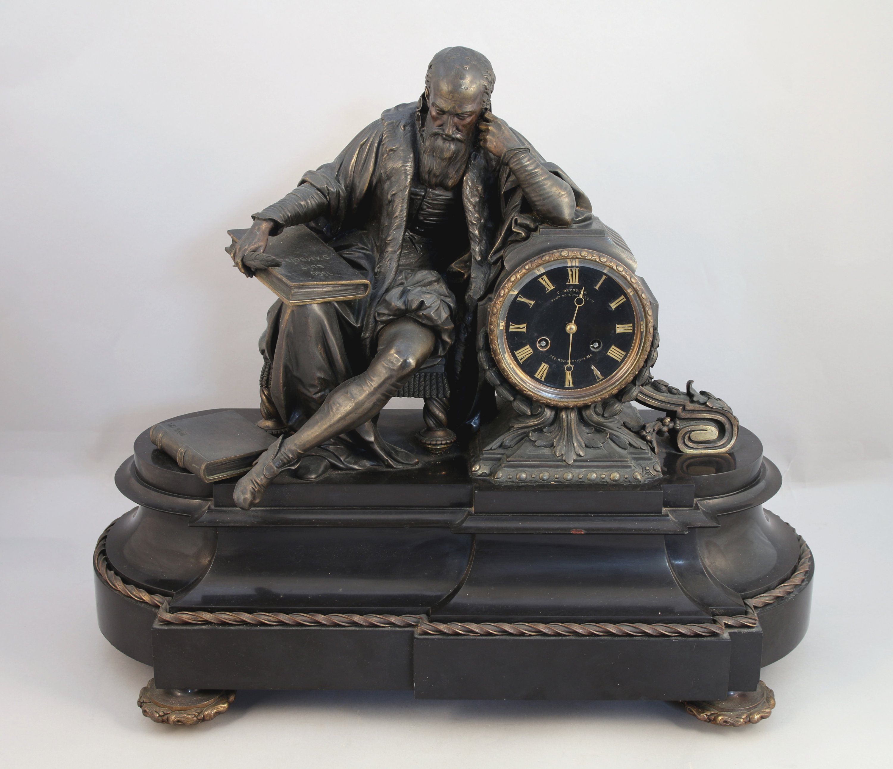 L'élément central dans le lequel s'intègre le cadran signé Destouches, figure Michel de l'Hospital, chancelier du royaume, tenant un livre sur lequel figure l'inscription "Edit d'Amboise 1560". Signé. Les deux autres personnages représentent très probablement Henri Ier de Bourbon, prince de Condé et François Ier de Lorraine, duc de Guise. Base en cavet renversé pour la pendule, et en piédouche pour les personnages, reposant sur quatre pieds galette.