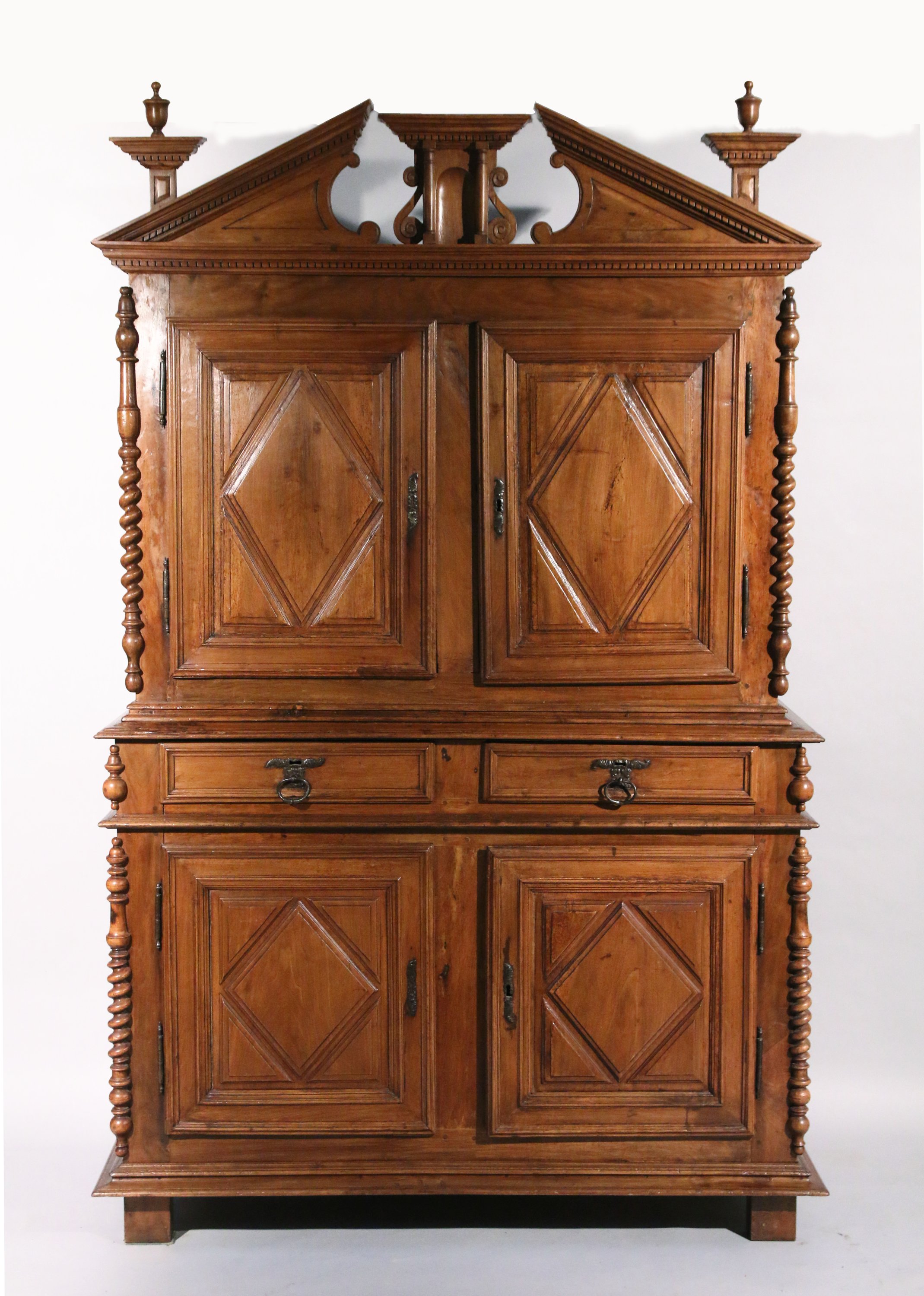 la partie basse ouvre par deux portes sculptées de losanges, et deux tiroirs. La partie haute à deux portes. Le meuble est flanqué de colonnes torses.