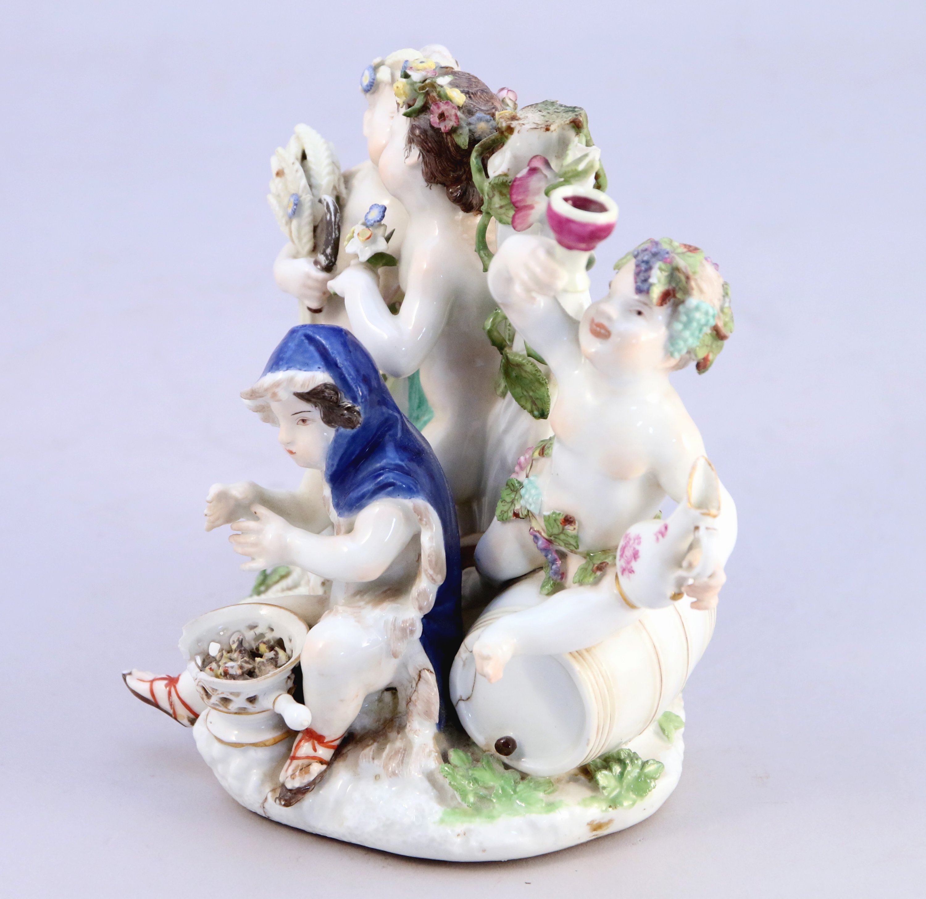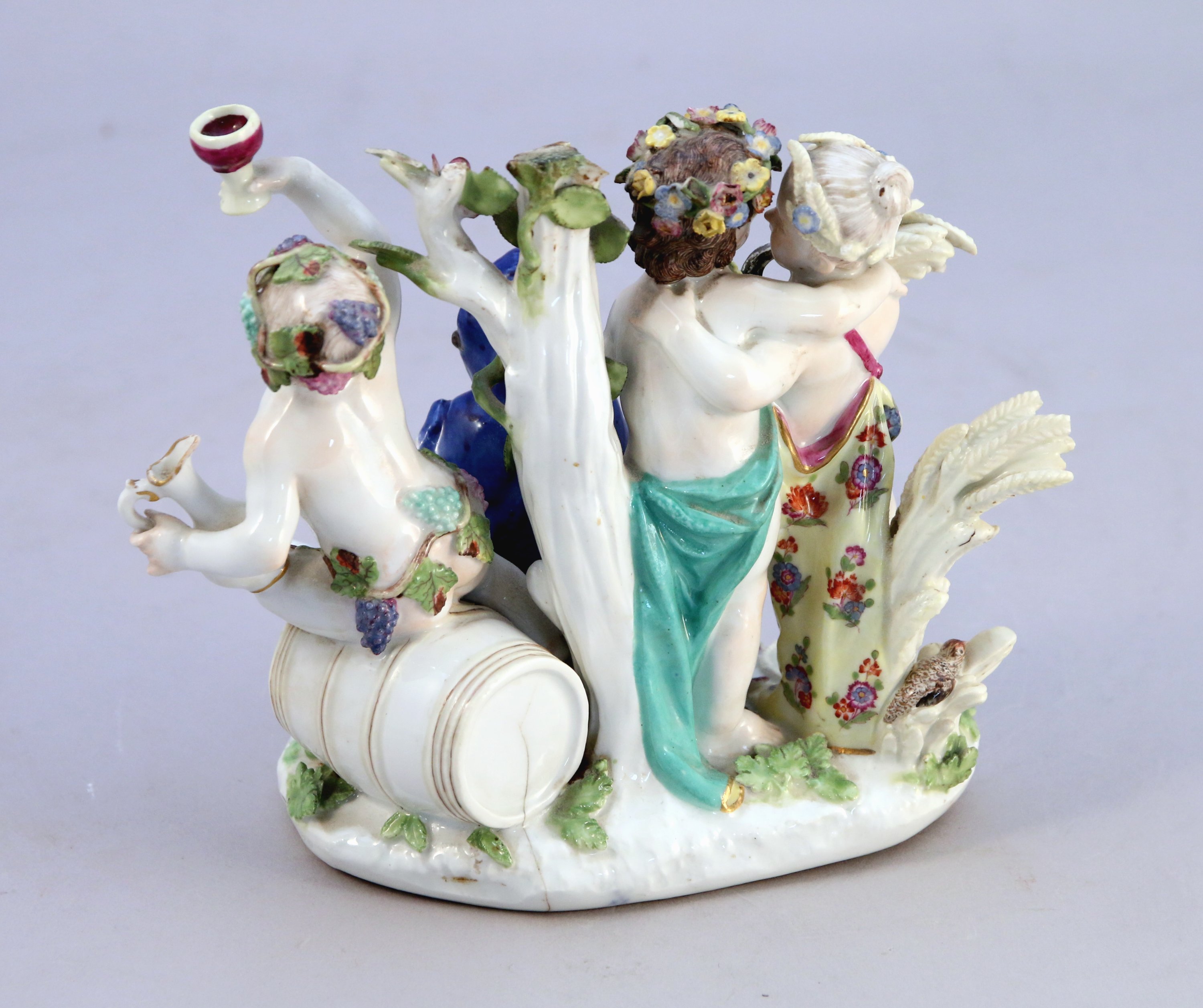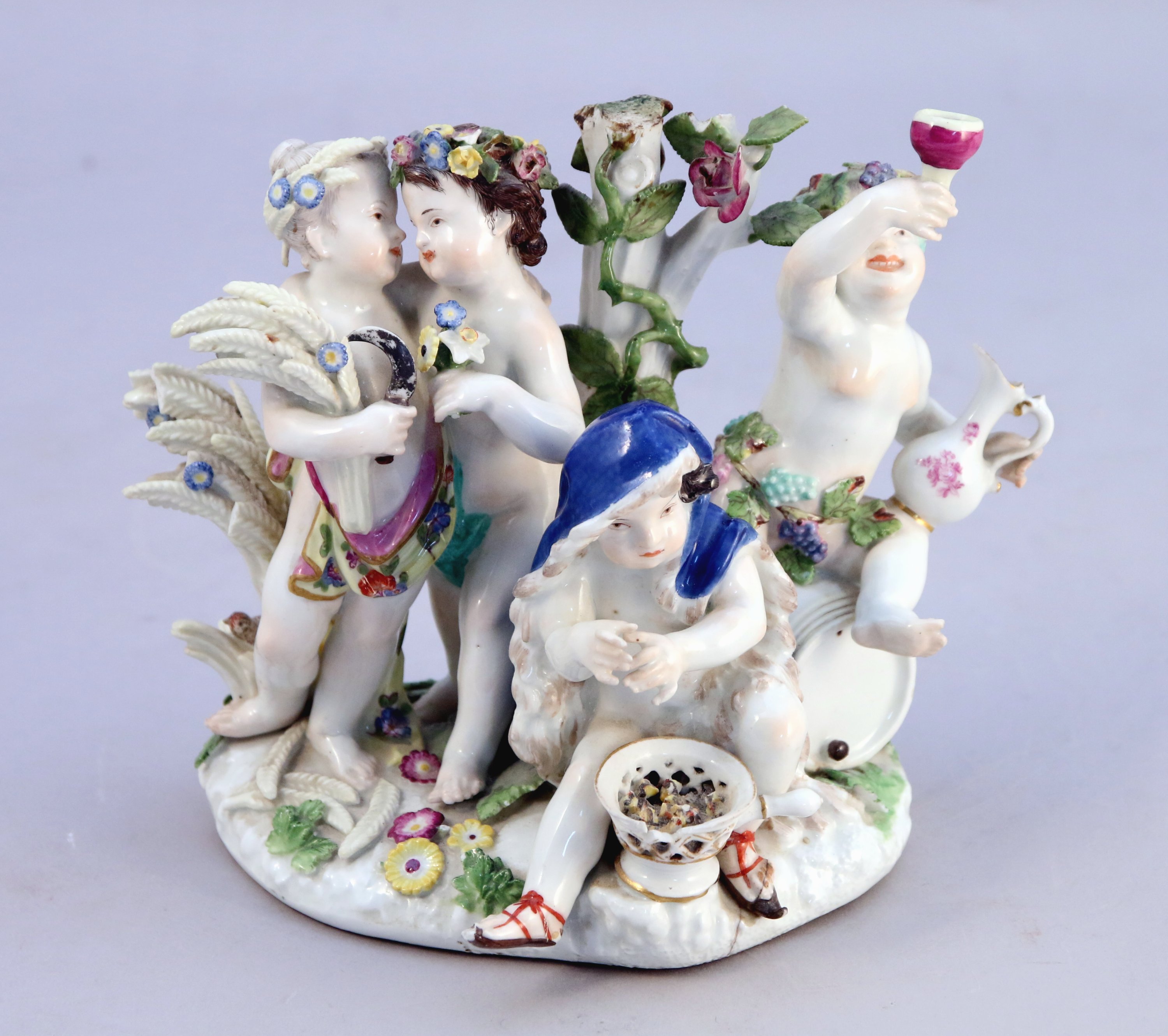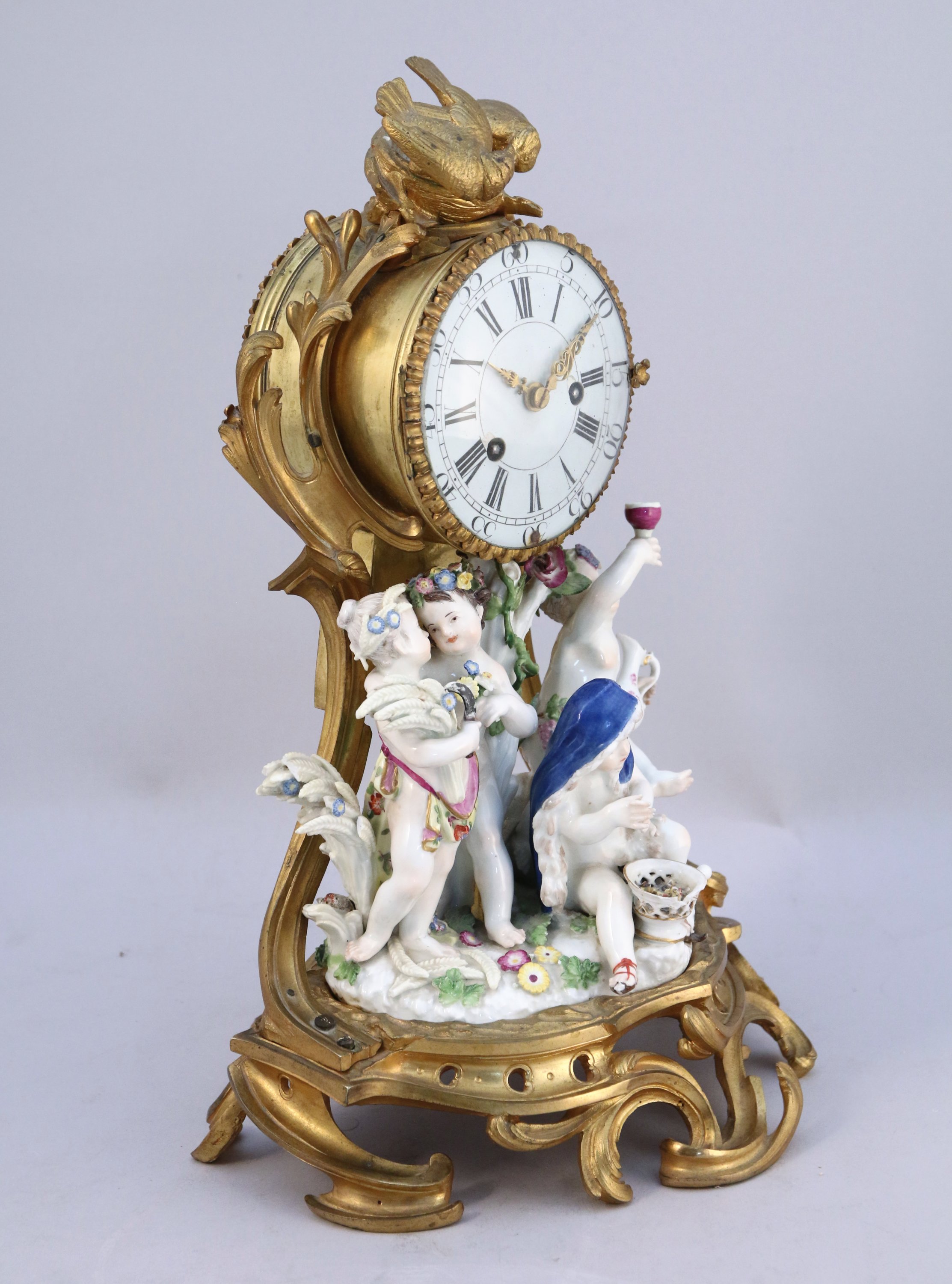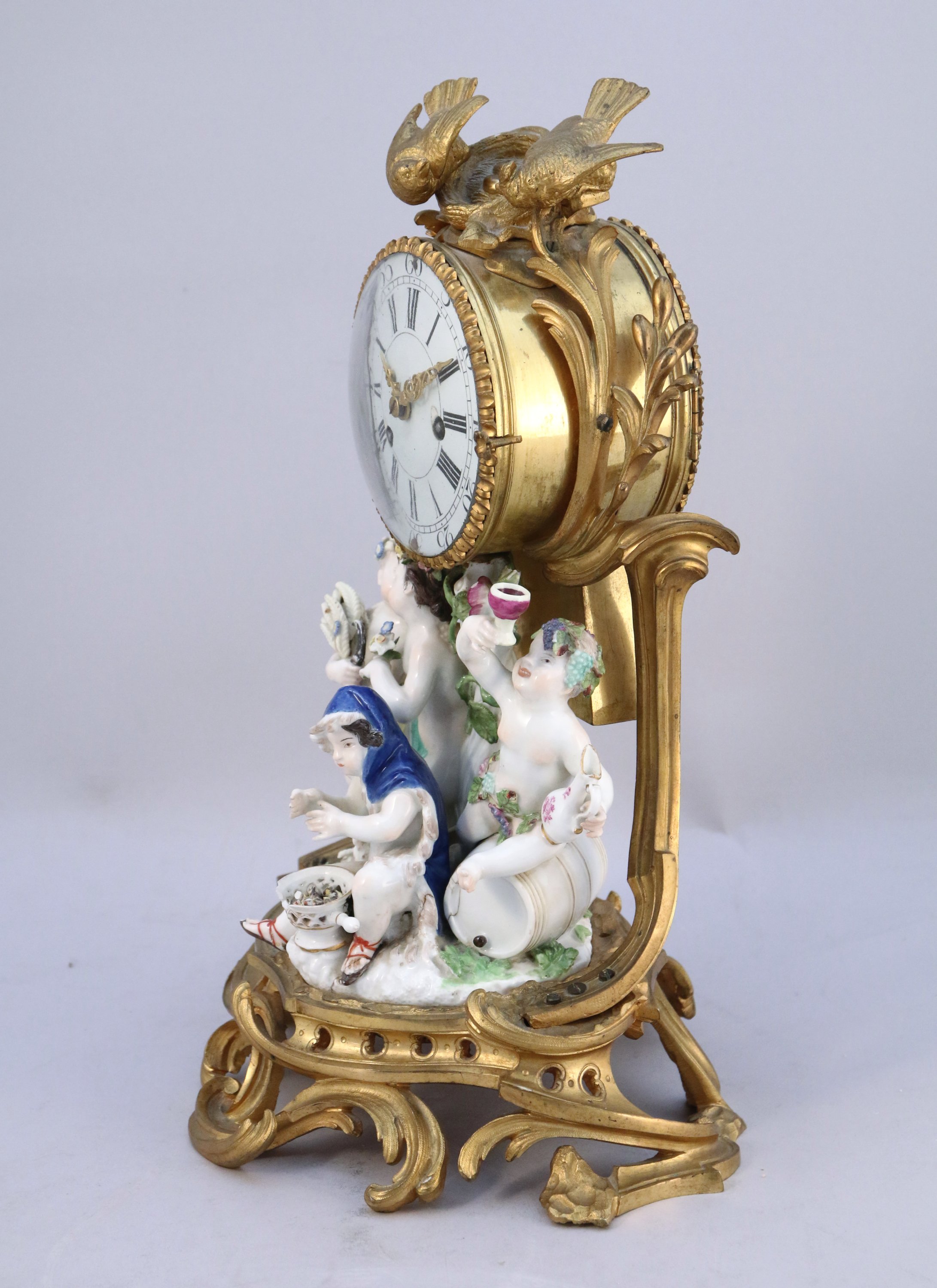 en bronze ciselé et doré, riche décor ajouré de feuilles d'acanthe, enroulements et agrafes feuillagées. Agrémenté au centre d'un groupe en porcelaine de Meissen figurant une allégorie des quatres saisons par des amours