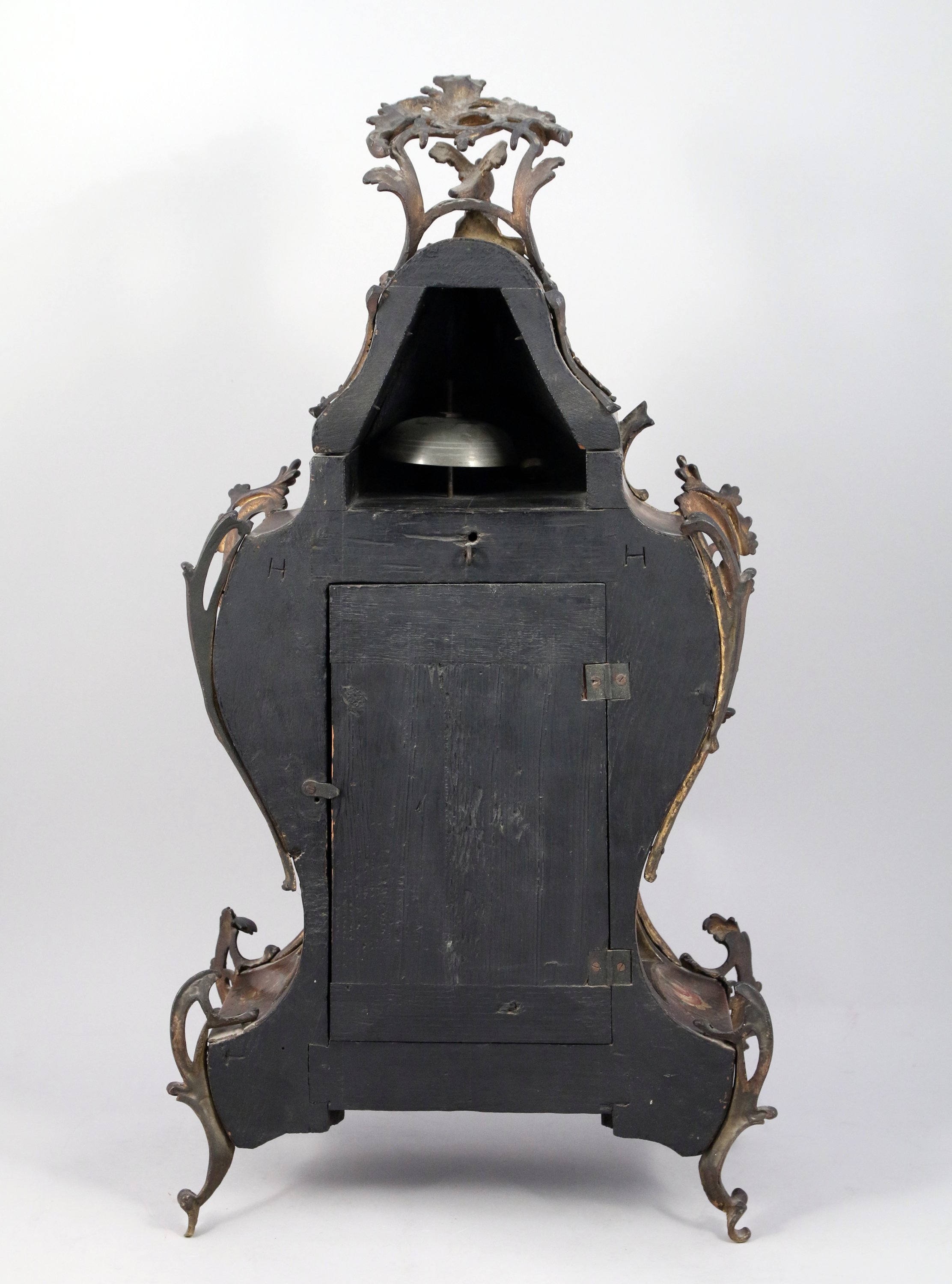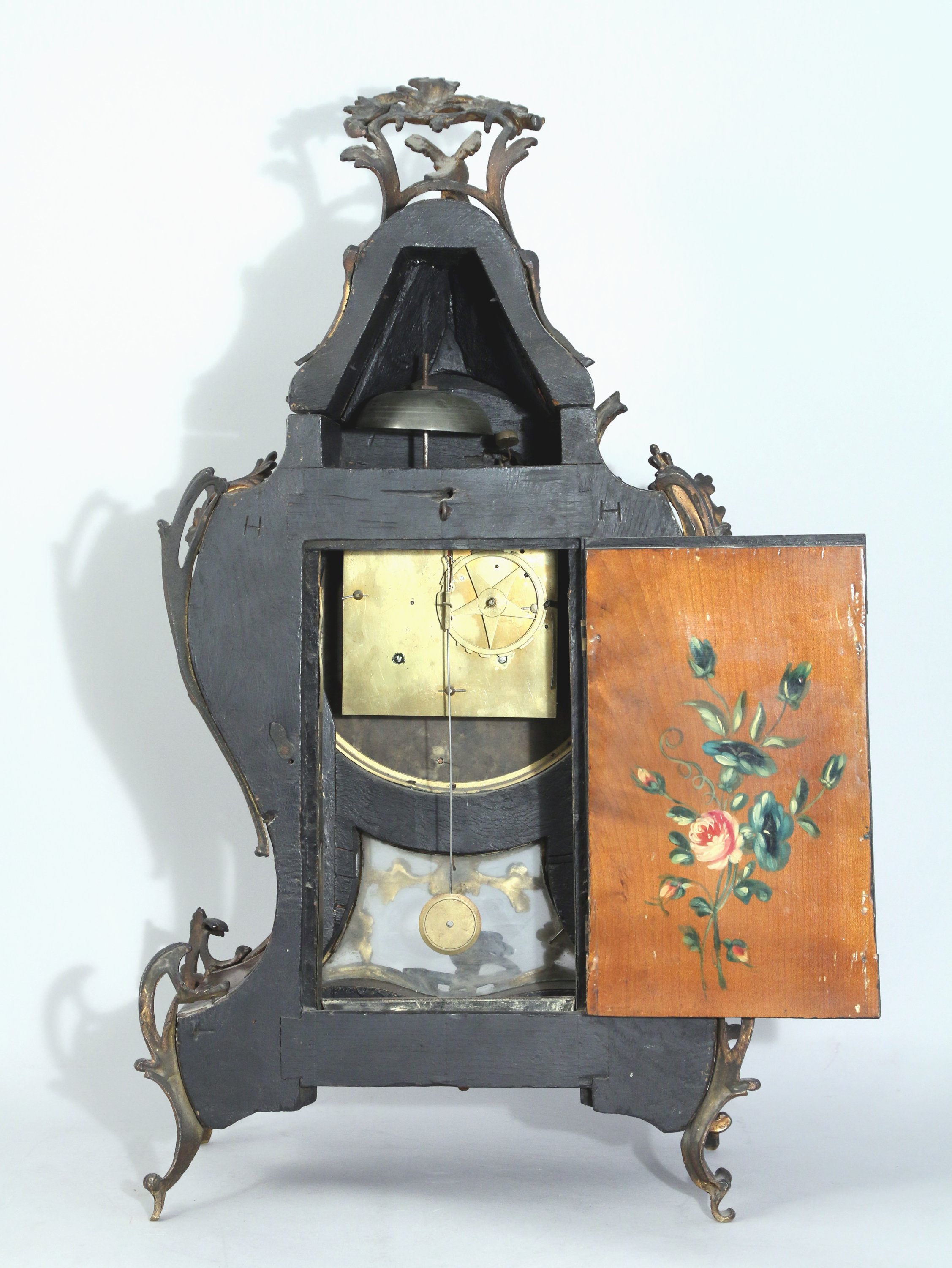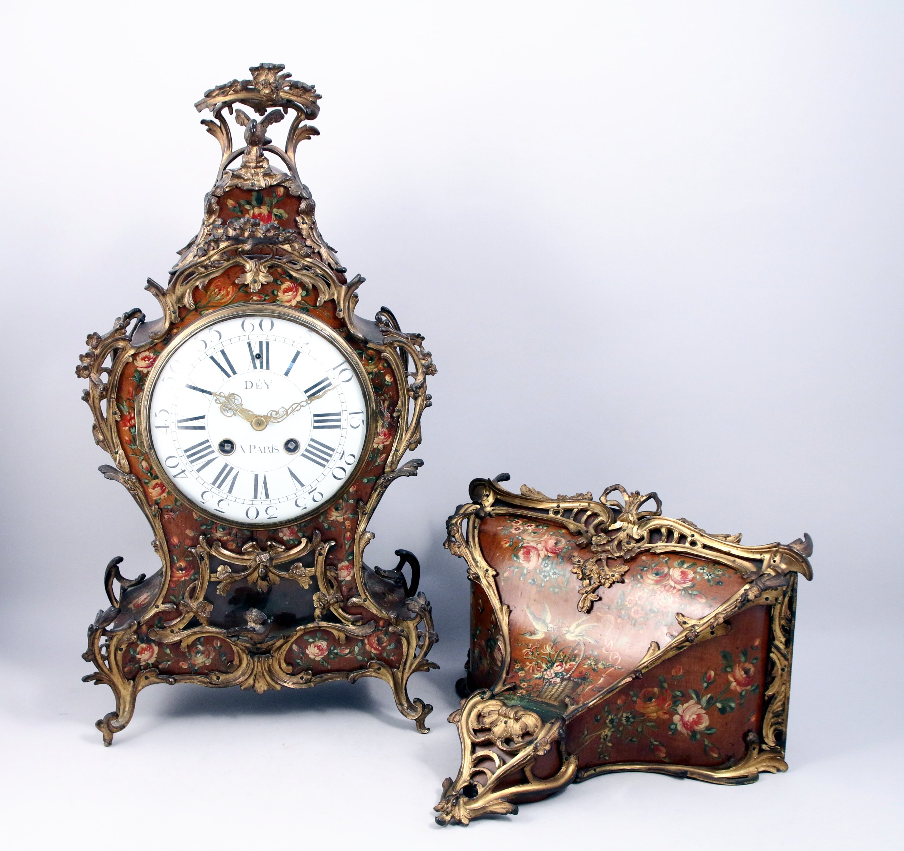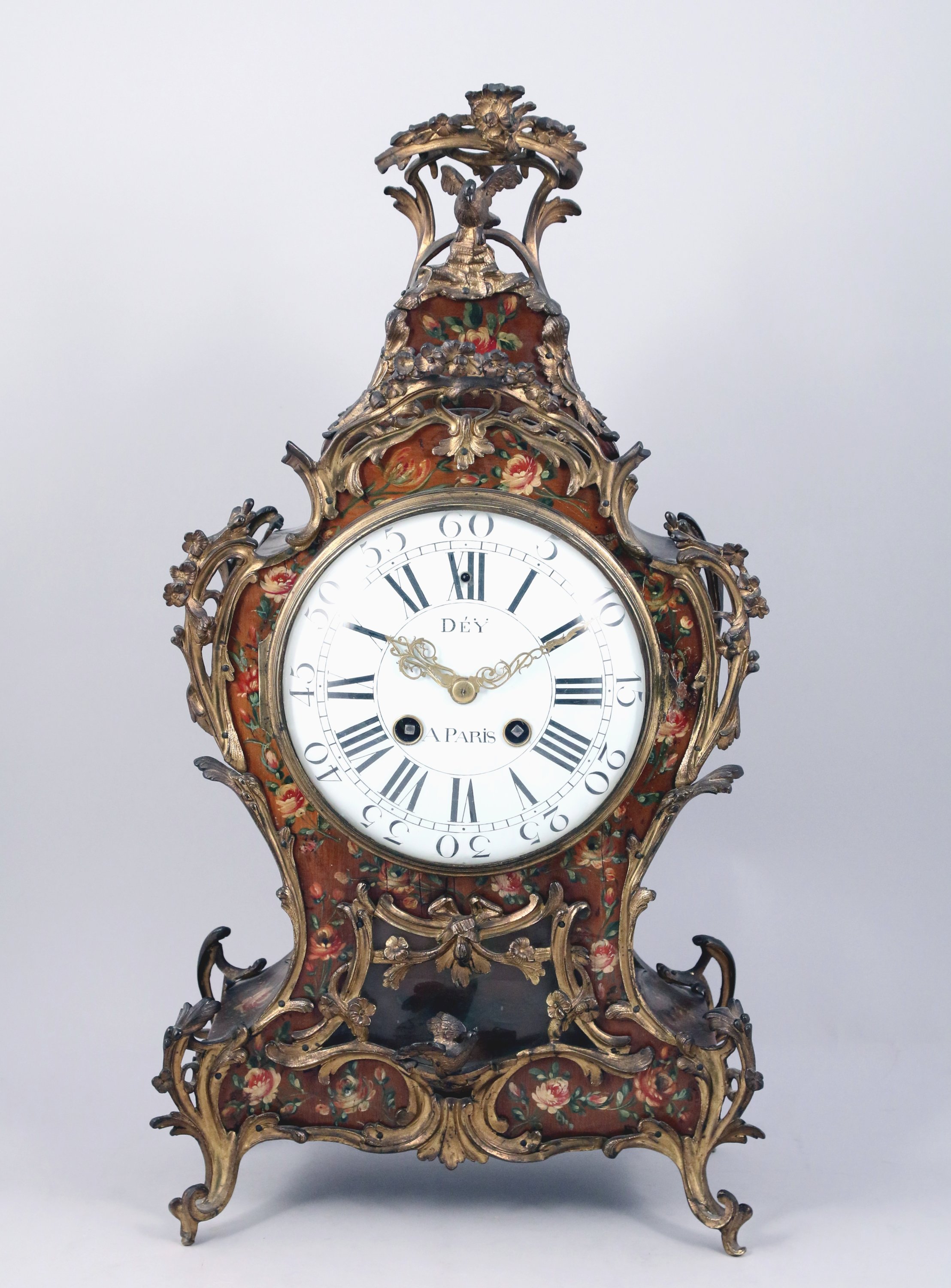 Le cadran émaillé signé "Dey à Paris", les heures indiquées par des chiffres romains et arabes, les minutes par des bâtonnets, les aiguilles en forme de rinceaux. Dey, maître horloger, reçu en 1745.
