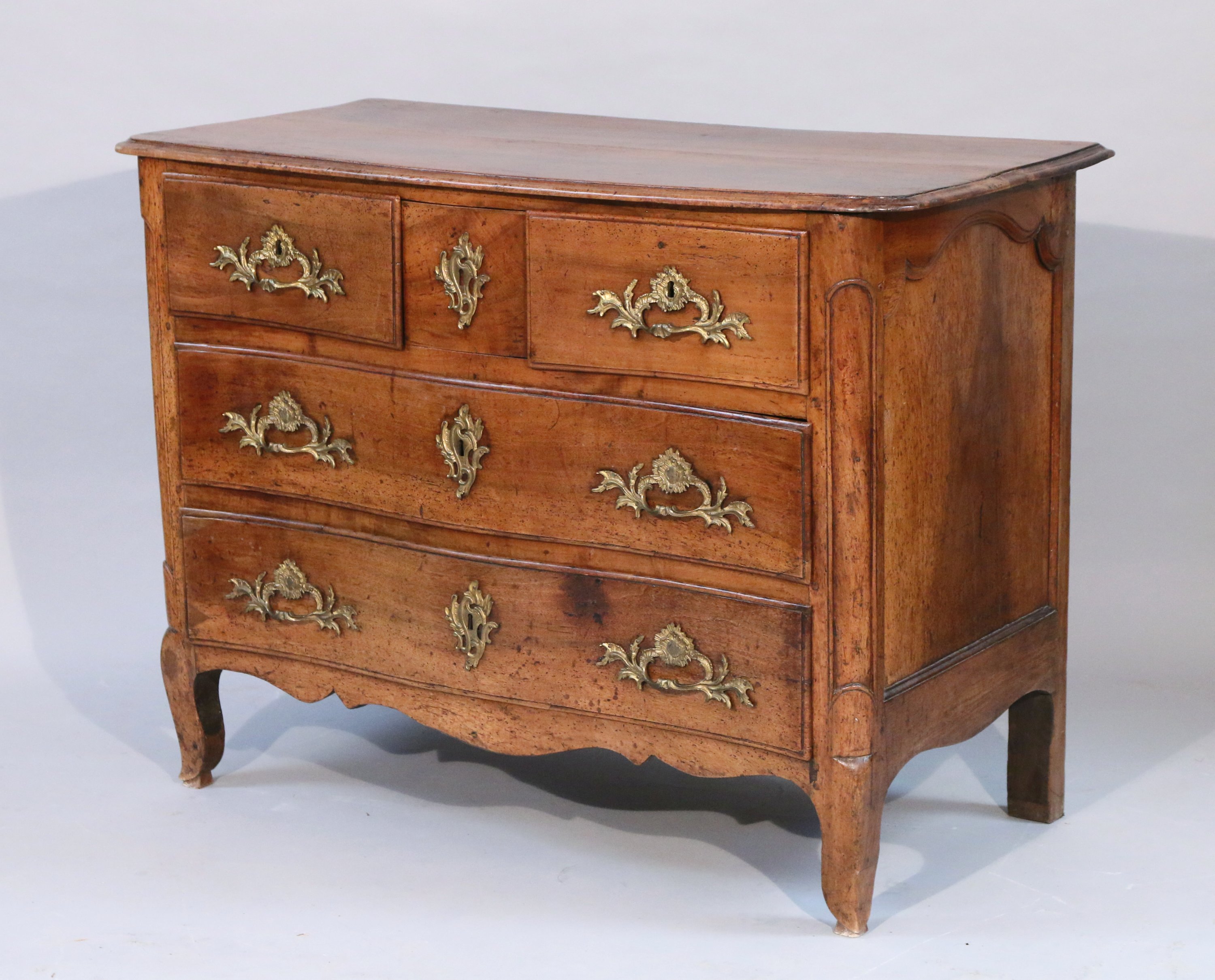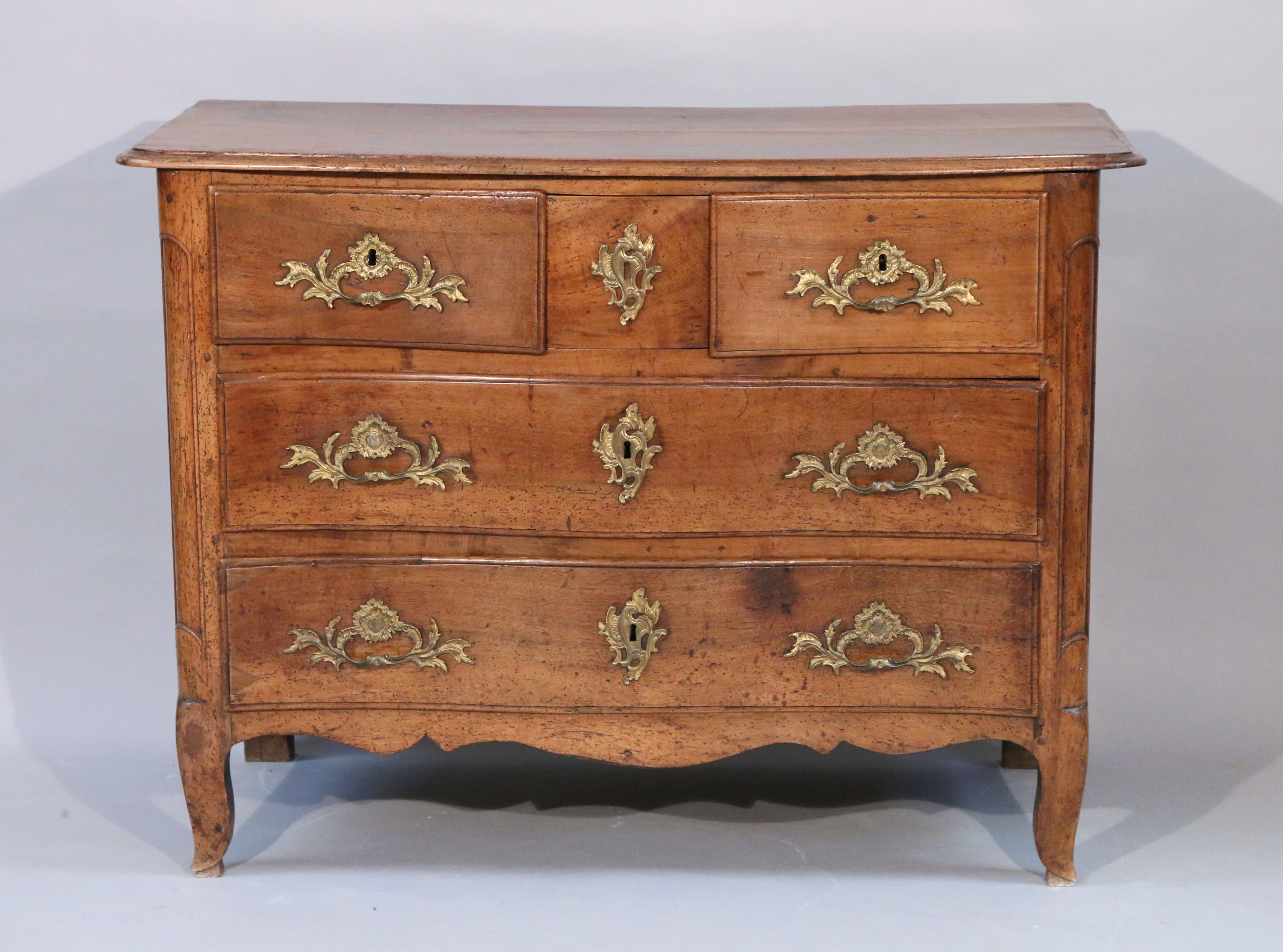 en noyer ouvrant par cinq tiroirs dont un secret sur trois rang à décor mouluré. Reposant sur des pieds antérieurs cambrés et postérieurs droits. Belle garniture rapportée de bronzes dorés comme entrées de serrure et poignées fixes à décor végétal et d'agrafes.