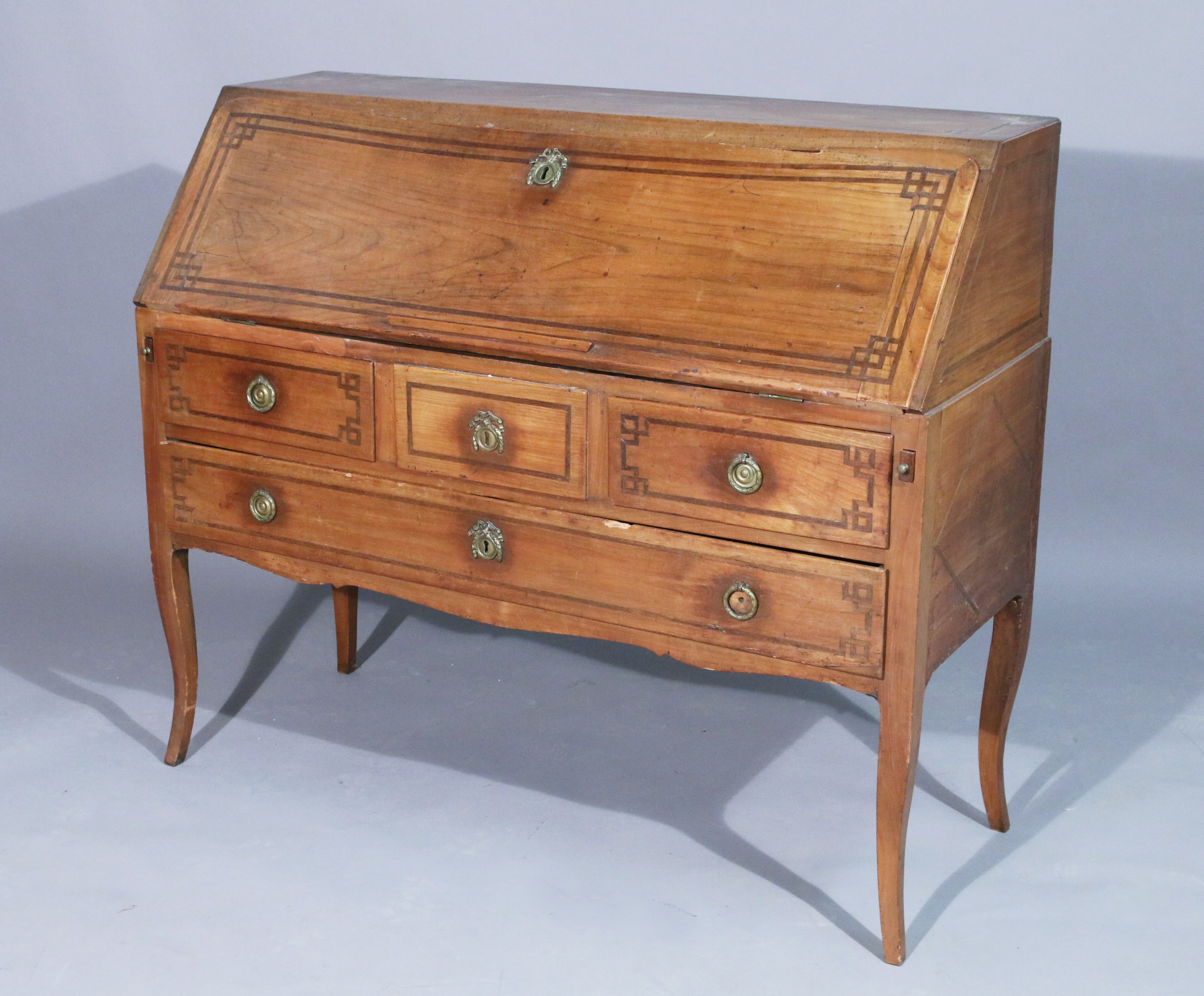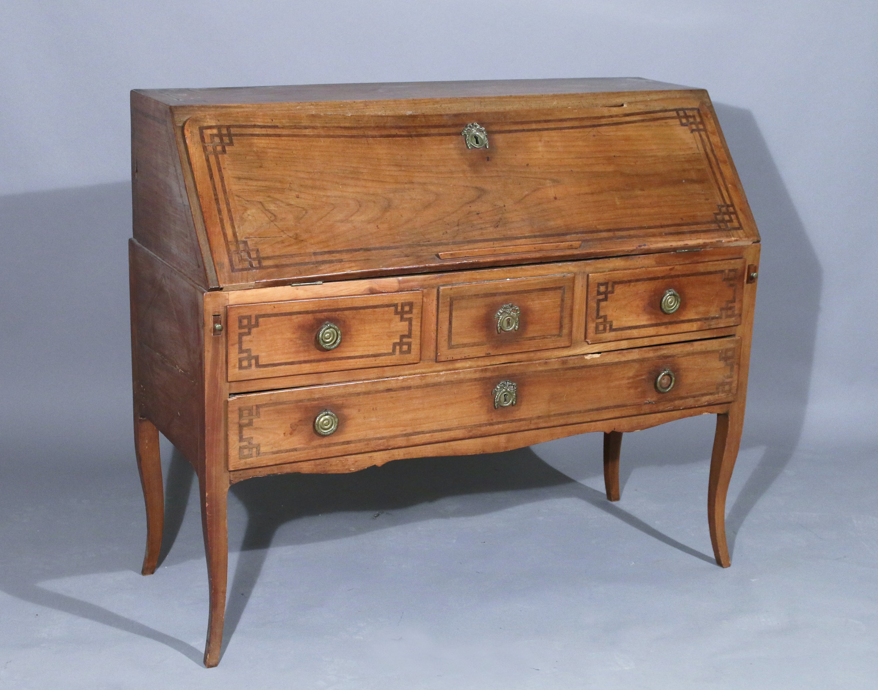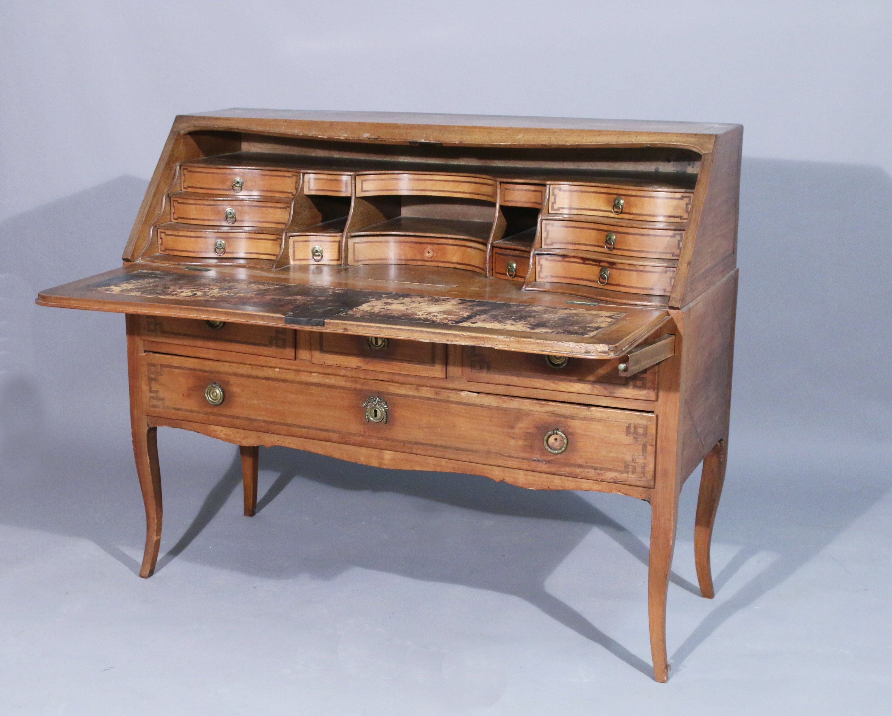 en bois naturel (noyer?), marqueté de motifs géométriques déssiné par des filets de bois plus sombre. Il ouvre par trois tiroirs plus un simulé en ceinture. L'abattant dévoile douze tiroirs sur trois rangs, quatre étagères et un caisson secret. Différents systèmes de loquets permettent de verrouiller ceux du dessous. L'abattant foncé d'un cuir. Anneaux de tirages et entrées de serrures en bronze doré.