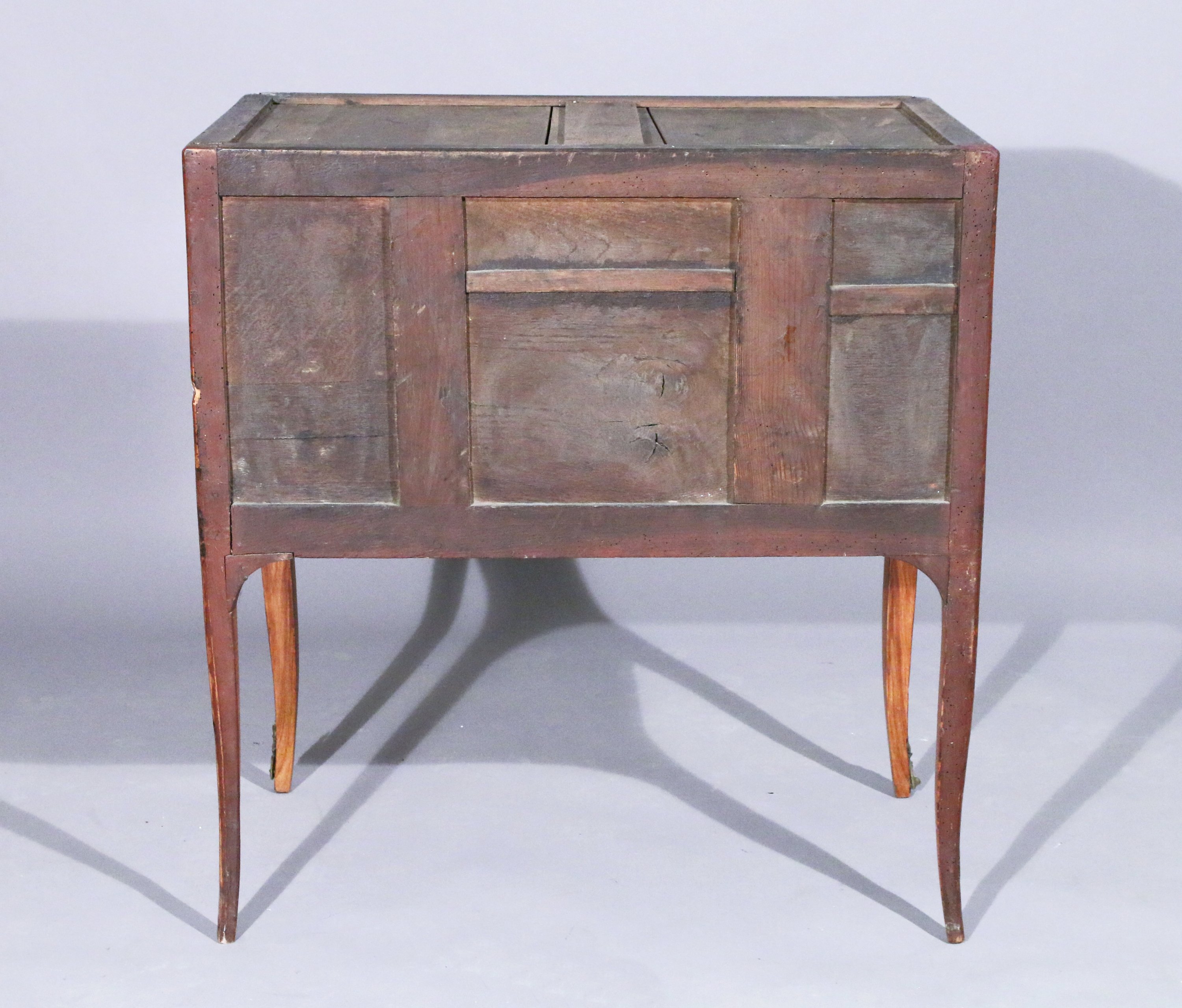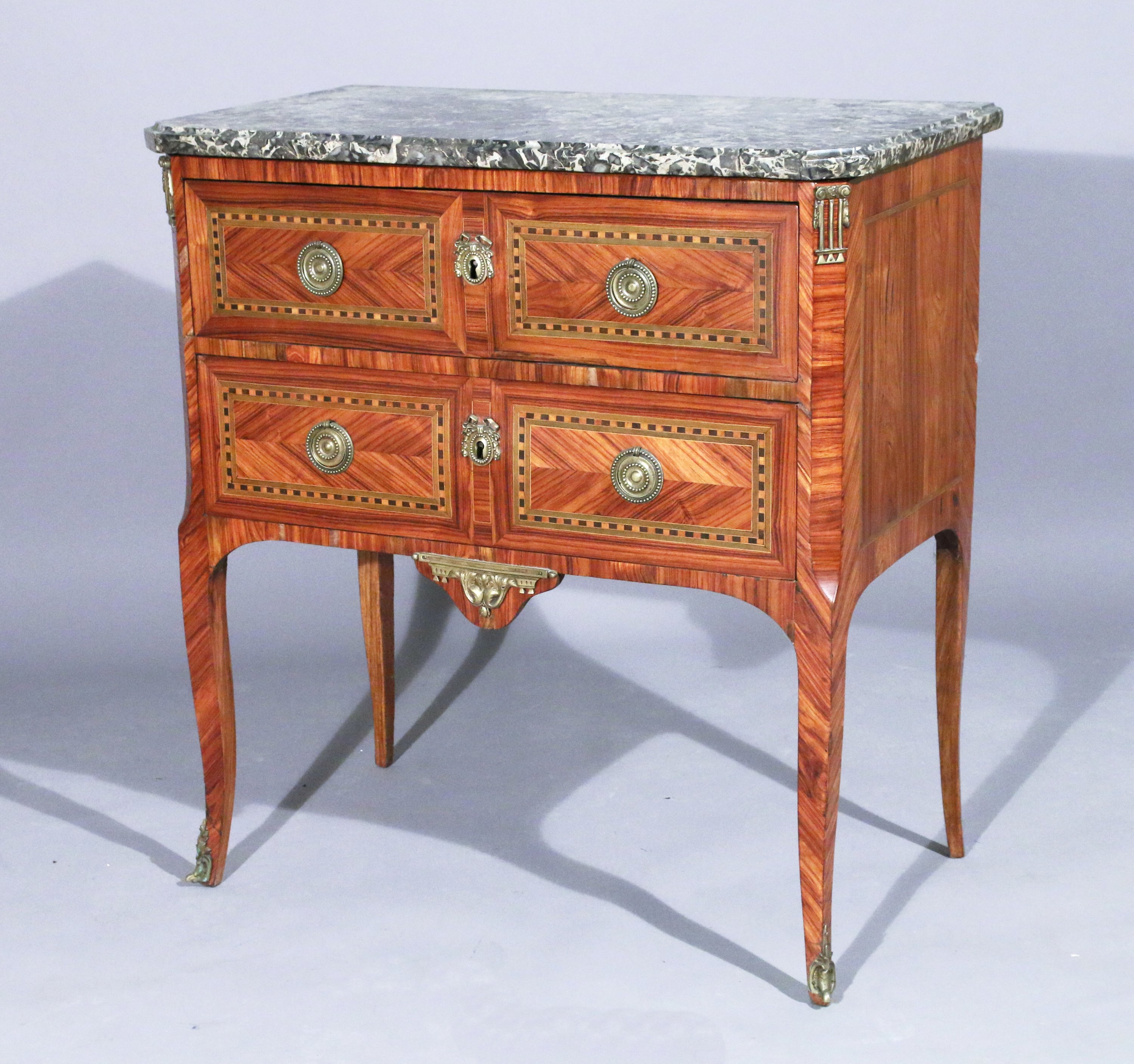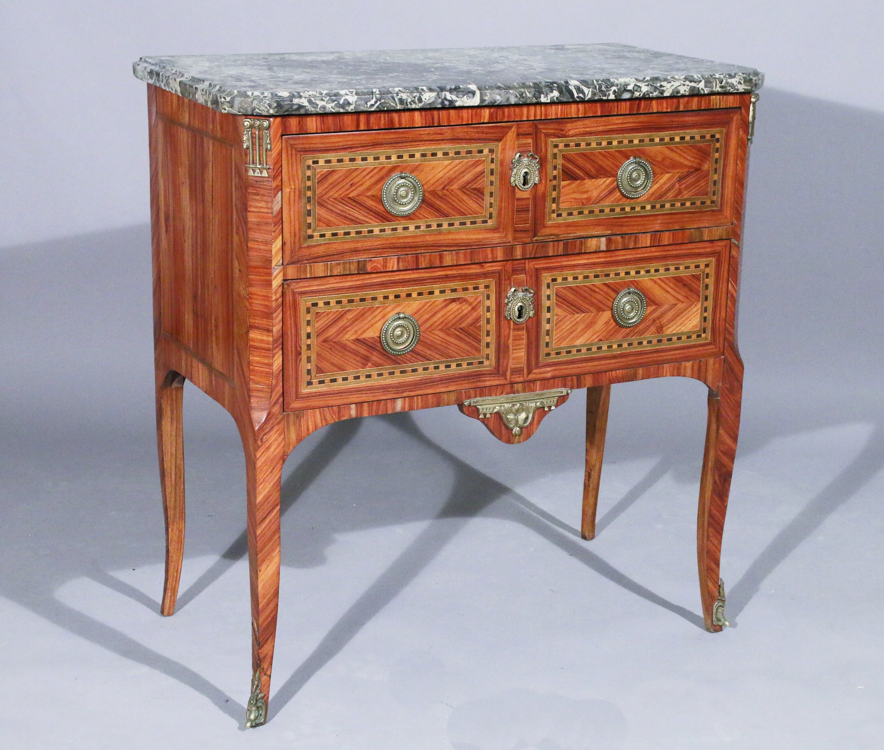 en placage de bois de rose et filets de bois teinté vert et noir, dessinant quatre rectangles clos d'un quadrillages de bois sombre et clair en alternance. Le meuble ouvrant par deux tiroirs sans traverse, repose sur des pieds légèrement galbés. Ornementation d'anneaux de tirage, entrées de serrures, chutes d'angles, et cul de lampe et sabots en bronze doré.