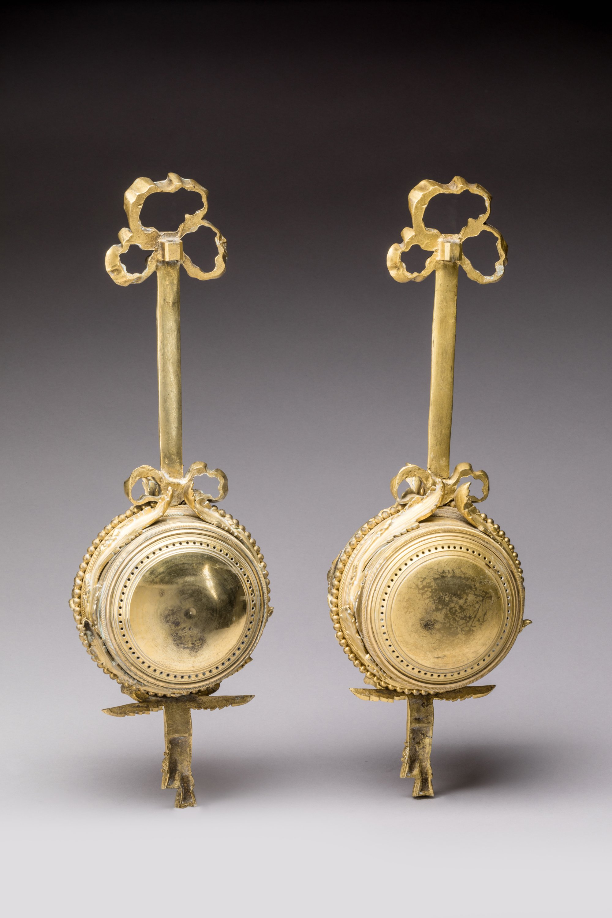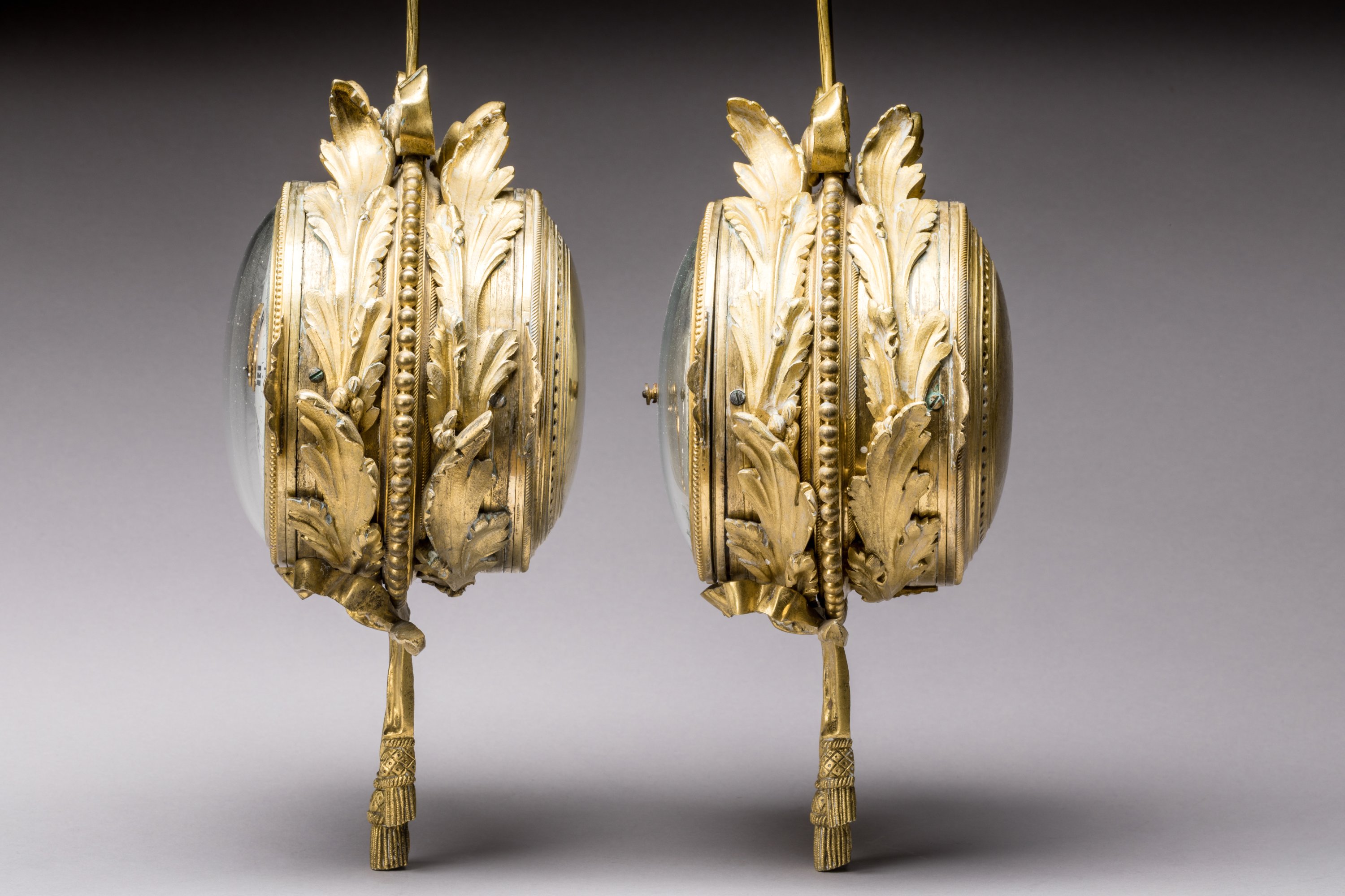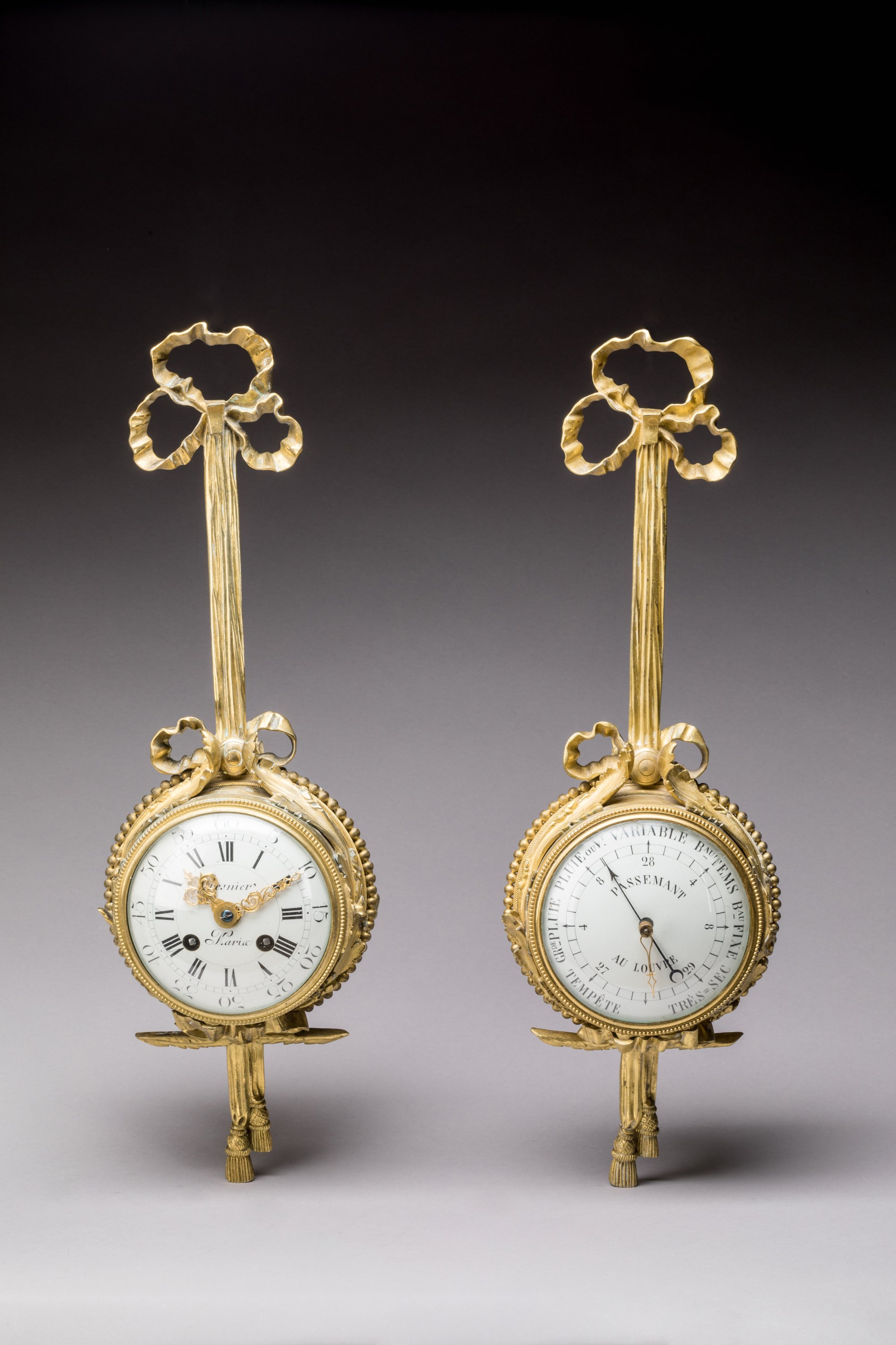 en bronze doré, de forme circulaire, suspendus par un ruban noué et terminés par des franges, dans un entourage de feuilles d'acanthe et rang de perle. Les cadrans émaillés, avec pour le baromètre signé de "Passemant au Louvre" des chiffres arabes et pour l'horloge signée de "Crosnier à Paris" des chiffres romains pour les heures, chaque période de cinq minutes en chiffres arabes et graduée pour les minutes.