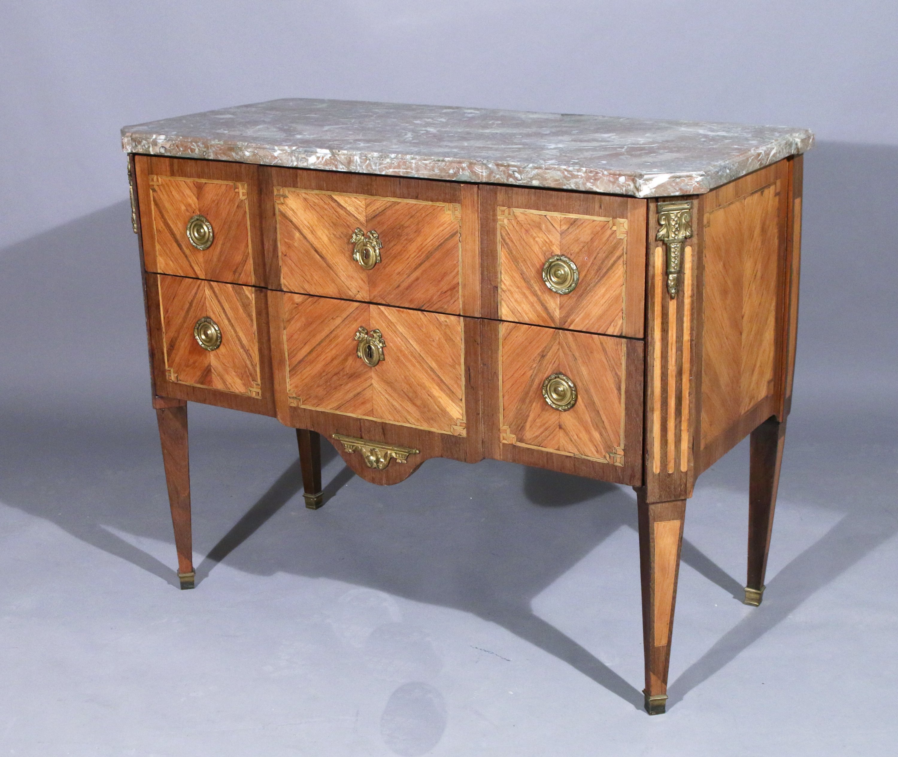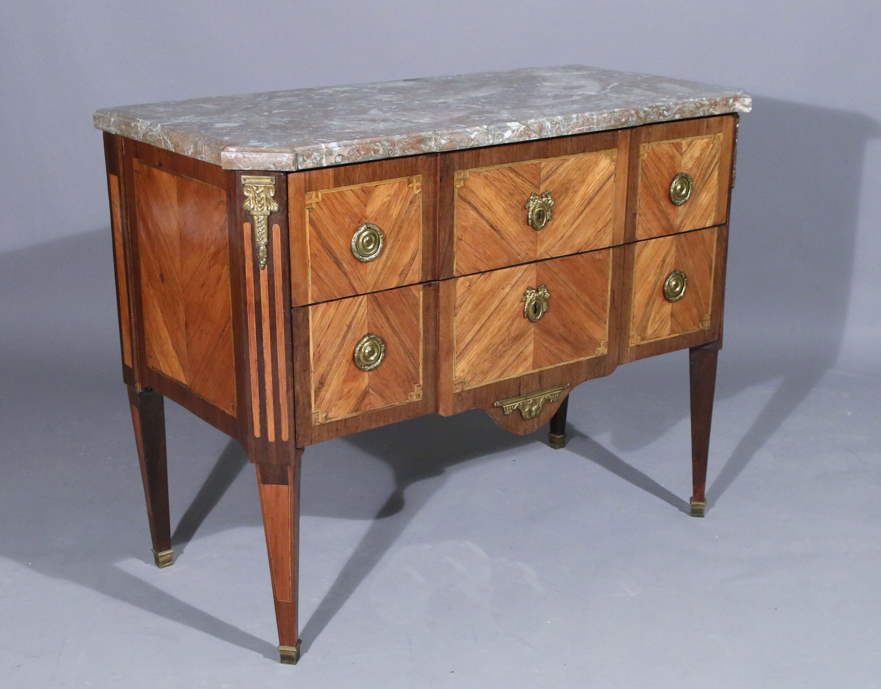 ouvrant par deux tiroirs sans traverse en placage de bois de rose et filets de bois teinté vert. La façade en léger ressaut, est flanquée de deux montants à pans simulant des cannelures en incrustation de bois clair. Elle est ornée d'anneaux de tirages, entrées de serrures, cul de lampe et chutes d'angles et sabots en bronze doré.
