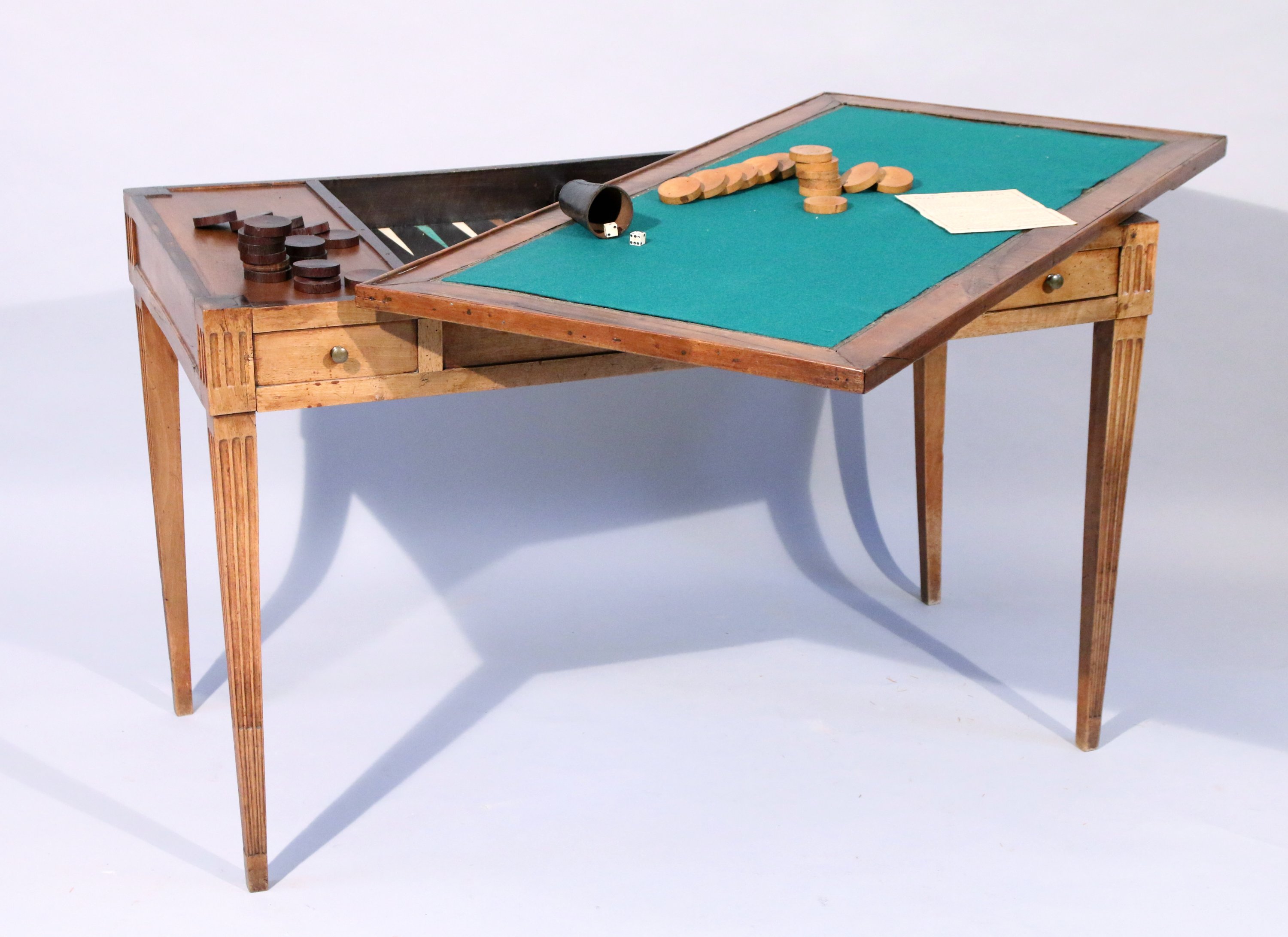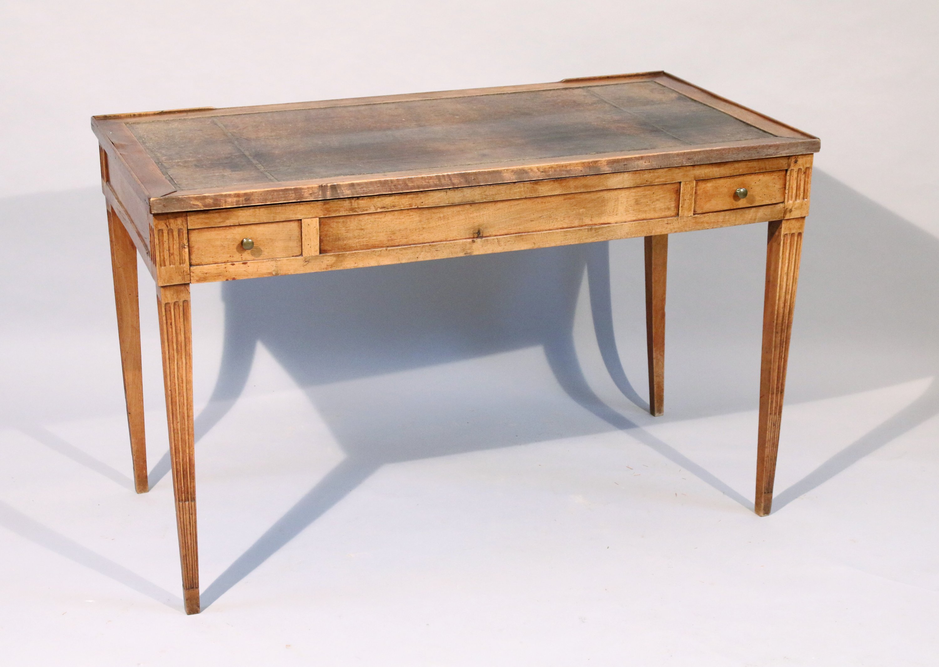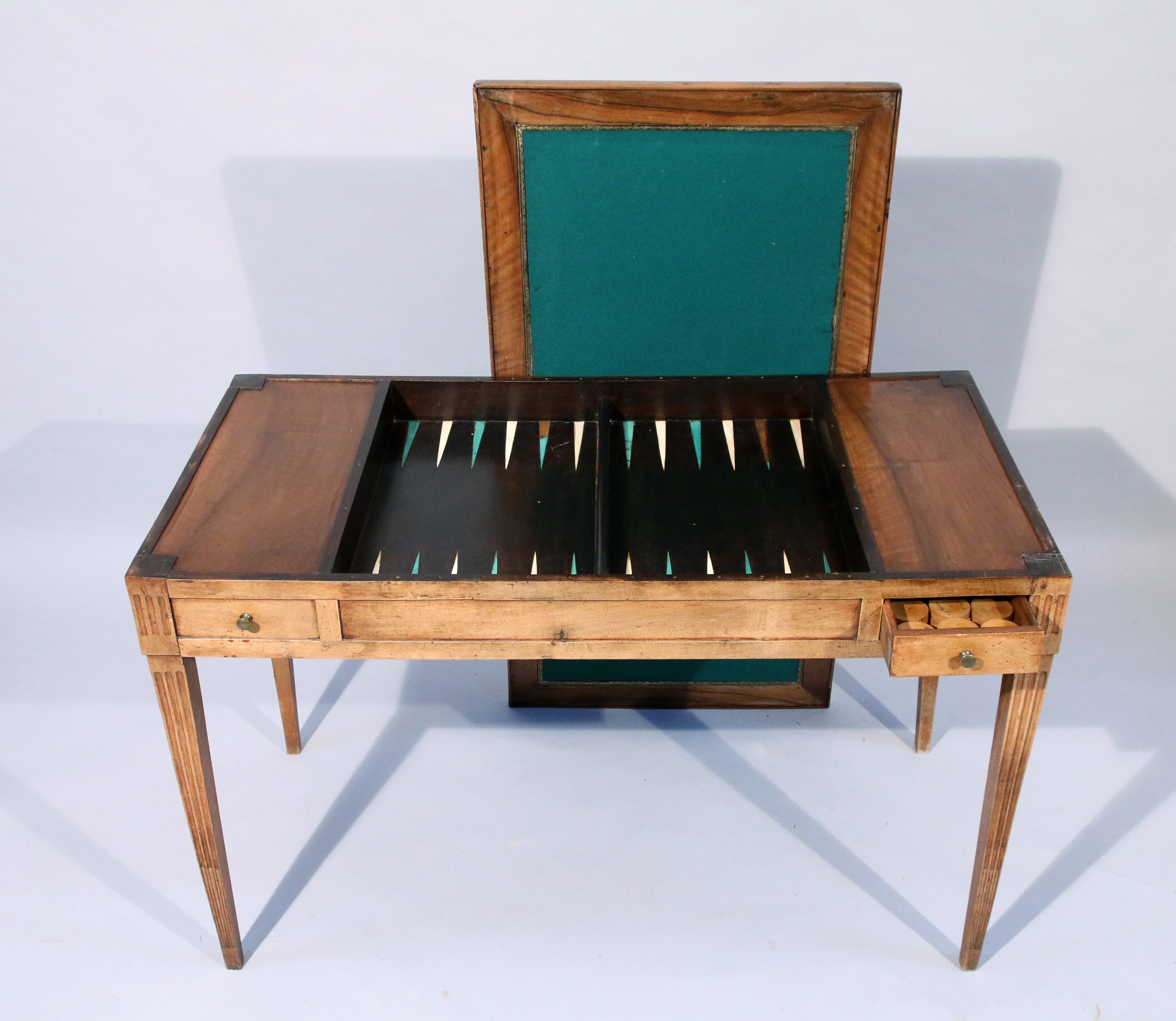 de forme rectangulaire en acajou et placage d'acajou. Plateau mobile gainé de cuir sur une face et recouvert sur l'autre face d'un feutre vert. Il découvre un intérieur à index plaqué d'ébène, os et os teinté vert. Ceinture à décrochement ouvrant à deux tiroirs sur deux faces. Elle repose sur quatre pieds fuselés et cannelés.