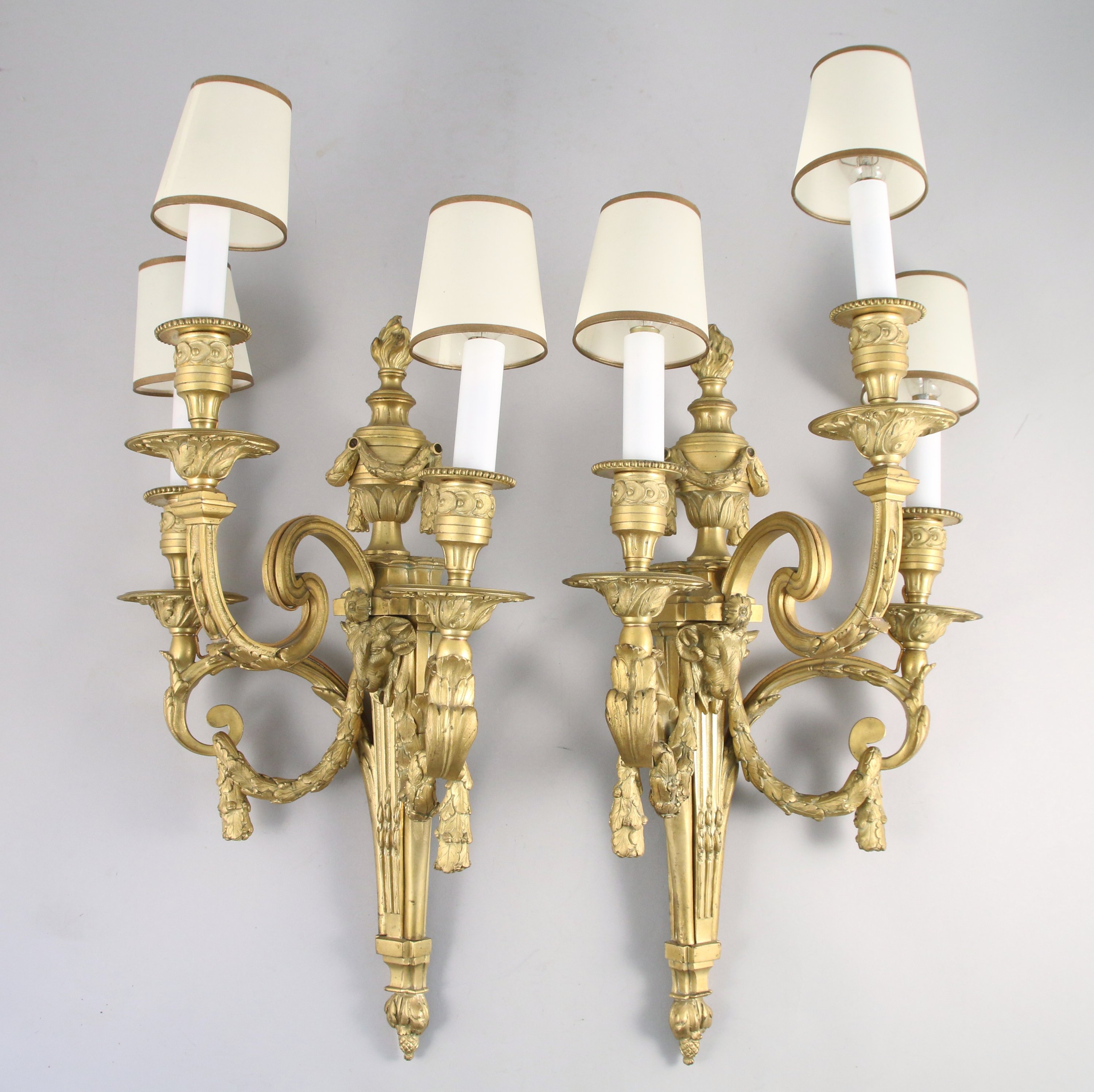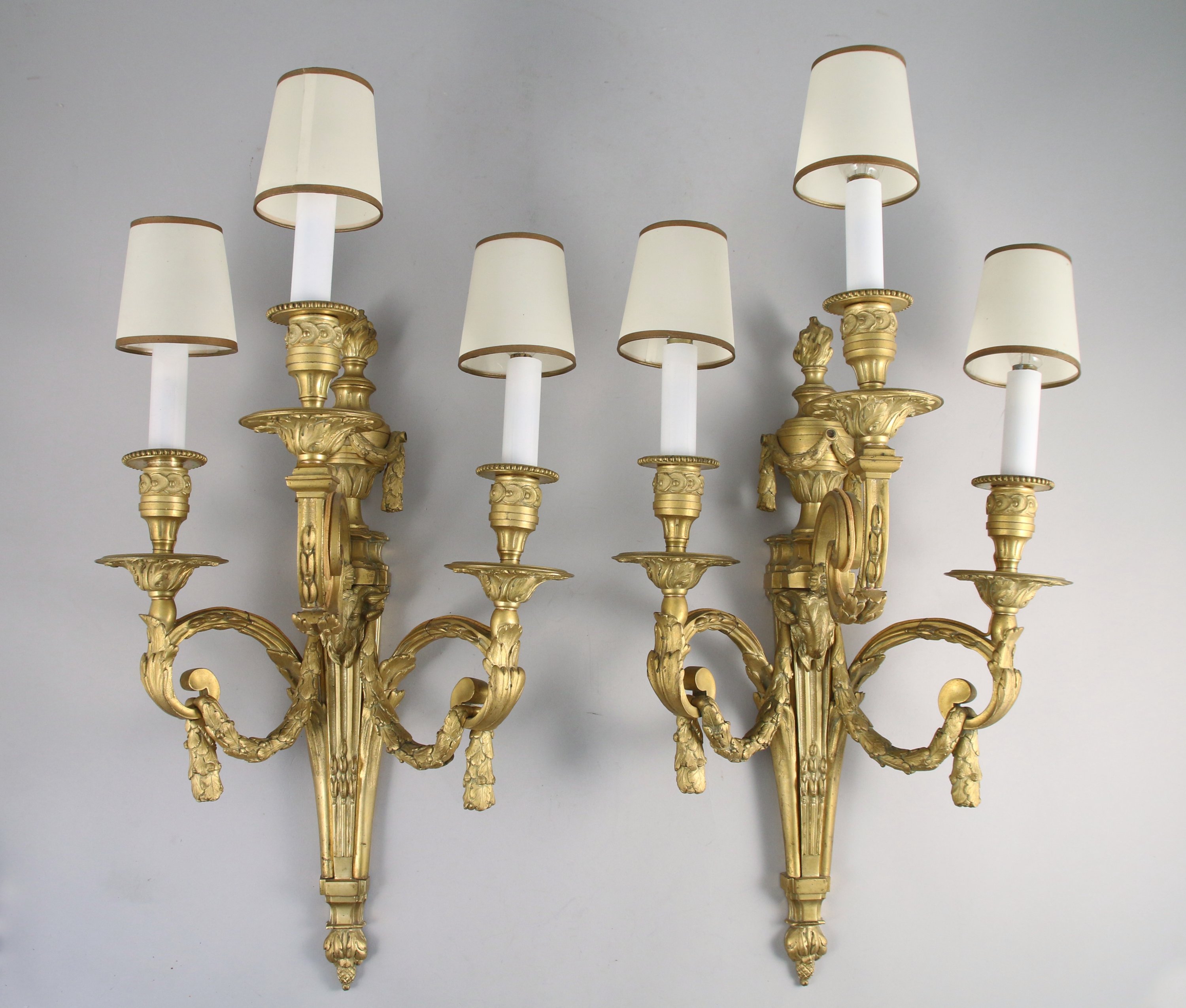 à trois bras de lumières en bronze ciselé et doré. Bras de lumière à décor de feuilles dacanthe, soutenant des guirlandes de feuilles de chênes encadrant une tête de bélier. Montant en gaine cannelée à asperges, surmonté dun pot à feu. Binet à décor de guillochis, bobèches à bagues perlées.