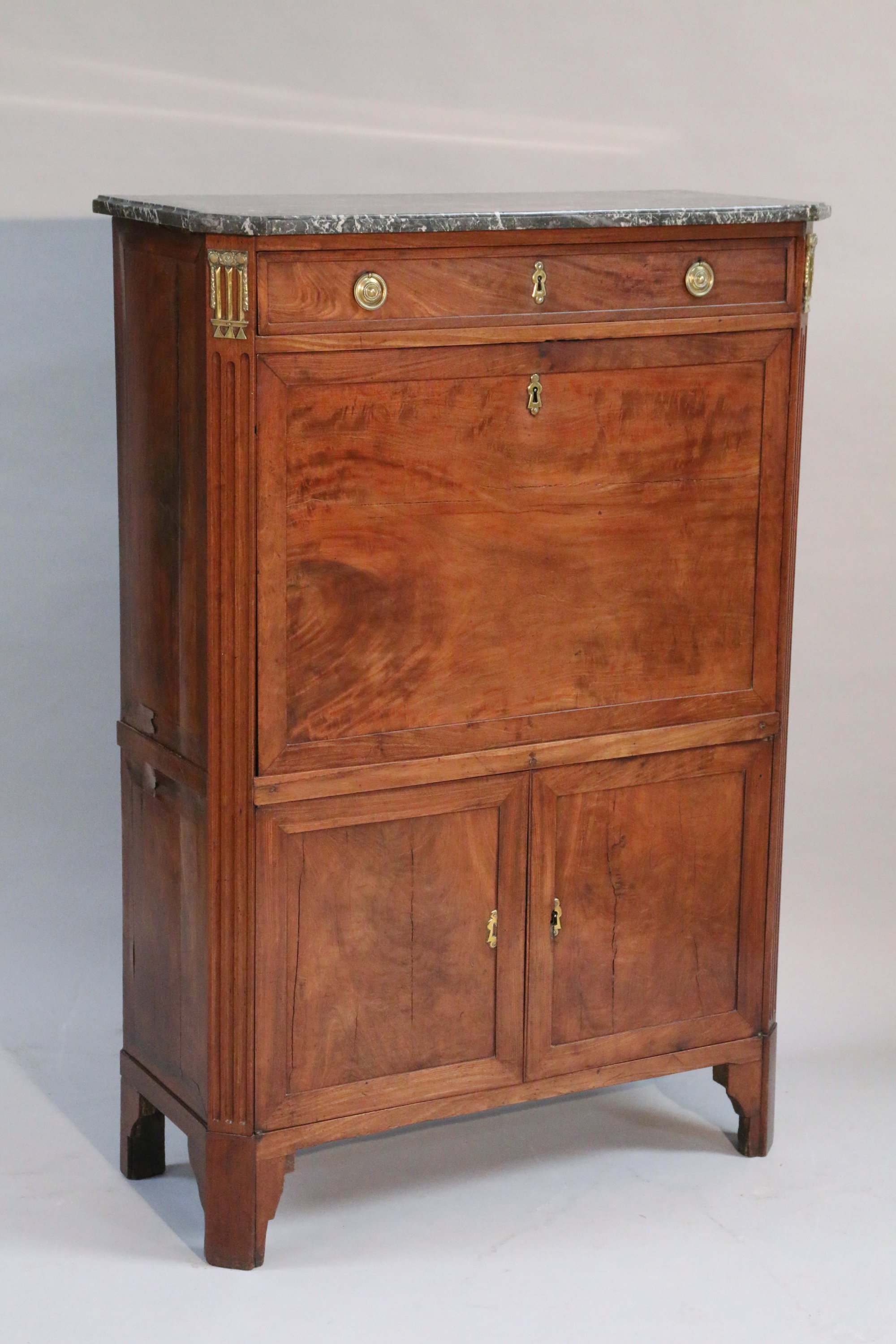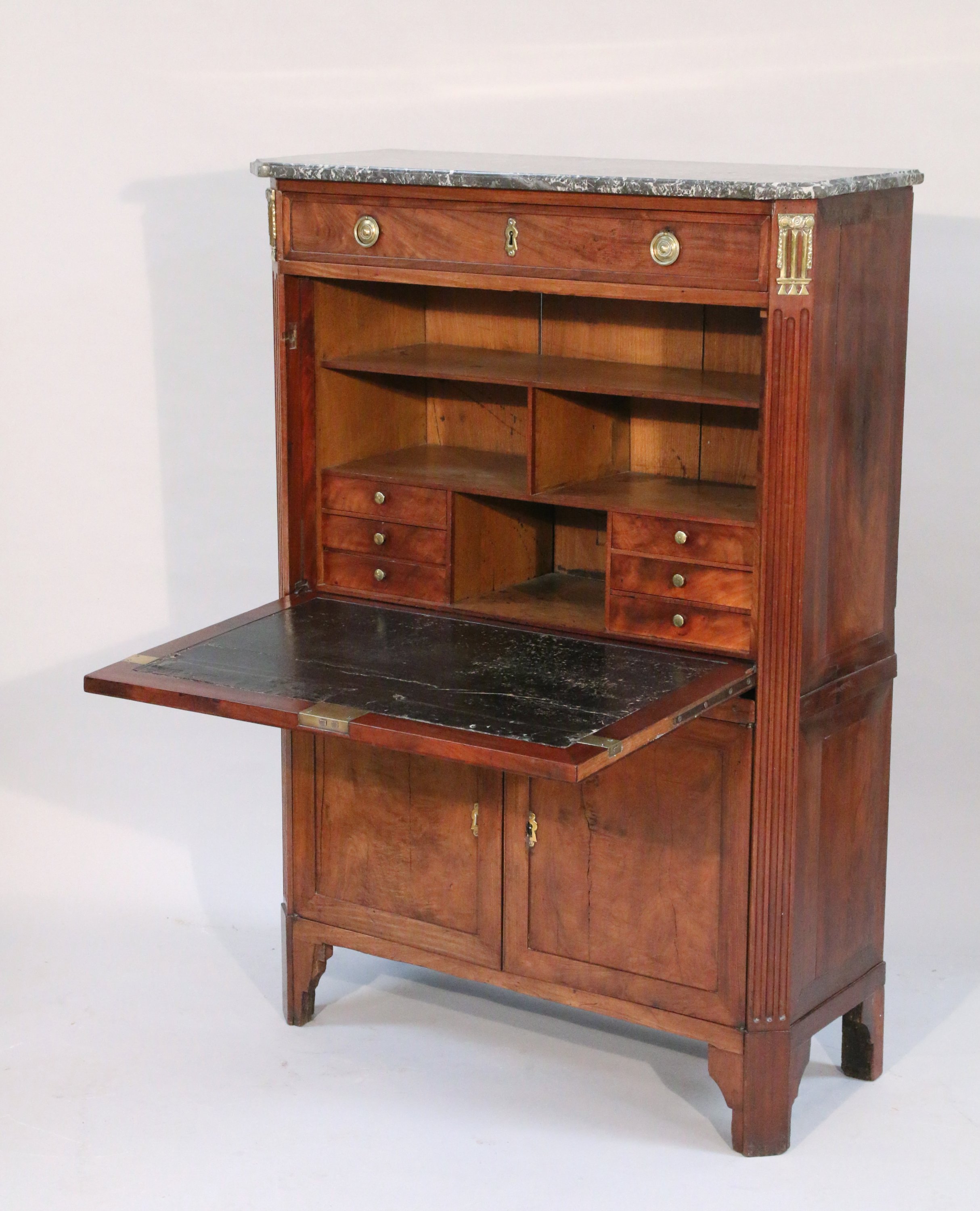 à pans coupés en placage d'acajou. Il ouvre à un tiroir et un abattant découvrant un "castin" en acajou à six tiroirs et caissons. En partie basse, il ouvre à deux vantaux découvrant deux compartiments, dont un à une façade en abattant. Garni de chutes à motif de gouttes et tors de laurier. Anneaux de tirages aux lauriers et entrées de serrures en bronze. Dessus de marbre gris veiné de blanc.