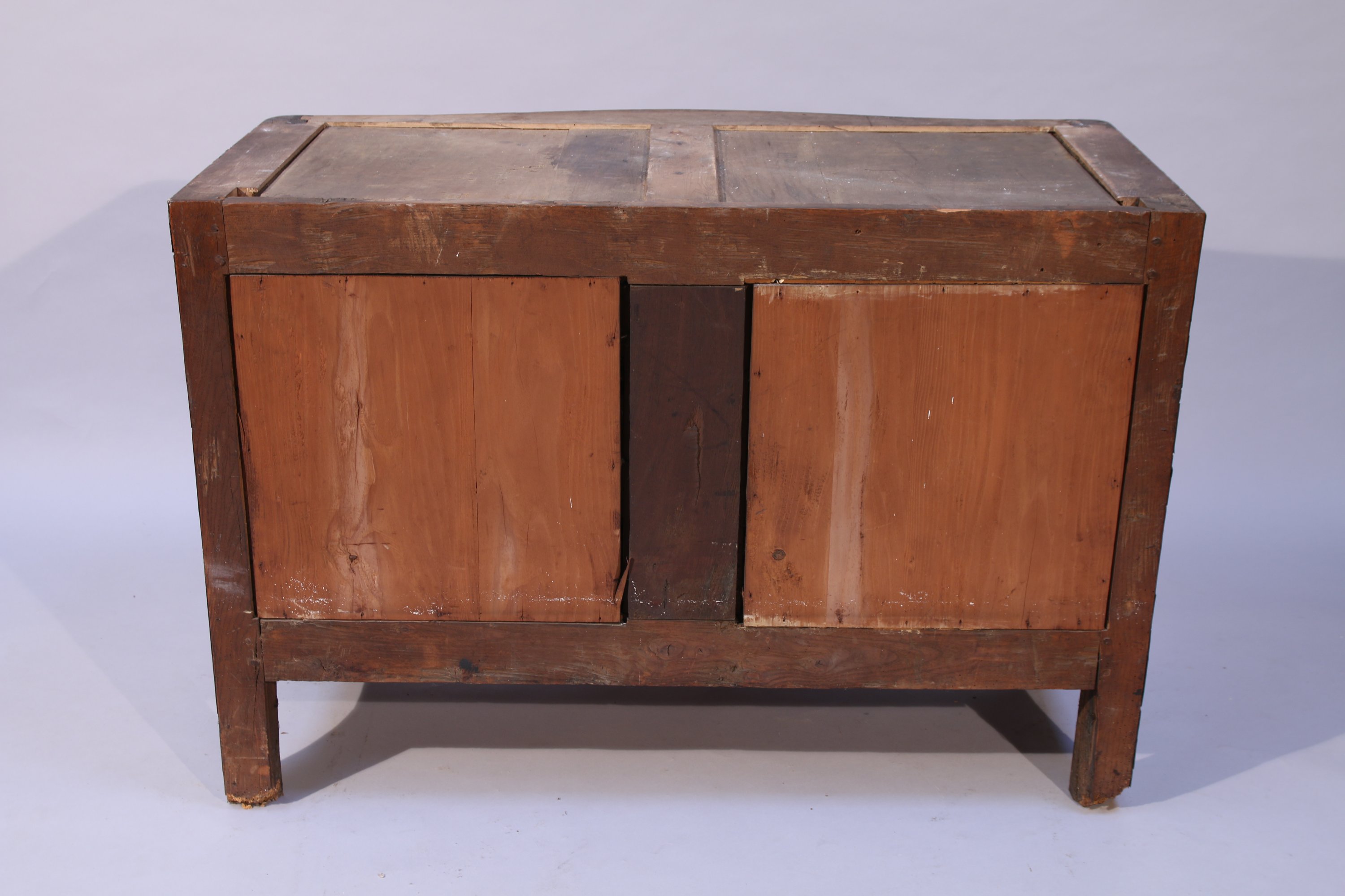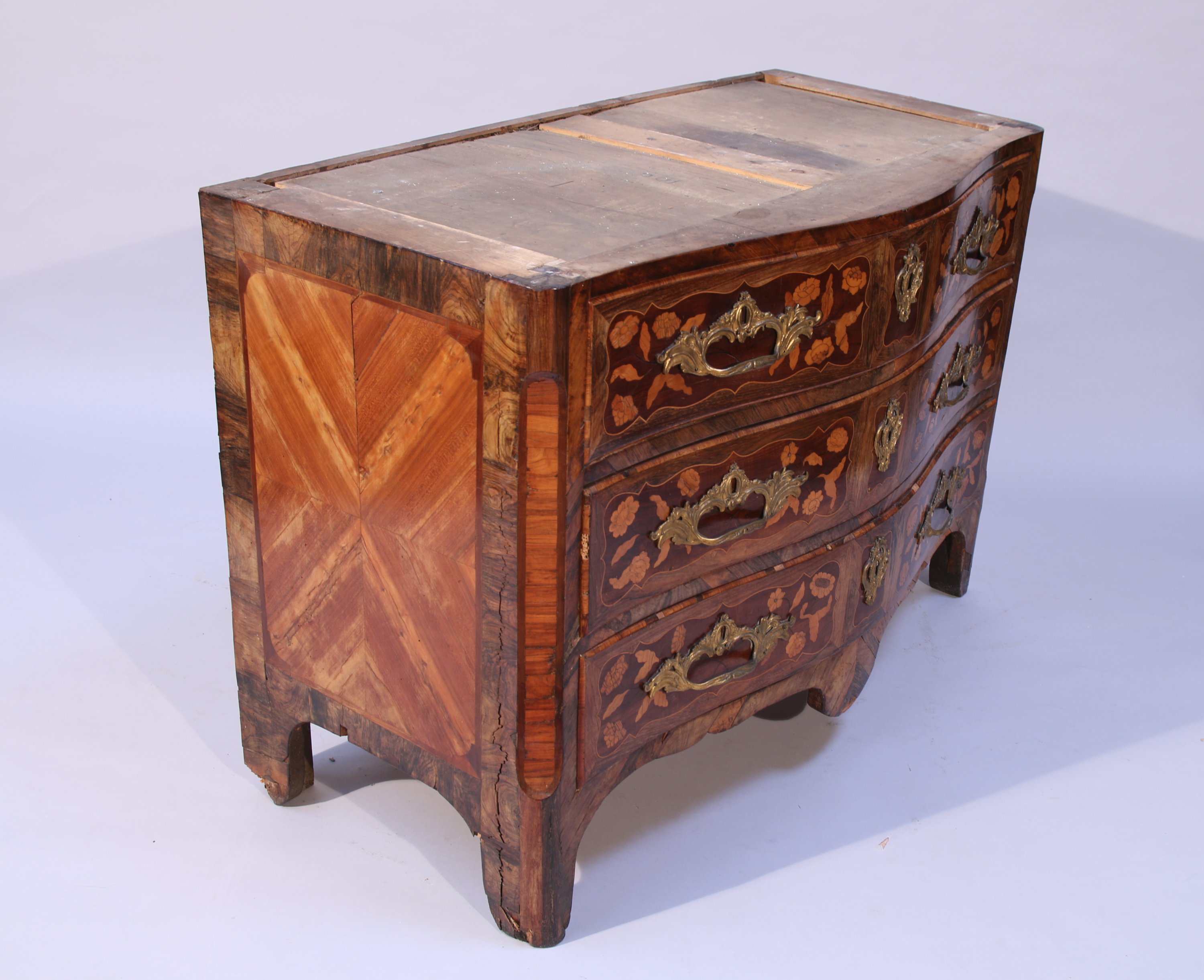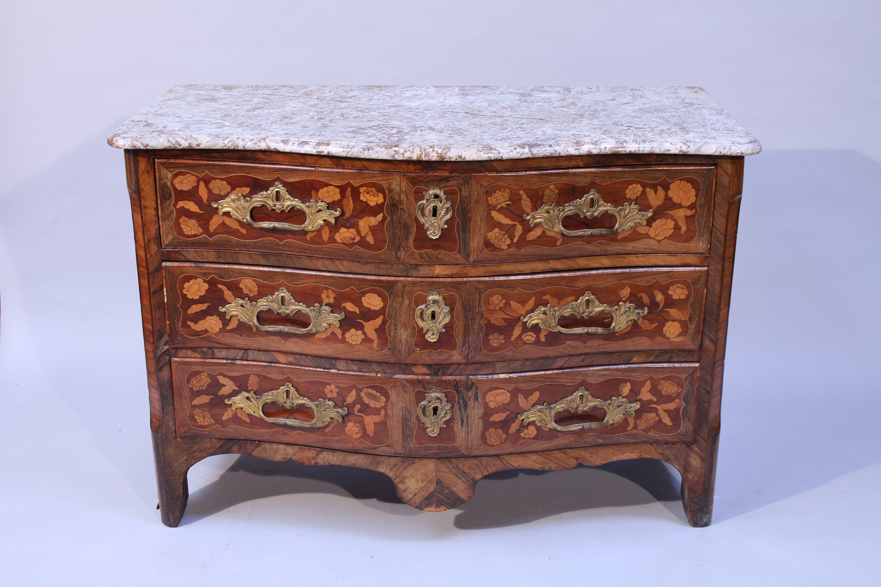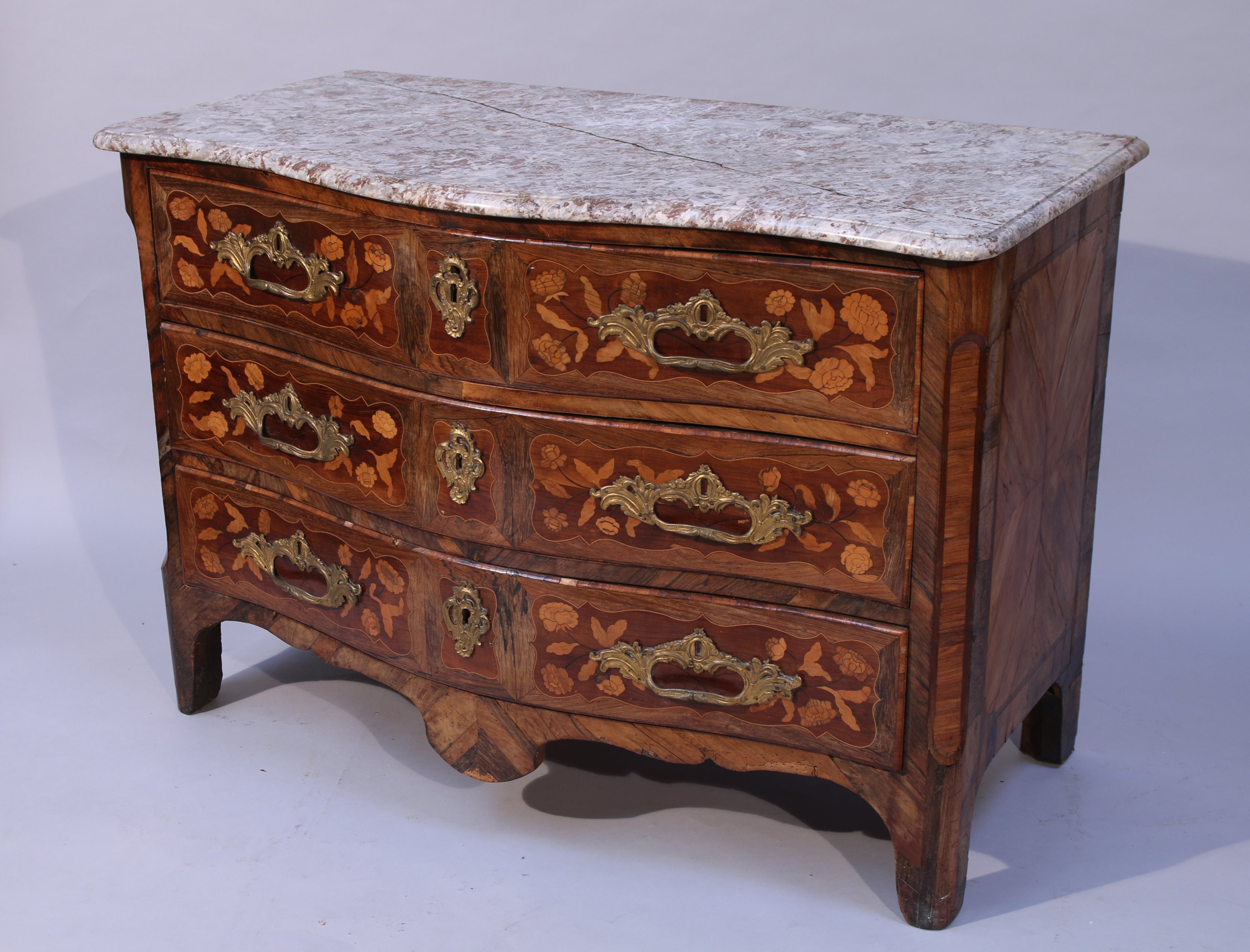 ouvrant par trois tiroirs sur trois rangs. Marqueterie de bois indigènes au décor de branches fleuries en bois clair, dans des encadrements polylobés de bois sombre ceints de buis. Les parties latérales en frisage en "x". Coiffée d'un marbre blanc veiné de rouge.