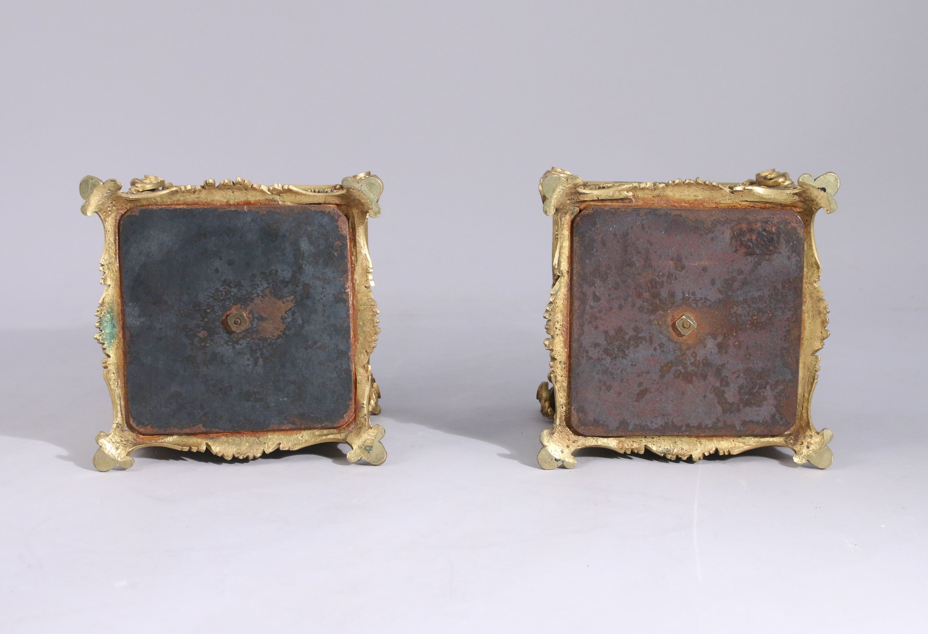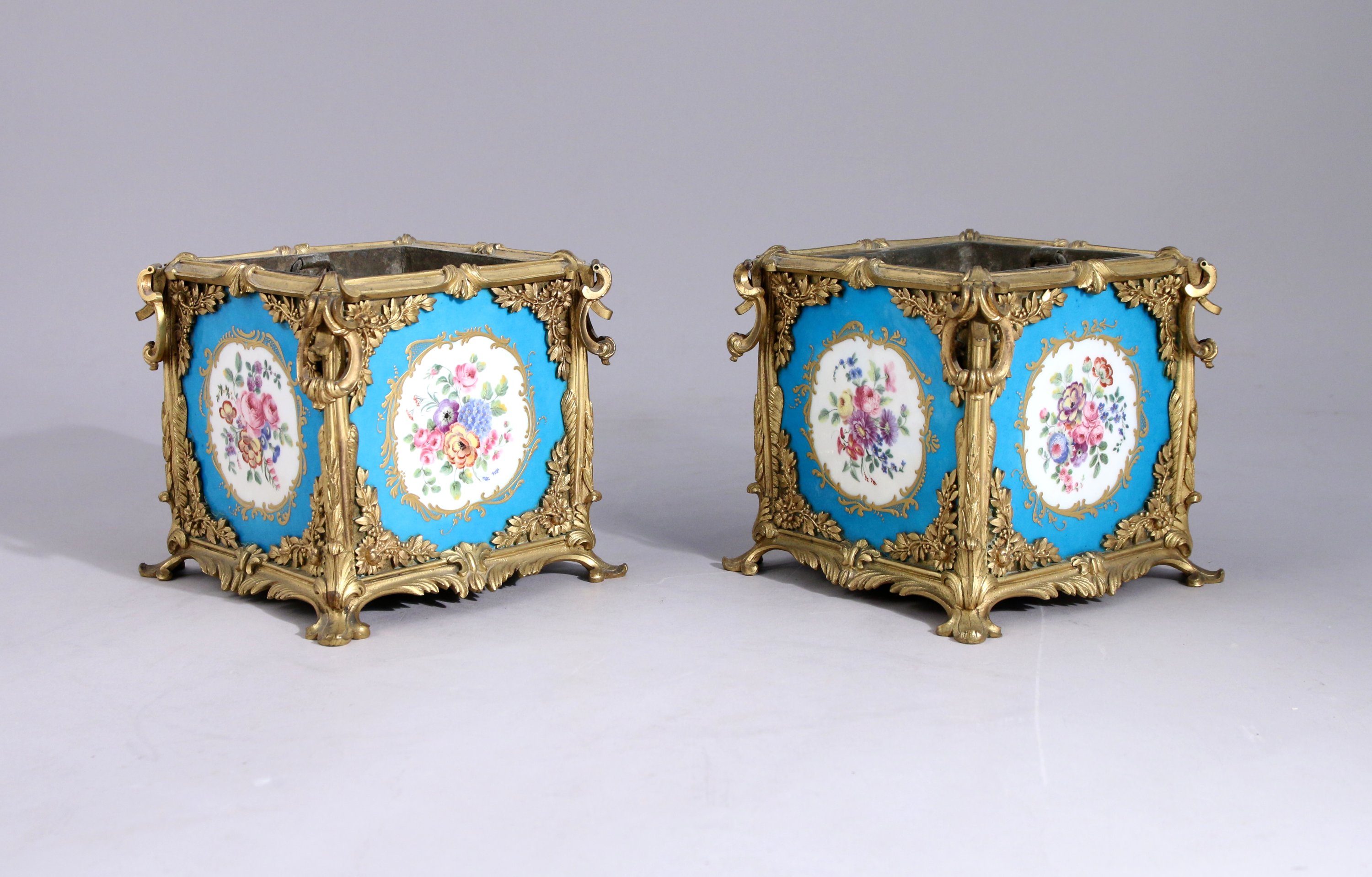 de forme cubique, ornées chacune de quatre médaillons en porcelaine peints d'un bouquet de fleur dans un cartouche doré en réserve bleu céleste. Riche monture en bronze ciselé et doré à motifs feuillagés.