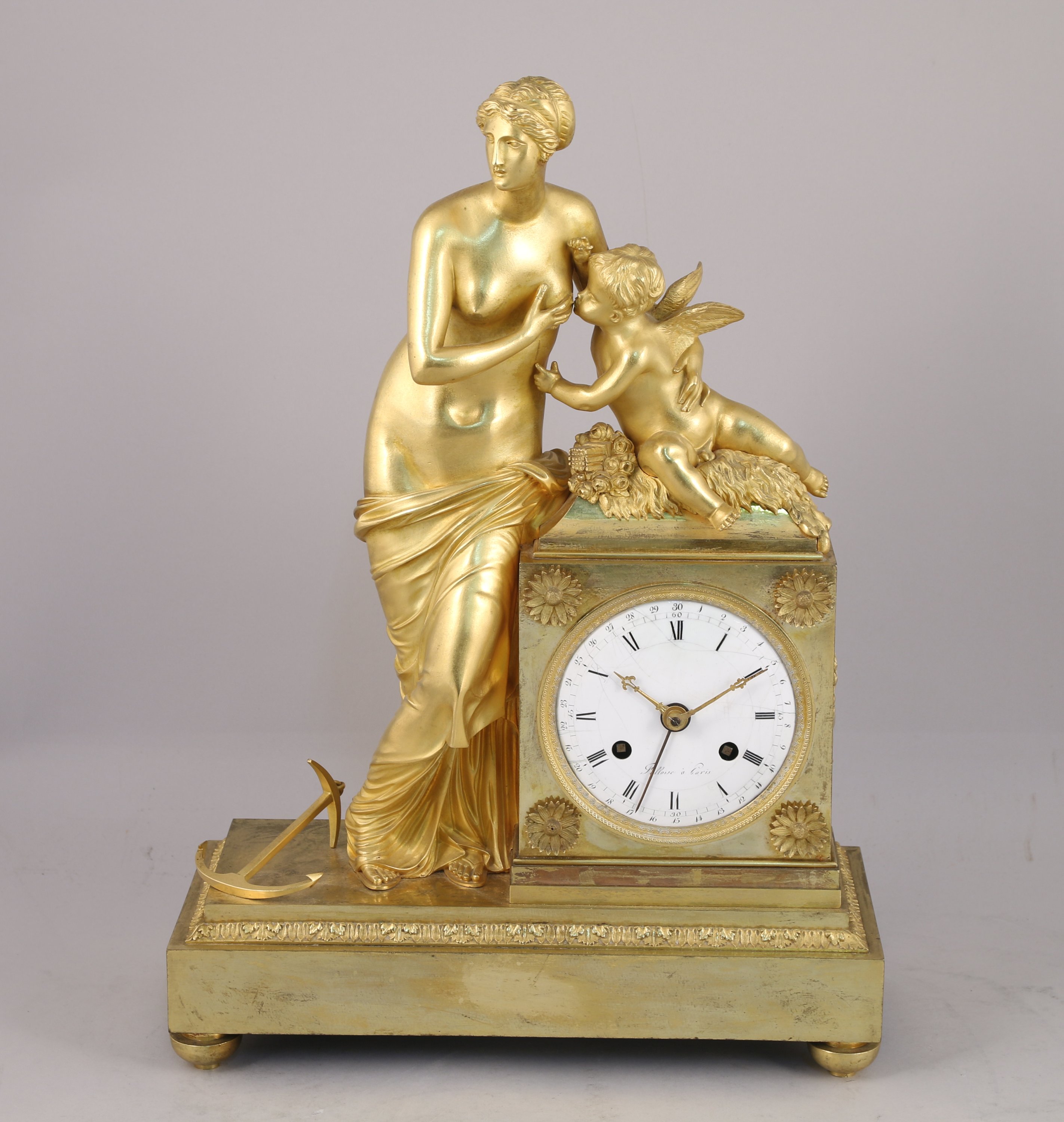 en bronze doré, sur une borne rectangulaire flanquée de fleurettes, Vénus debout donne le sein à un angelot désarmé reposant sur une peau de lion. Une ancre posée aux pieds de la déesse rappelle la nécessité de nourrir la flamme amoureuse au-delà de la distance, sans trop s'en rapprocher, comme l'illustre sur le côté de la borne un autre amour en bas-relief brulant les ailes d'un papillon à la lueur d'une torche. Elle repose sur une terrasse de forme rectangulaire à doucine et feuilles d'acanthes terminée par quatre pieds toupie.