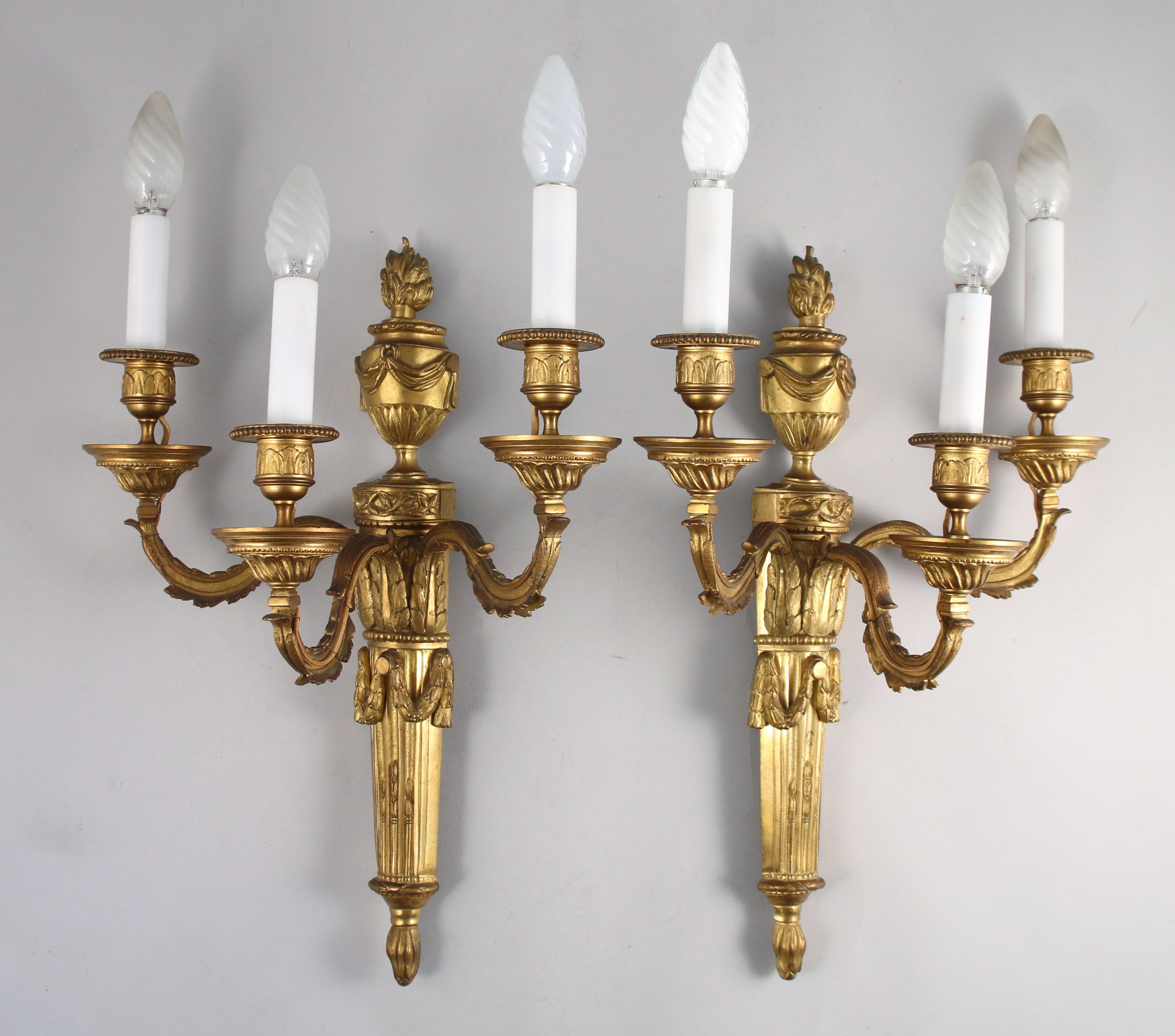 en bronze ciselé et doré. Bras de lumière à décor de feuilles dacanthe. Montant en gaine cannelée à asperges et guirlandes de laurier, surmonté dun pot à feu. Bobèches à bagues perlées.