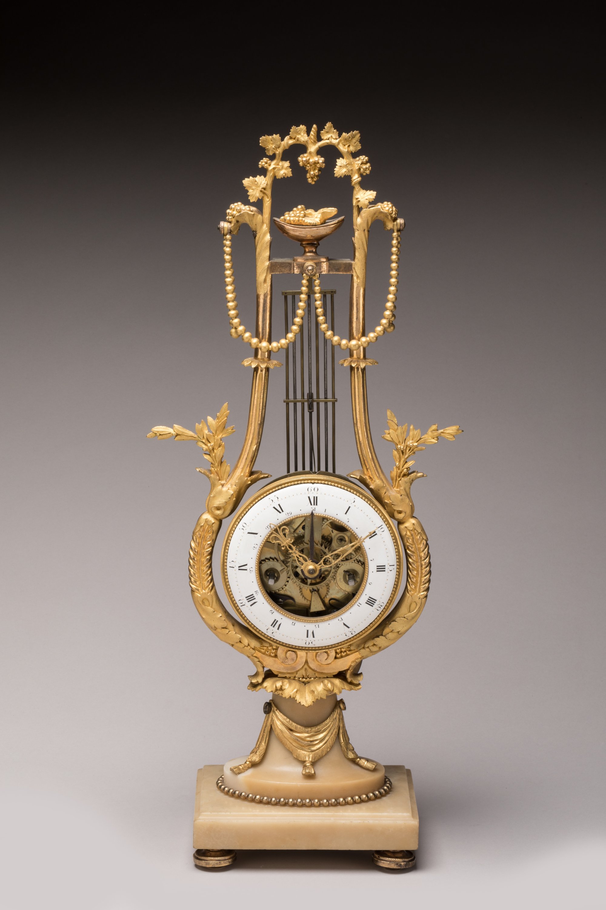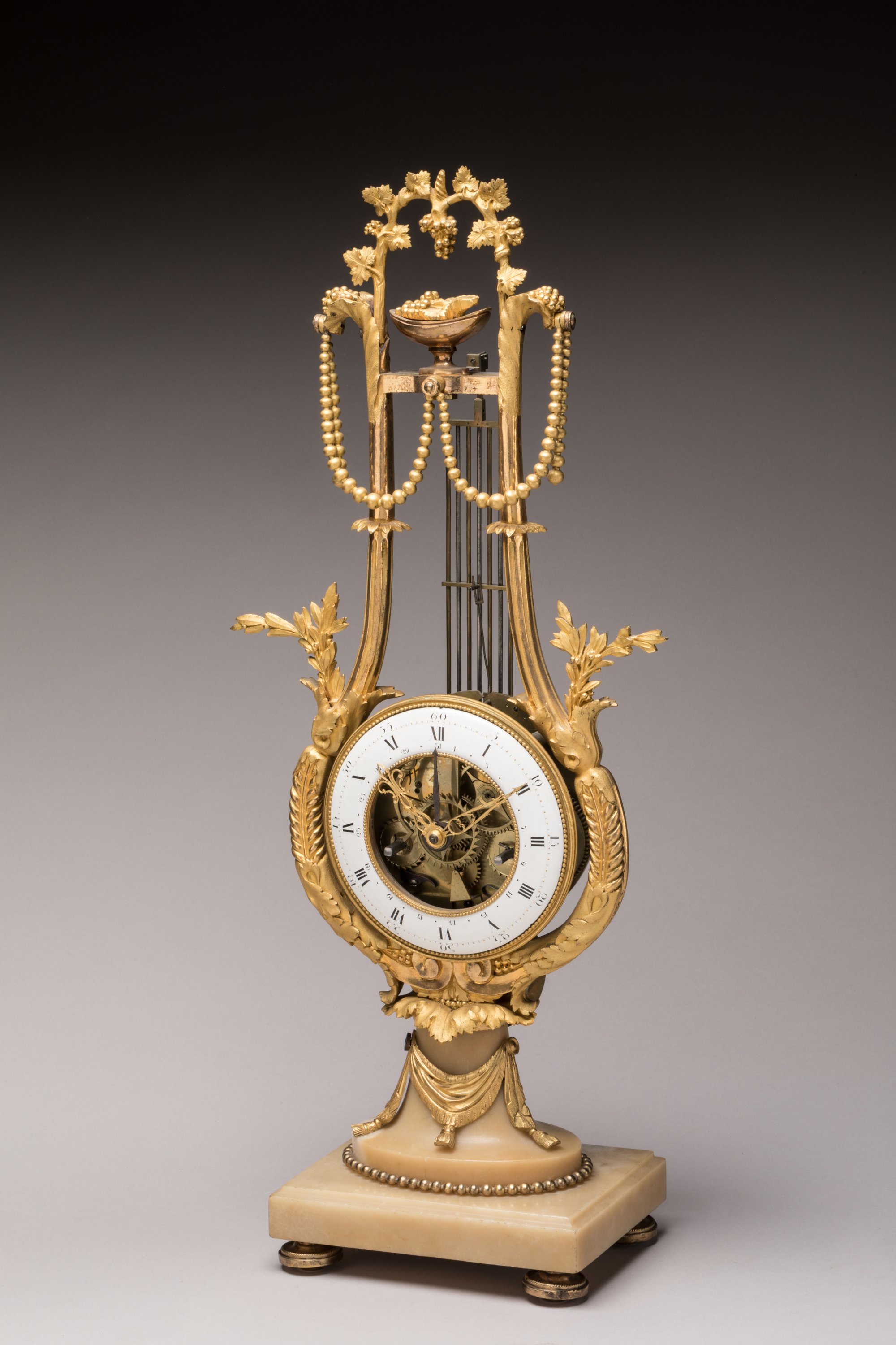 La base rectangulaire en albâtre, ornée d'une frise de perles en bronze doré. Elle repose sur quatre pieds toupies.