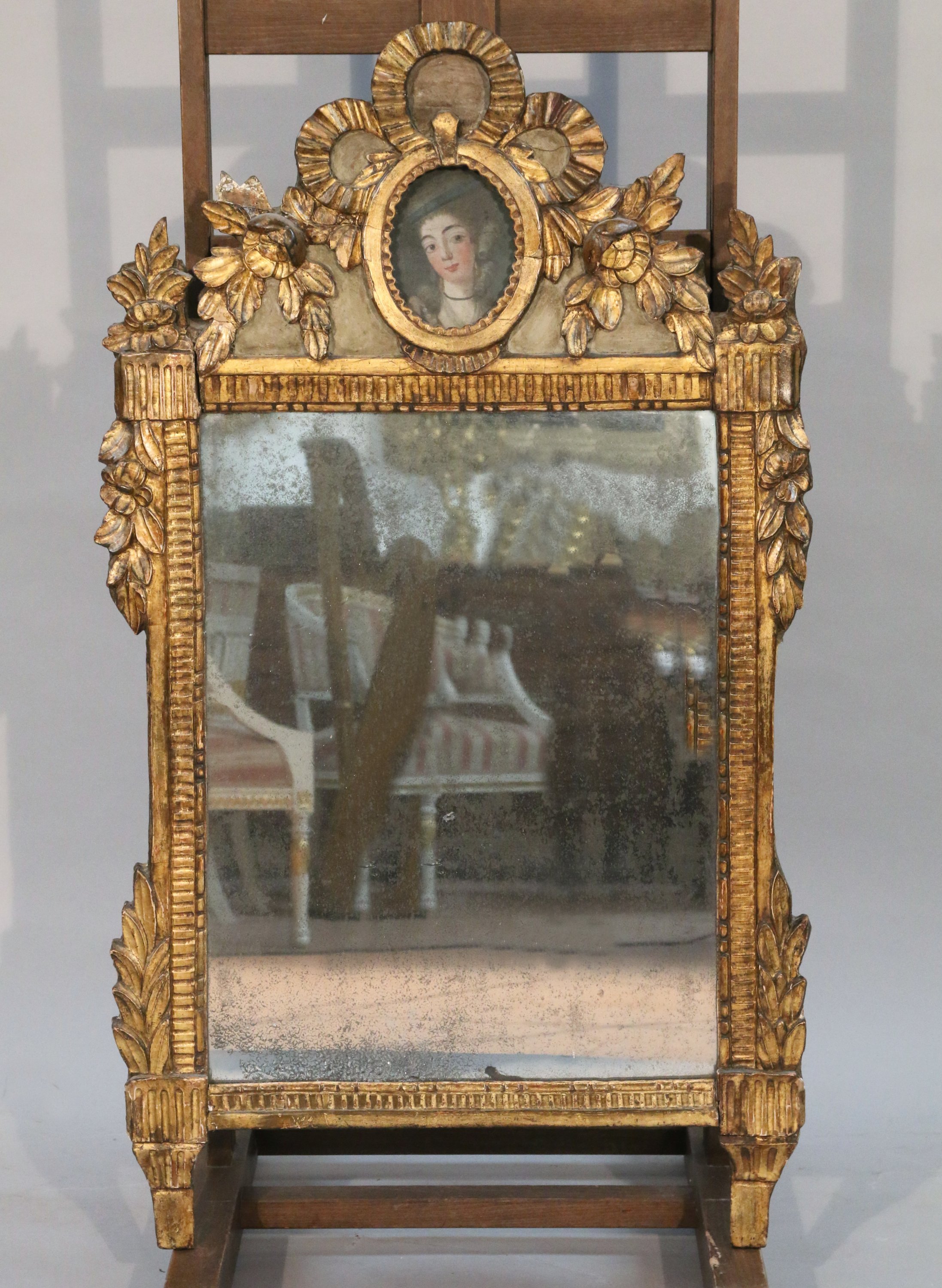 à décor de guirlandes et feuilles, surmonté d'un médaillon orné d'une toile peinte représentant une dame de qualité au ruban bleu (rapportée).