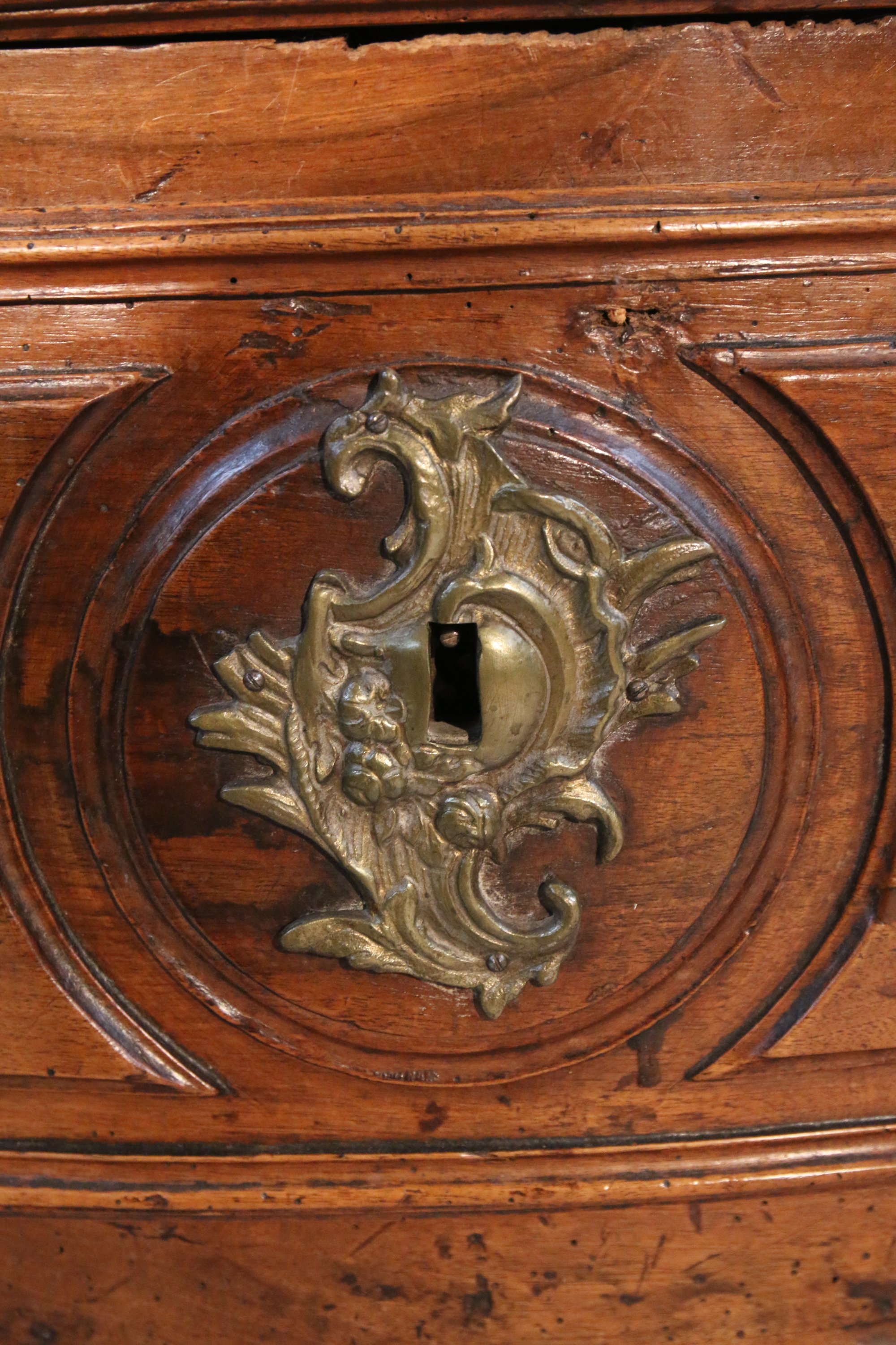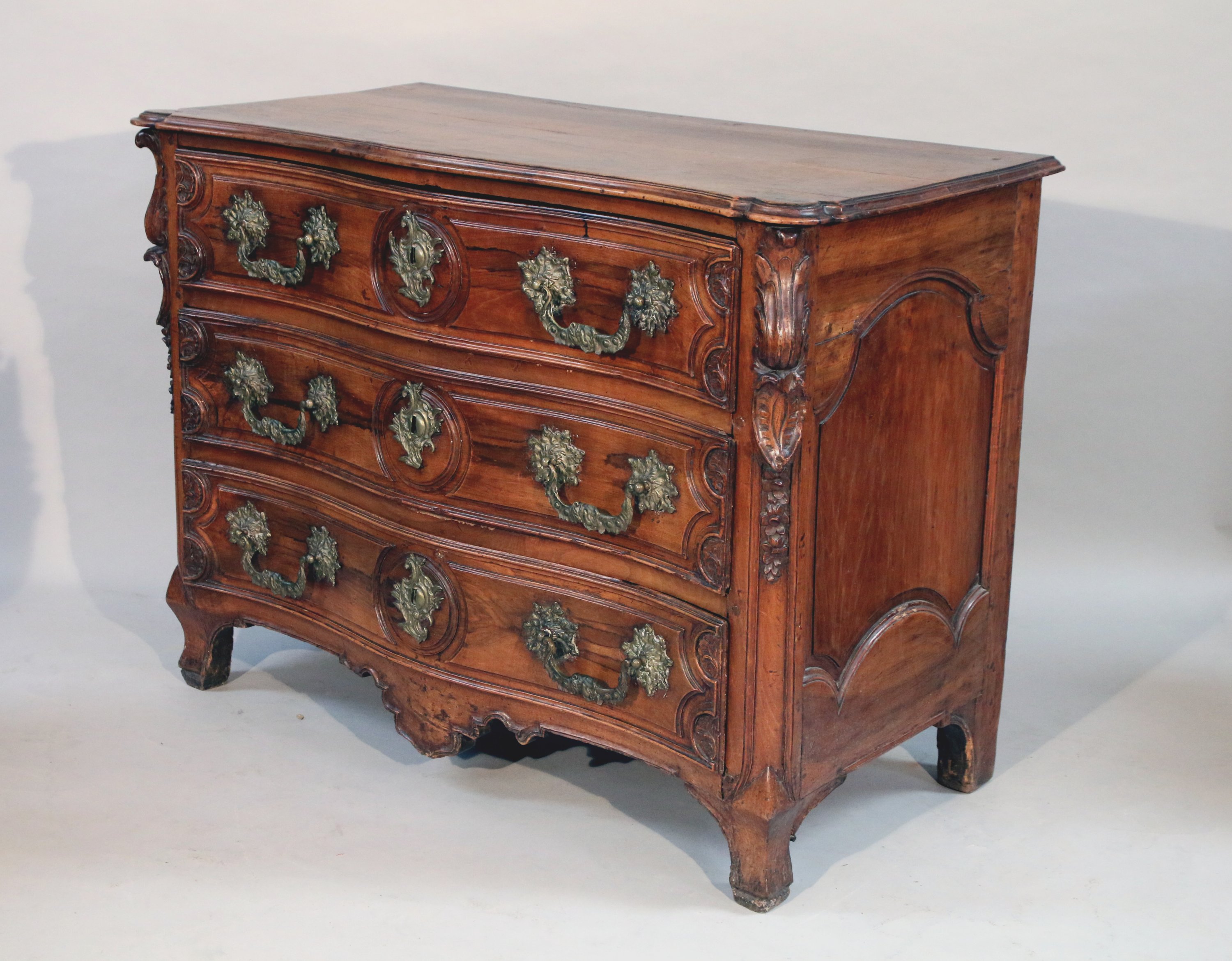 ouvrant par trois tiroirs sur trois rangs séparés par des traverses. Le tiroir supérieur cache un petit tiroir secret. Chaque tiroir est orné d'un médaillon central entouré aux extrémités par des demi-cerle dans lesquels sont inscrits des motifs de feuilles d'acanthe. Les chutes d'angle sont ornées d'importante feuilles d'acanthe formant console suivies d'une guirlande de fleurettes. Les pieds antérieurs sont légèrement courbes et postérieurs droits. Le dessus est coiffé d'un plateau de bois. Riche ornementation de bronze probablement rapportée tels qu'entrées de serrure et poignets de tirage mobile.
