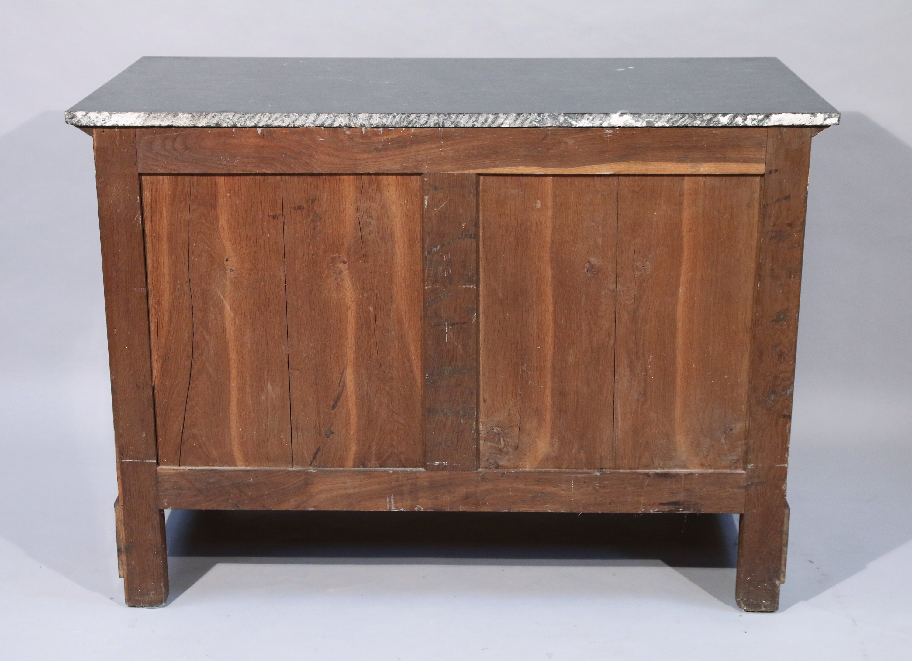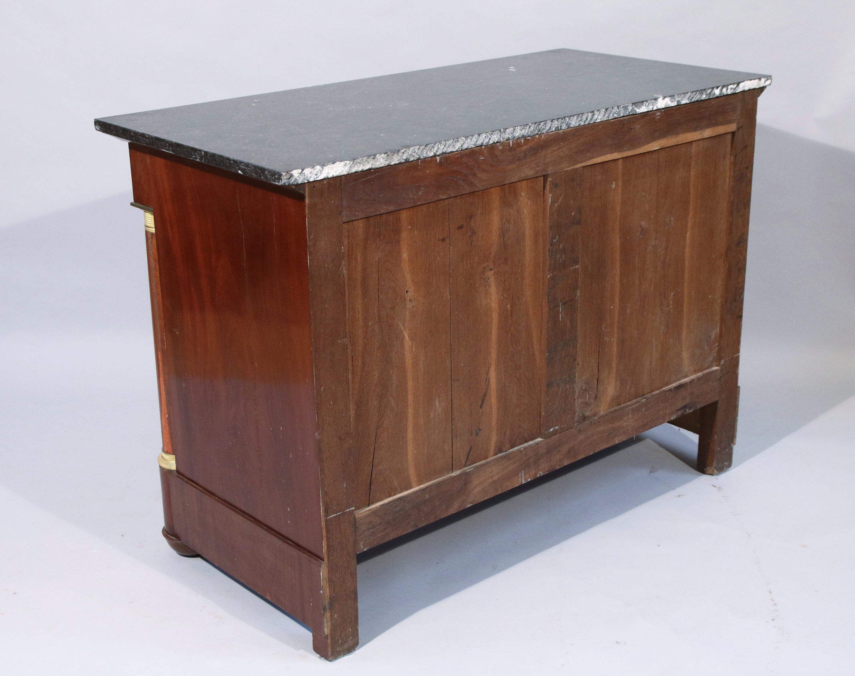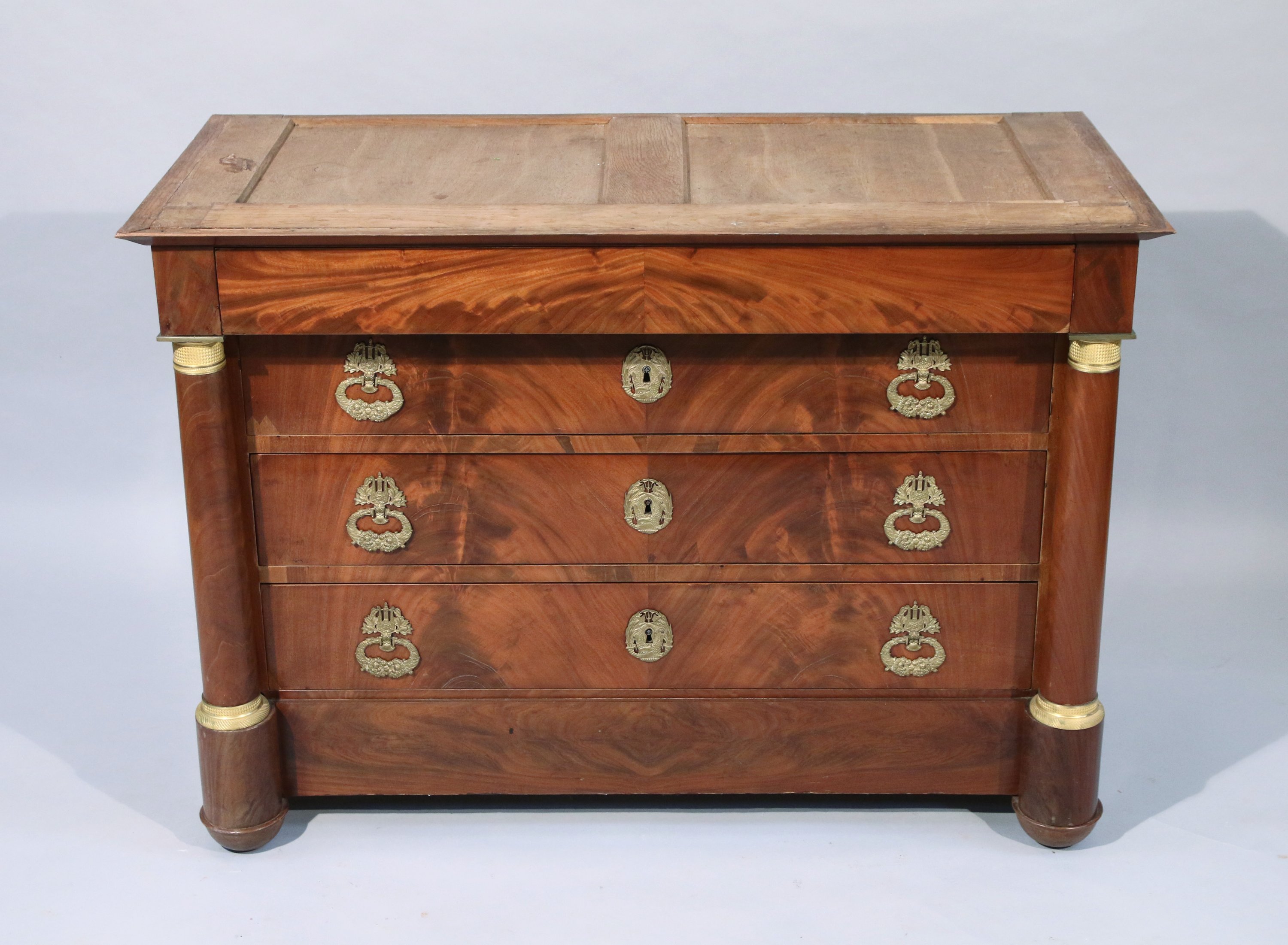 en acajou et placage d'acajou, ouvrant par quatre tiroirs en façade et flanquée de deux colonnes détachées. Ornementations en bronze doré: poignées tombantes à motif d'une double corne d'abondance et lyre, entrées de serrures aux dauphins enlacés, frises géométriques aux colonnes. Serrures à trèfle. Coiffée d'un marbre noir.