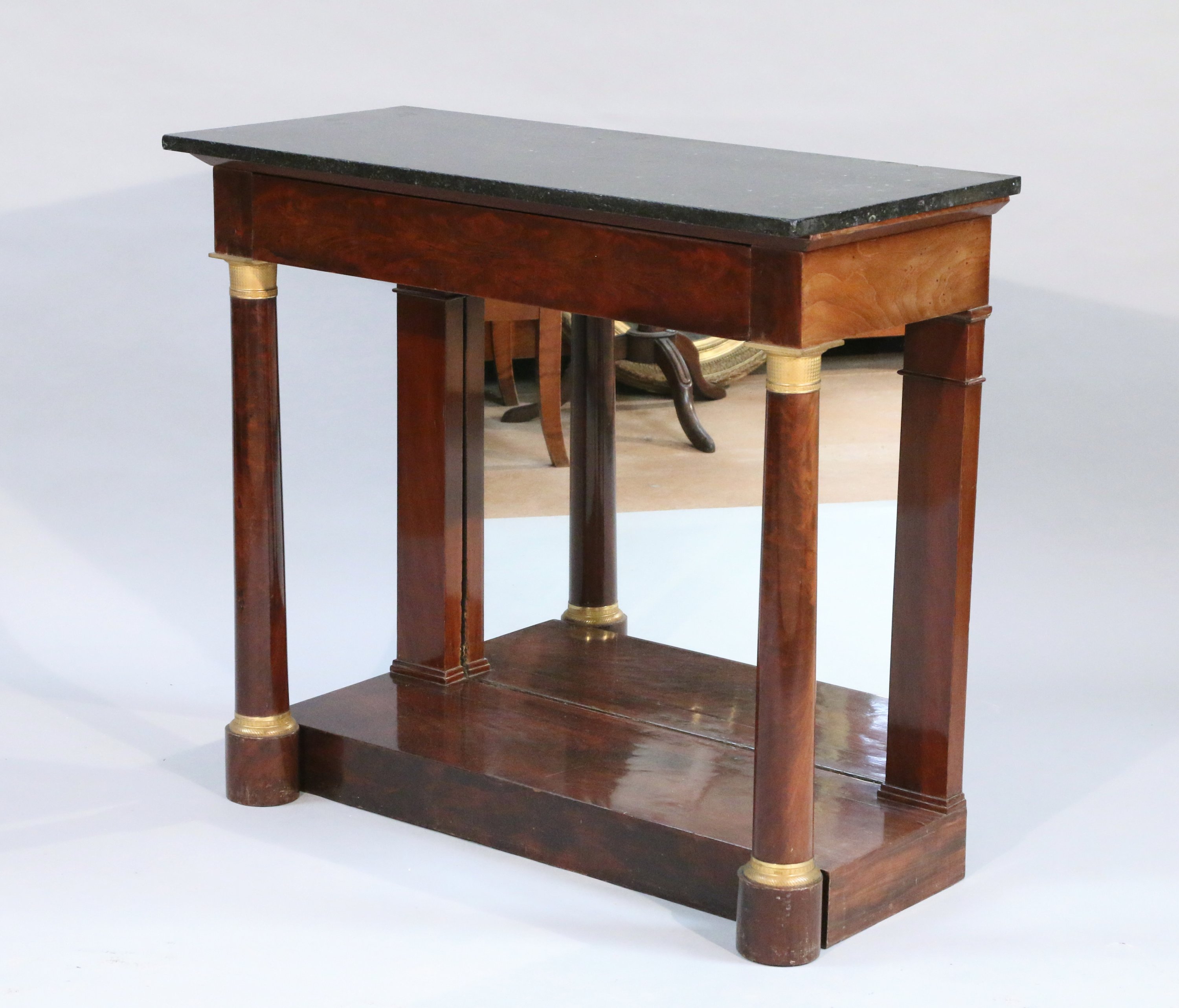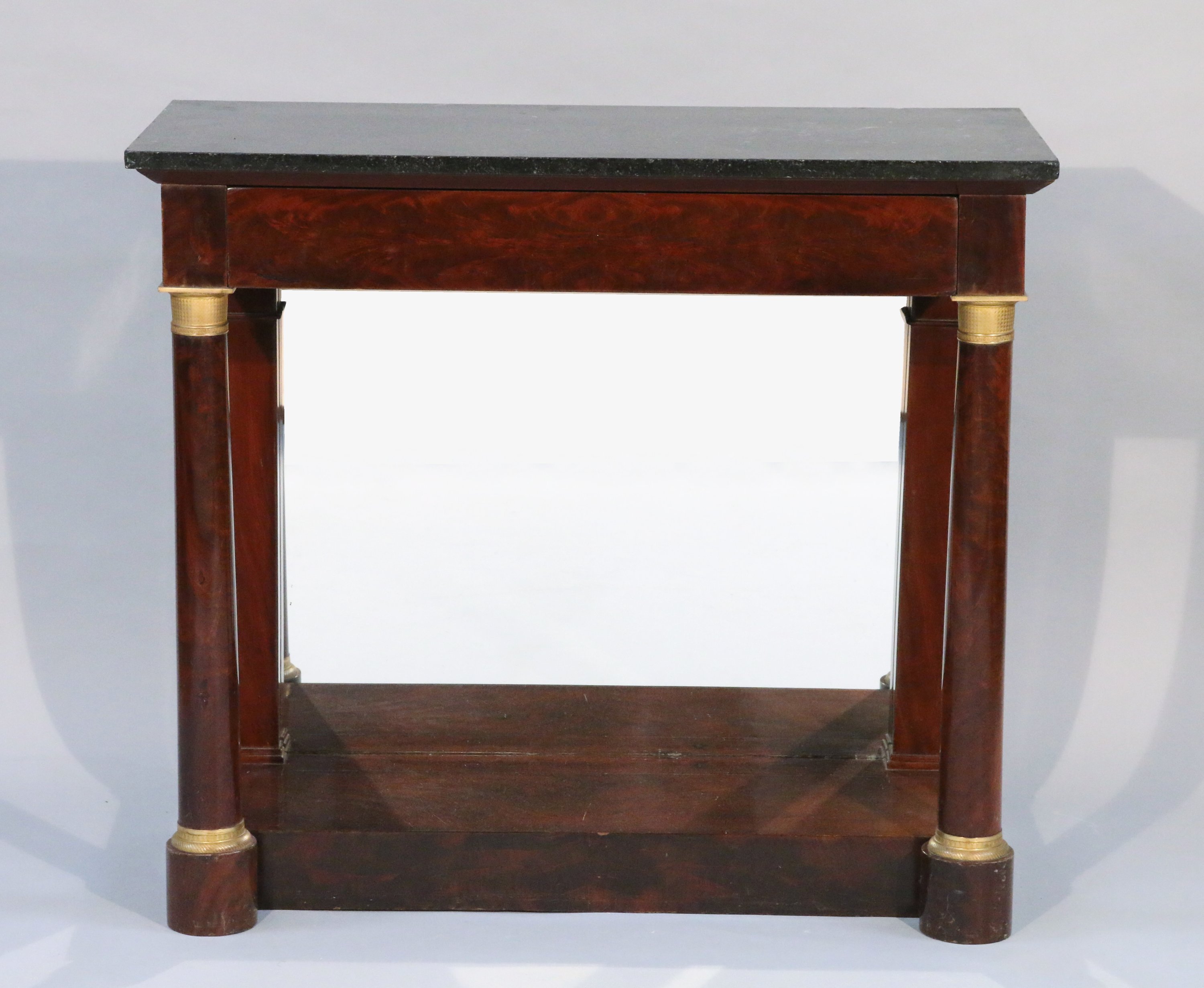 de forme rectangulaire en acajou et placage d'acajou, ouvrant à un tiroir. Montants antérieurs à colonnes détachées. Montants arrières en pilastre et fond de glace. Ornée de bronzes dorés à motif de frises géométriques pour les colonnes.