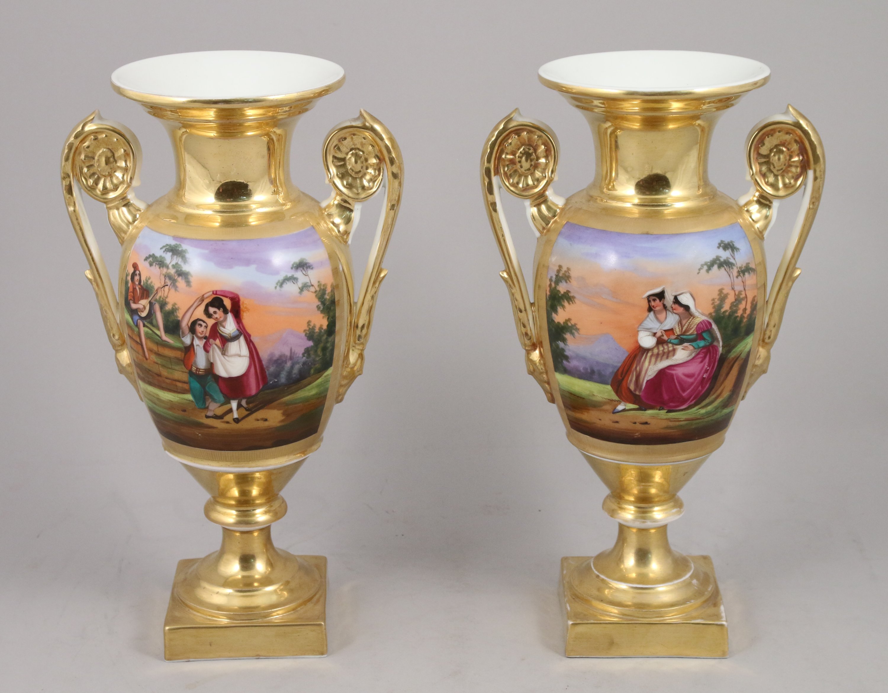 Décor sur fond or d'une scène de danse Napolitaine pour l'un et de deux Napolitaines conversant pour l'autre. Paysage à la tour sur l'autre face des deux vases. Anses à enroulement feuillagé terminé par une rosace. Piédouche reposant sur une base quadrangulaire.