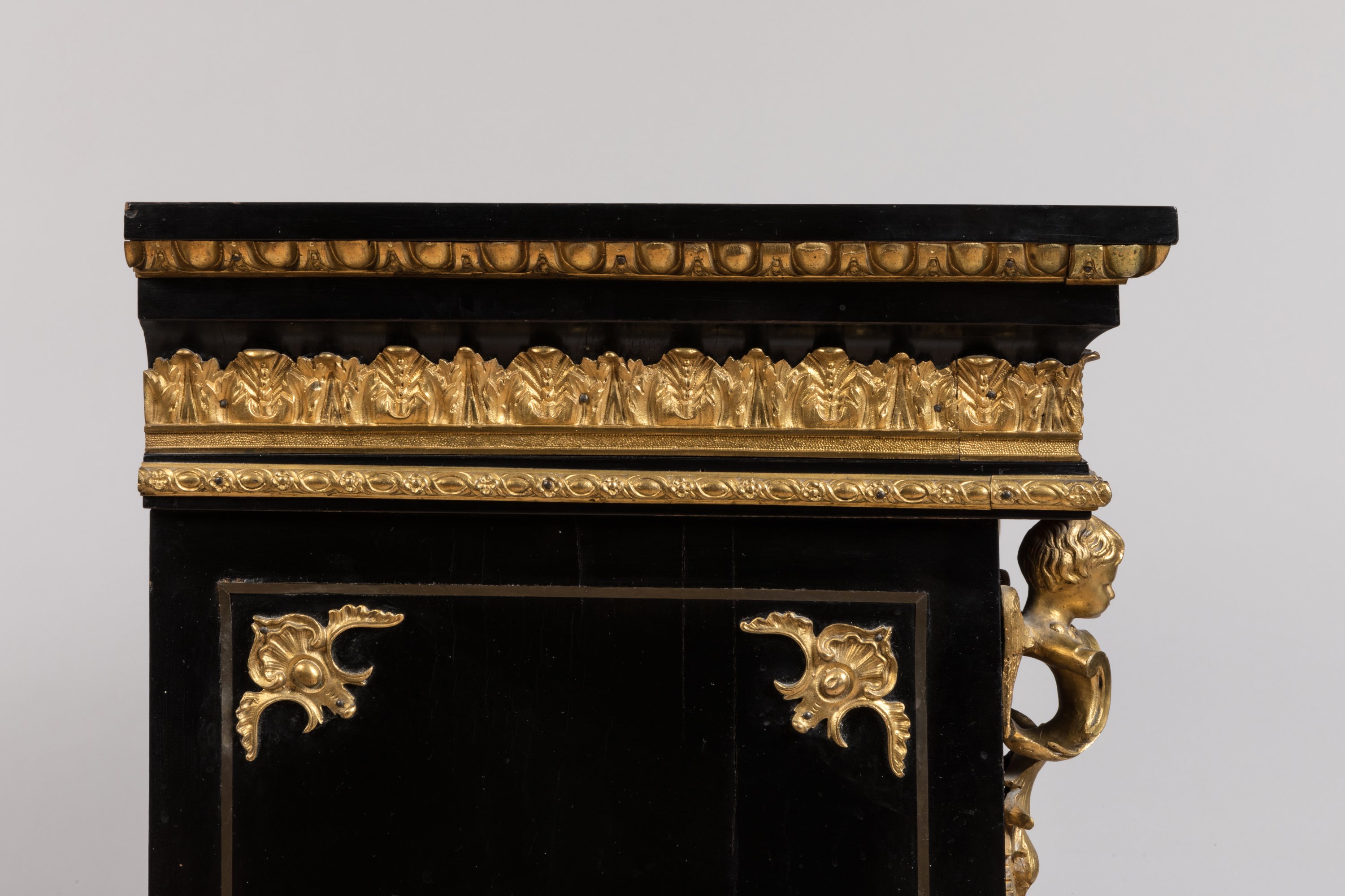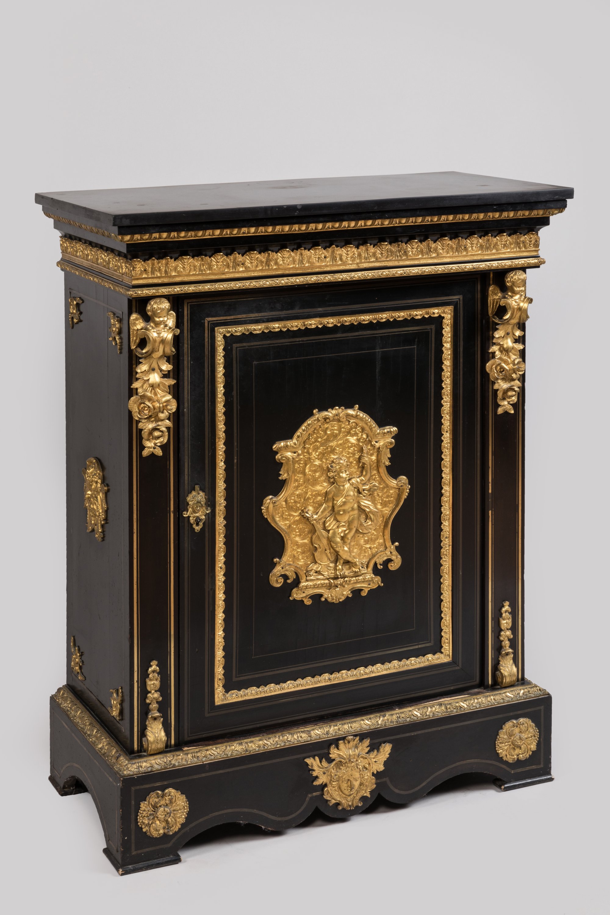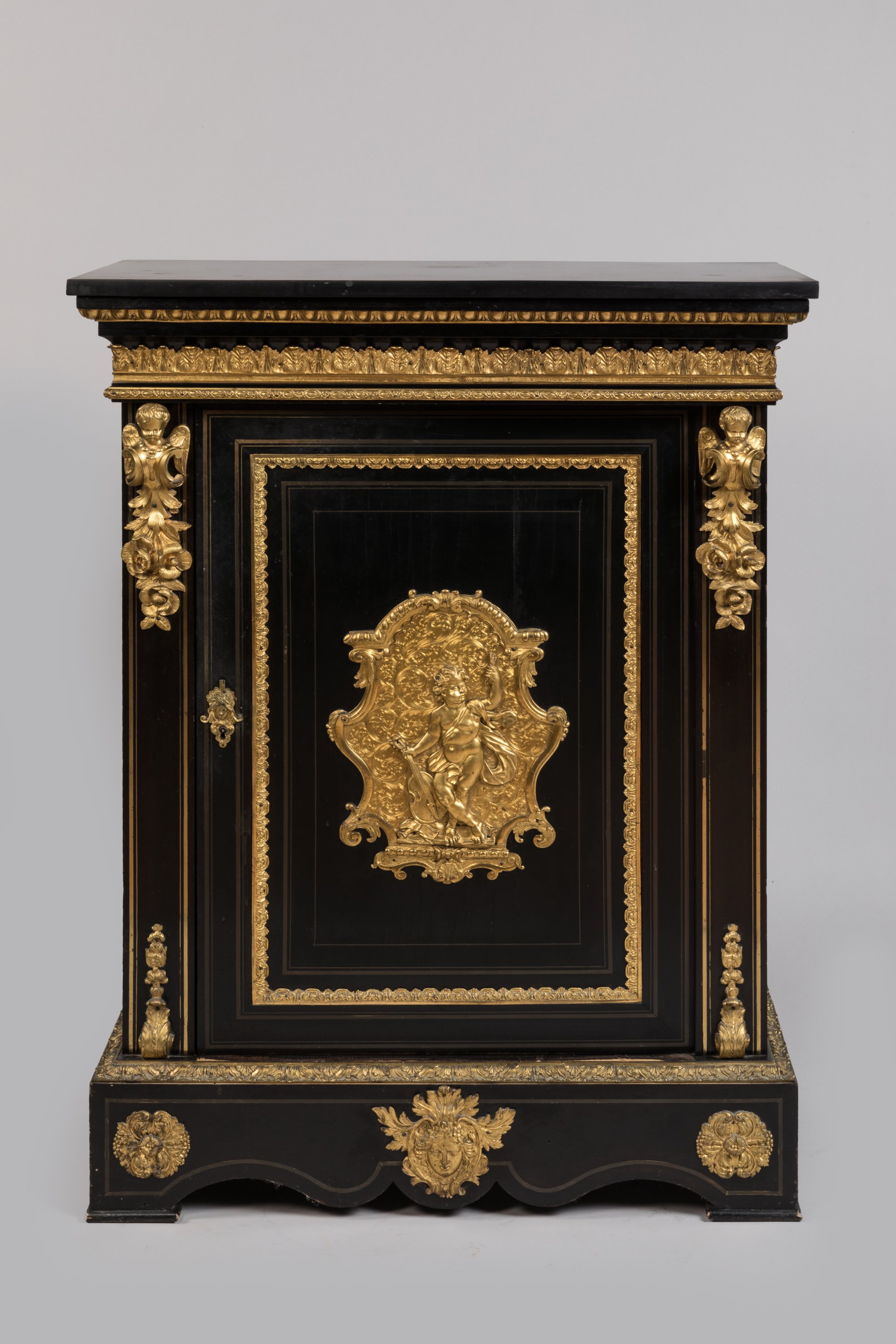 La partie supérieure garnie d'un plateau en pierre noire. Le meuble ouvre par une porte présentant une applique en bronze doré figurant un ange musicien. Il repose sur une plinthe au mascaron et aux rosaces fleuries en bronze doré. Riche ornementation avec encadrements de frises d'acanthe, entrée de serrure, frises d'oves et fleurons et chutes d'angles aux bustes d'angelots en bronze ciselé et doré.