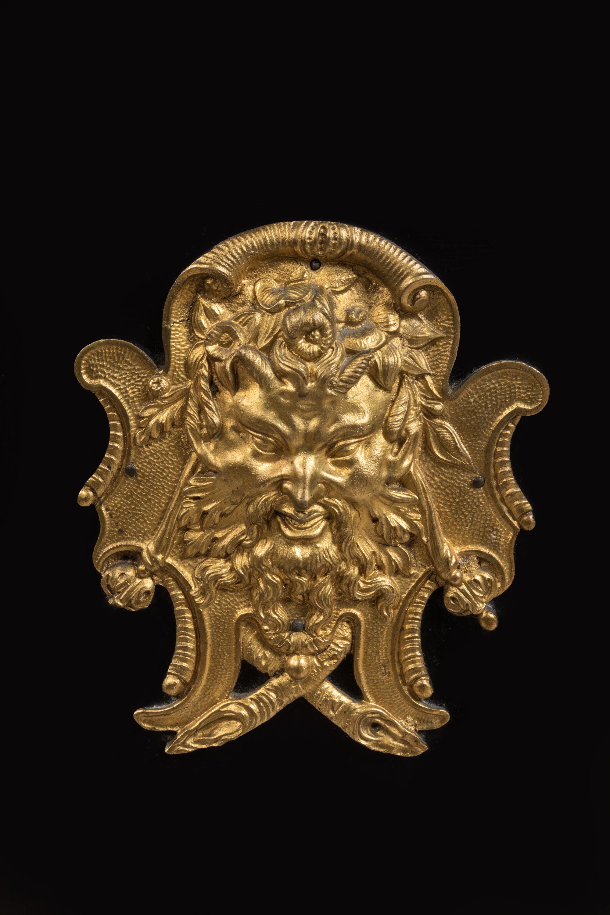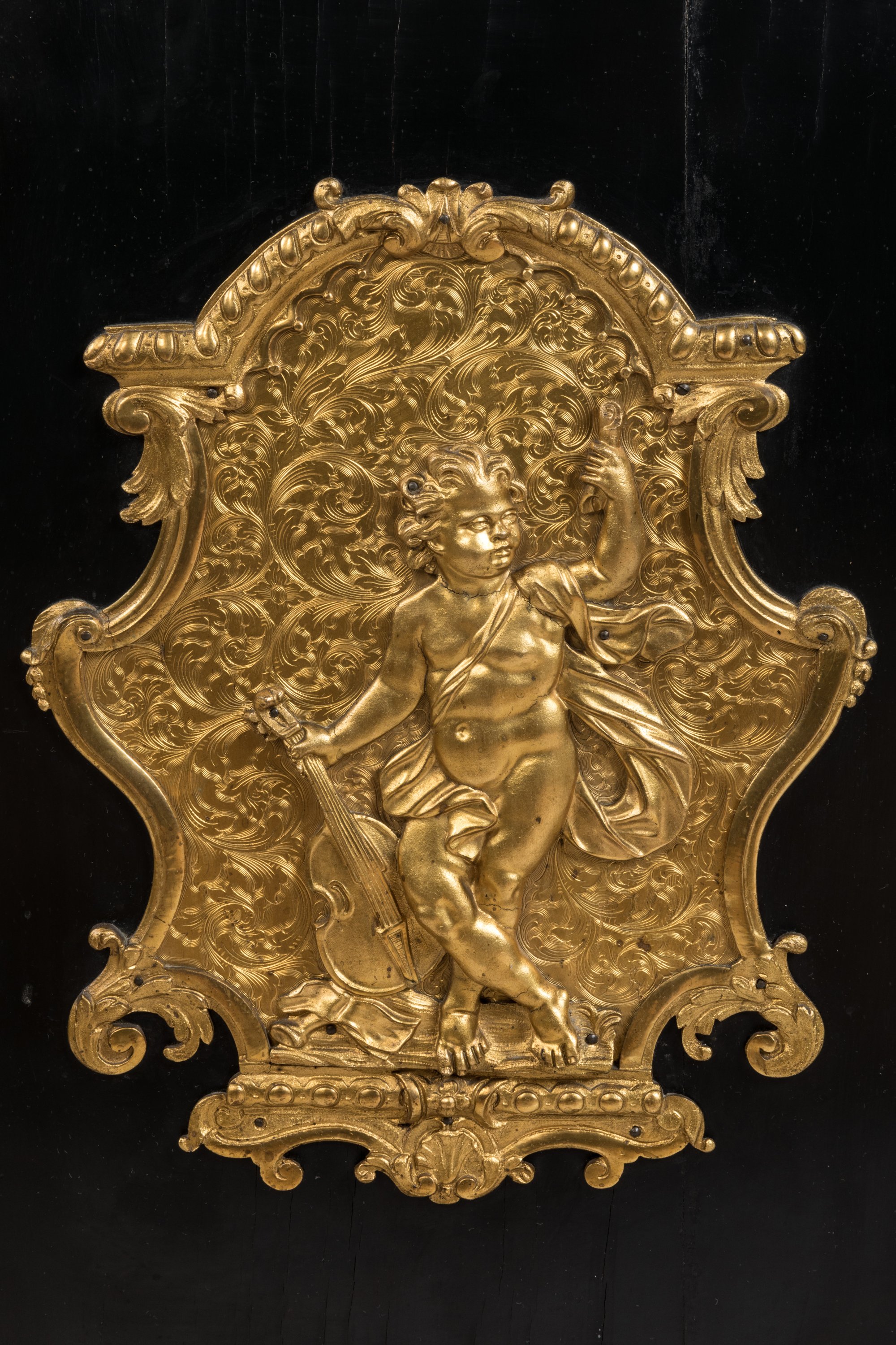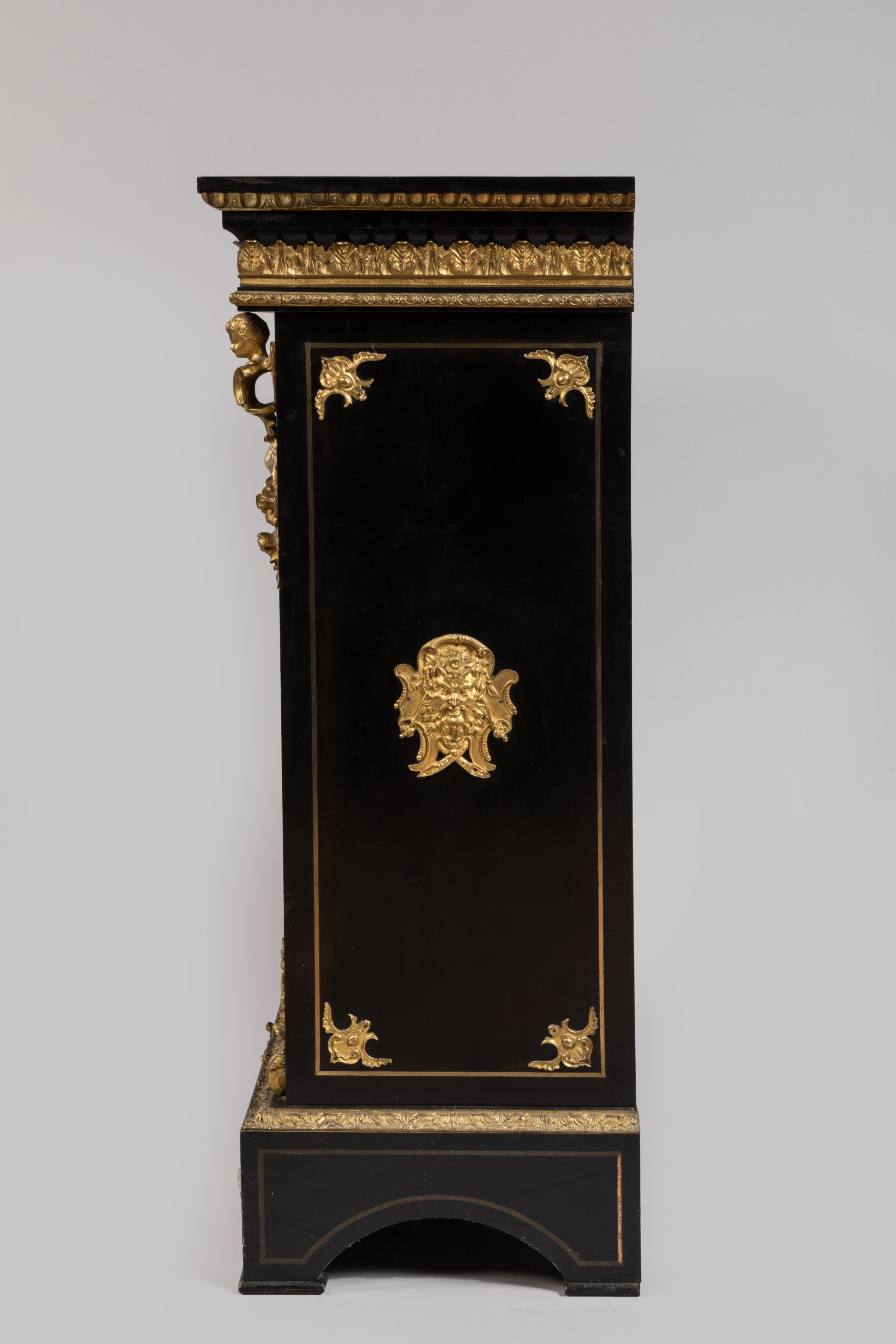 La partie supérieure garnie d'un plateau en pierre noire. Le meuble ouvre par une porte présentant une applique en bronze doré figurant un ange musicien. Il repose sur une plinthe au mascaron et aux rosaces fleuries en bronze doré. Riche ornementation avec encadrements de frises d'acanthe, entrée de serrure, frises d'oves et fleurons et chutes d'angles aux bustes d'angelots en bronze ciselé et doré.