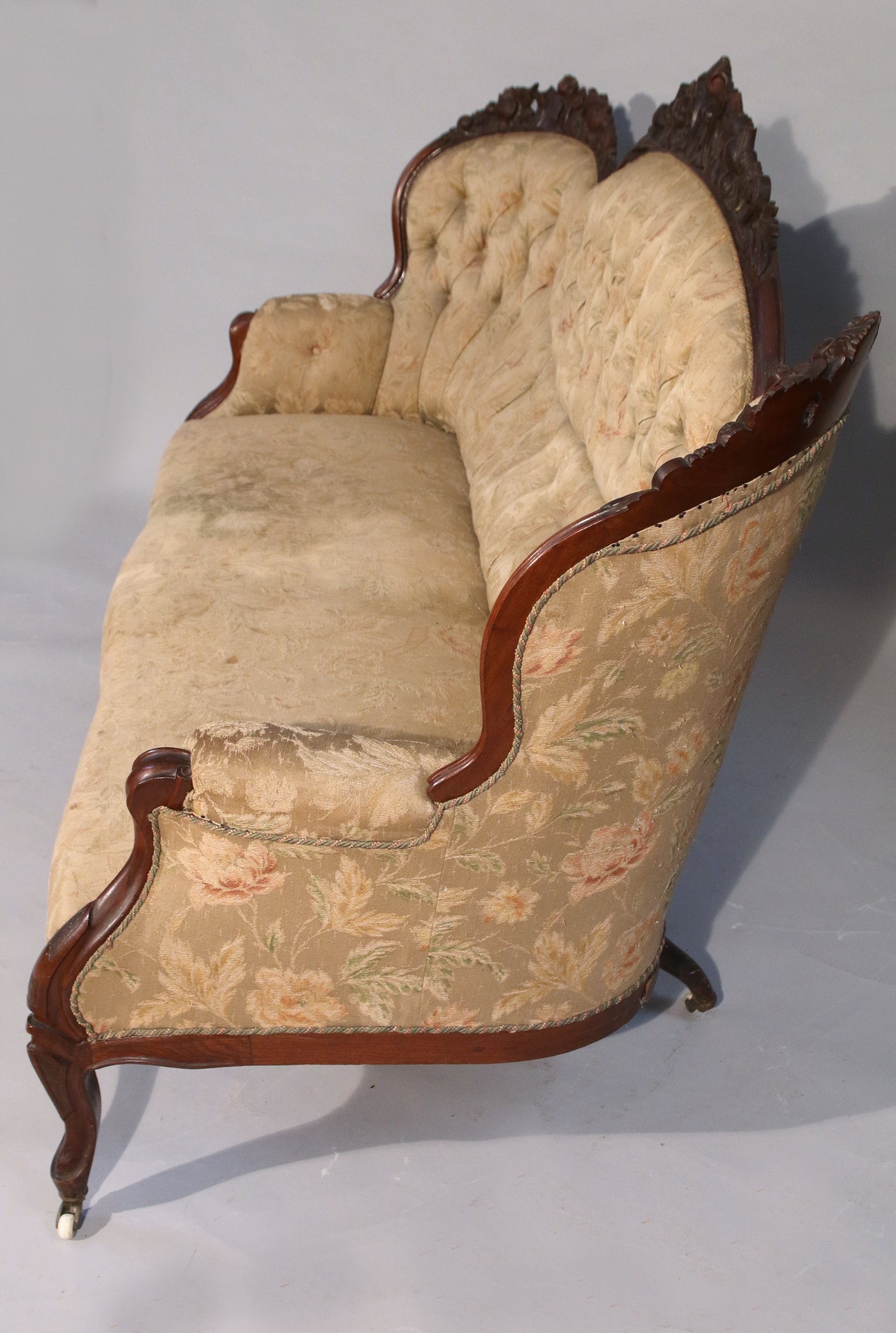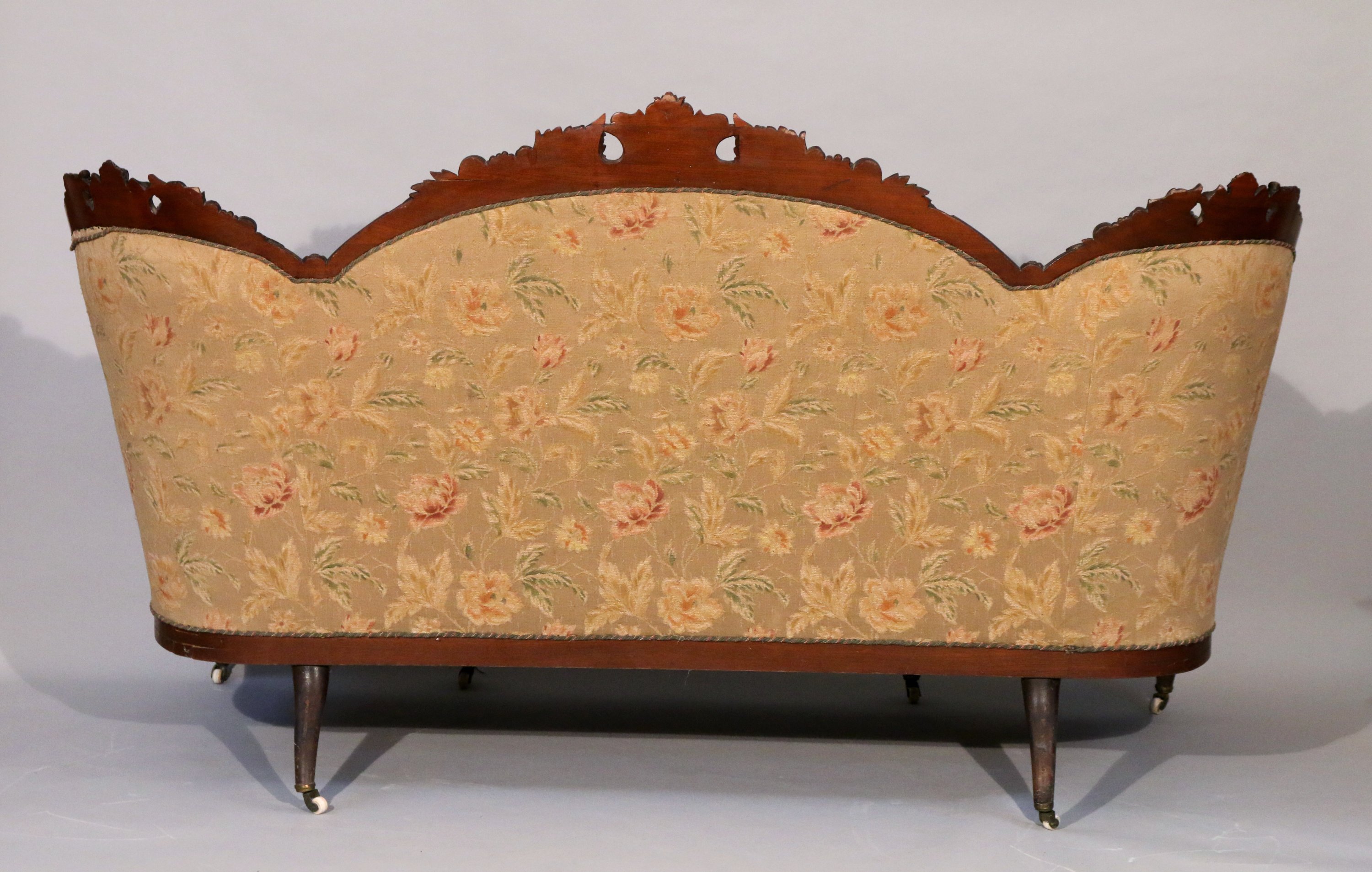 En acajou, riche décor sculpté de grappes de fruits et de feuilles d'acanthes stylisées.Reposant sur des pieds cambrés à roulette. Les dossiers capitonnés.