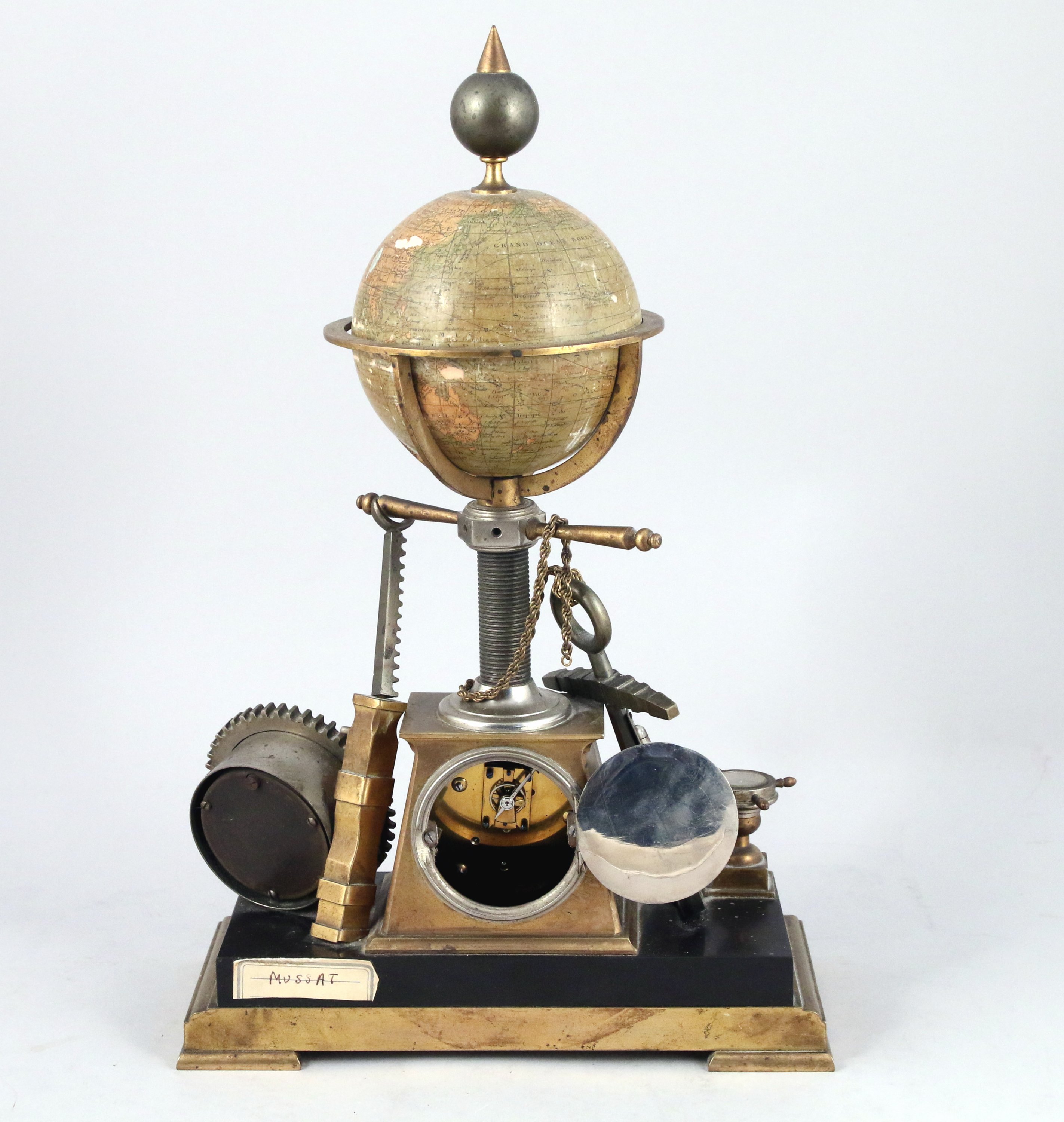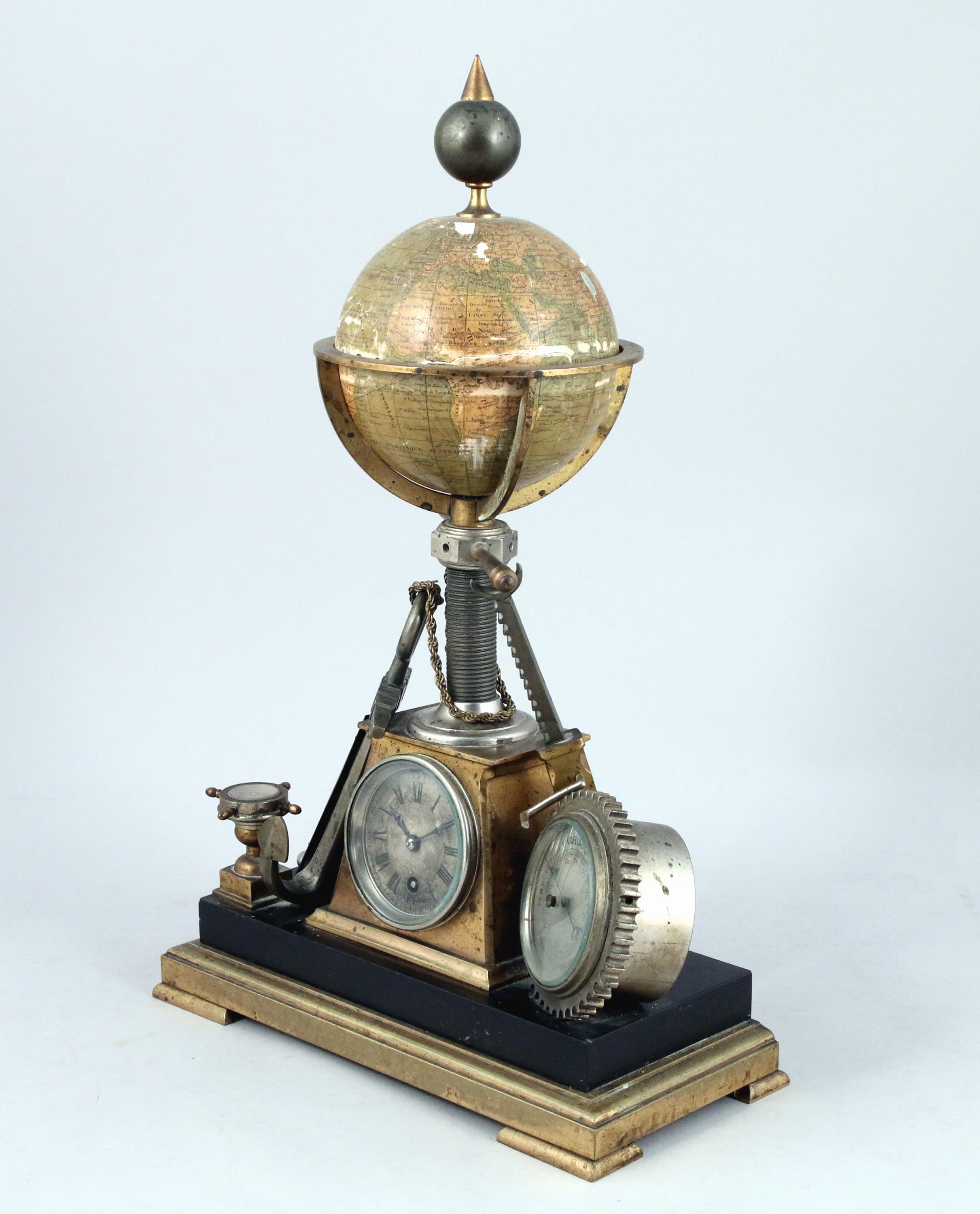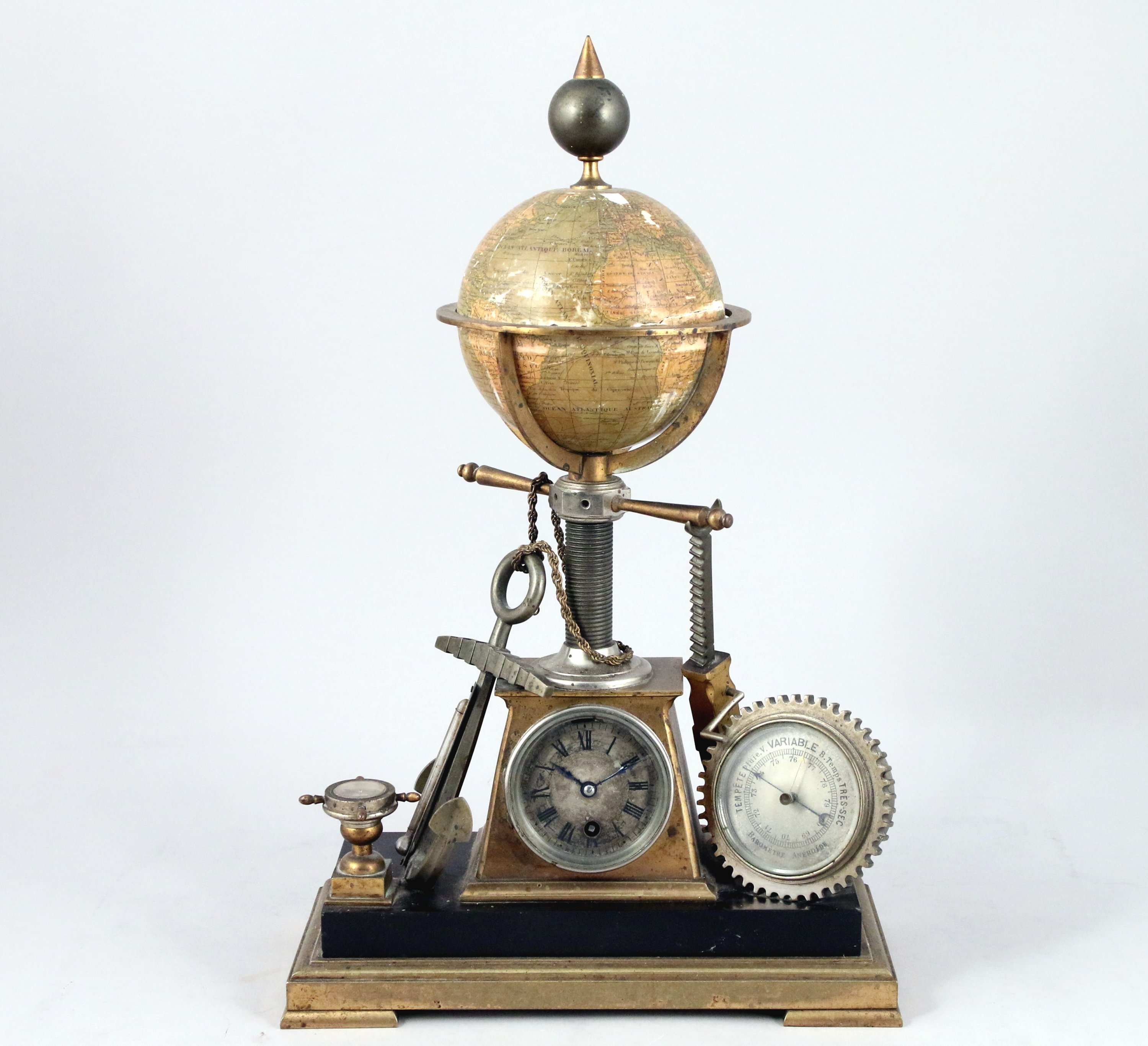 Le cadran sur monté d'un globe terrestre en papier maché, flanquée d'une encre, d'un thermomètre, d'une bousosole dans un gouvernail, d'un baromètre. L'ensemble reposant sur une base en marbre noir soutenu par un socle en bronze doré.