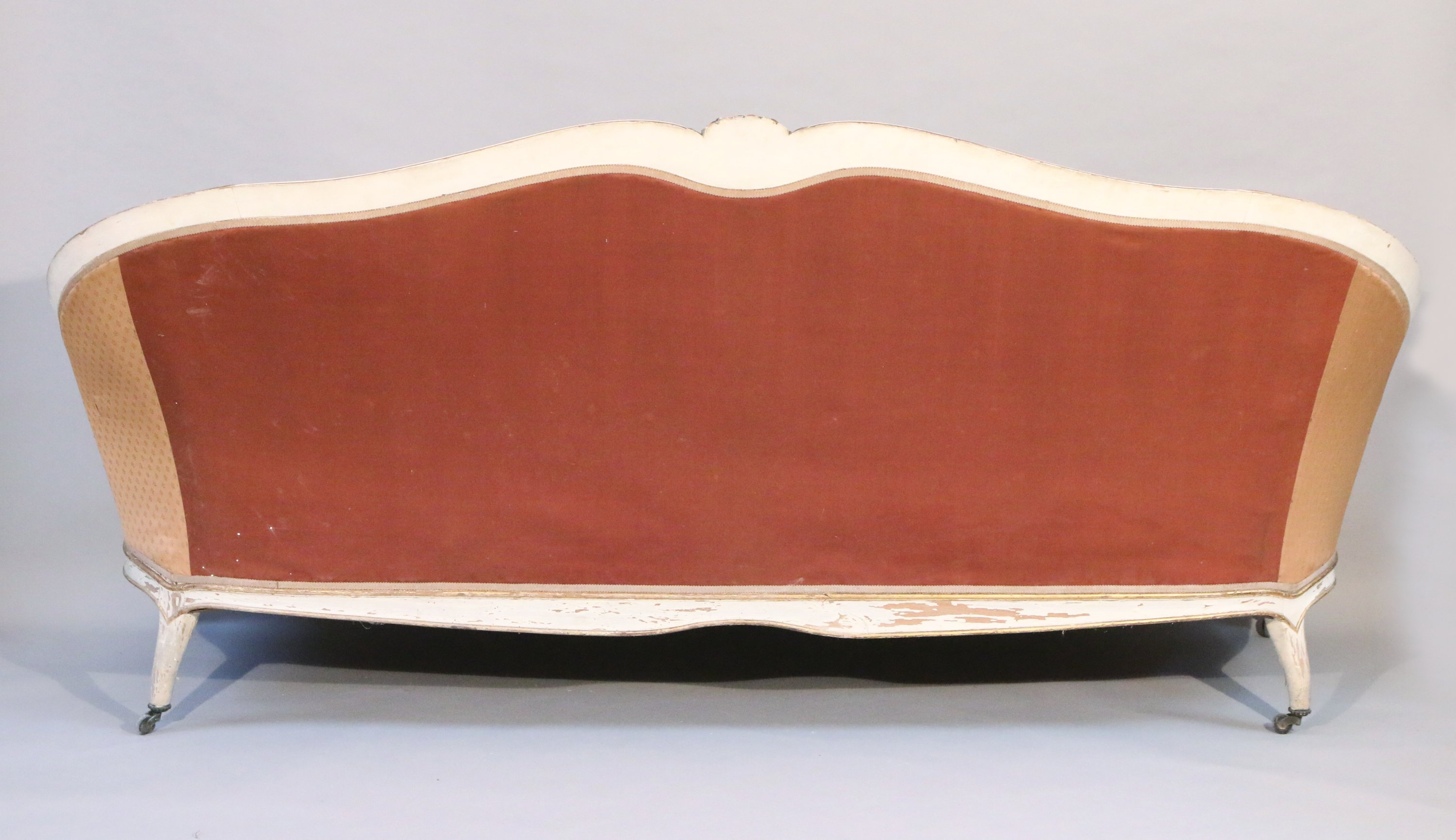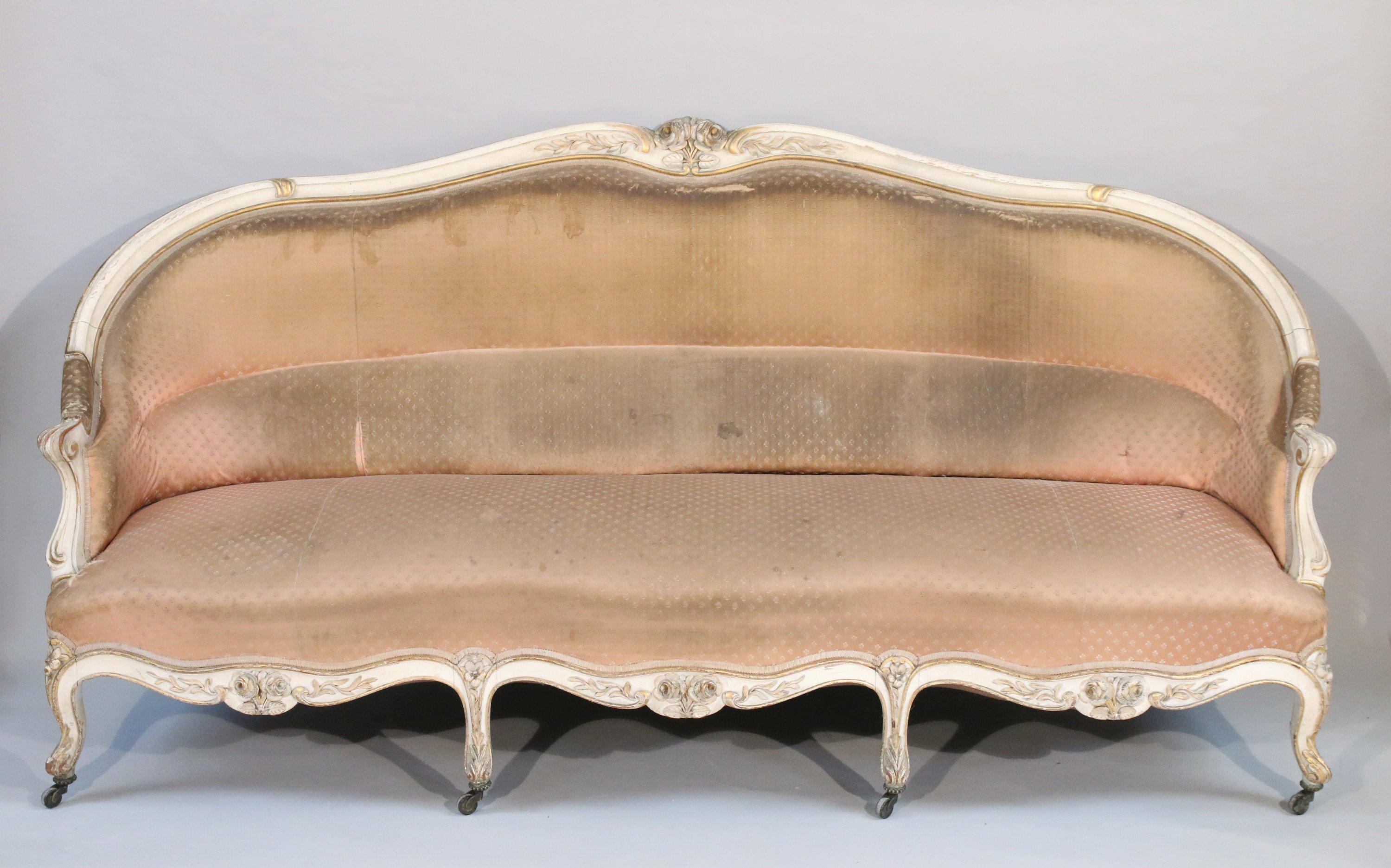en hêtre laqué blanc et mouluré, à décor sculpté et doré de roses. Il repose sur six pieds cambrés à roulette.
