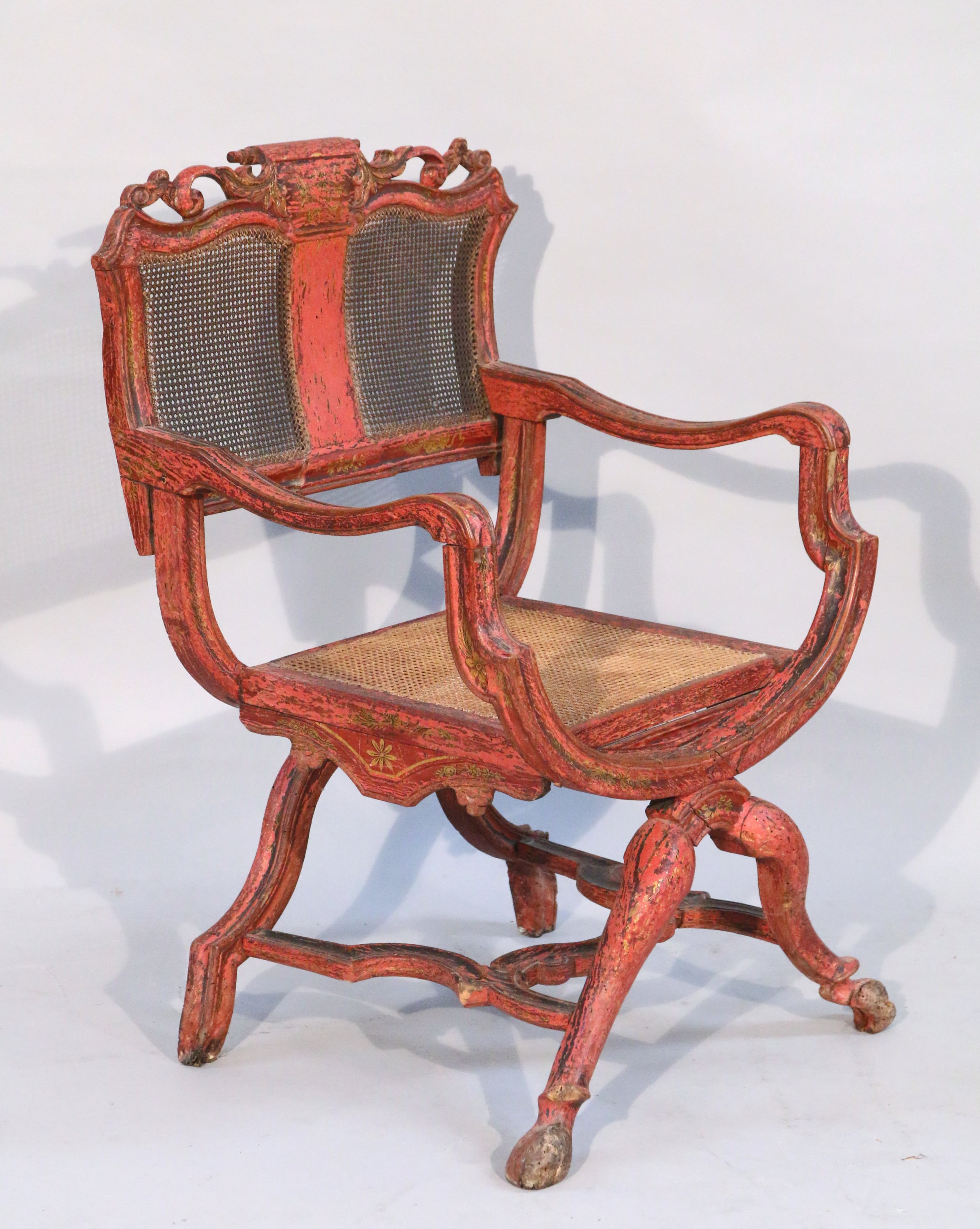 mouluré, sculpté, laqué rouge et rehaussé de fleurettes et feuillages peints de couleur or, l'amortissement à décor feuillagé. Quatre pieds réunis par une entretoise en "H". Montage ancien.