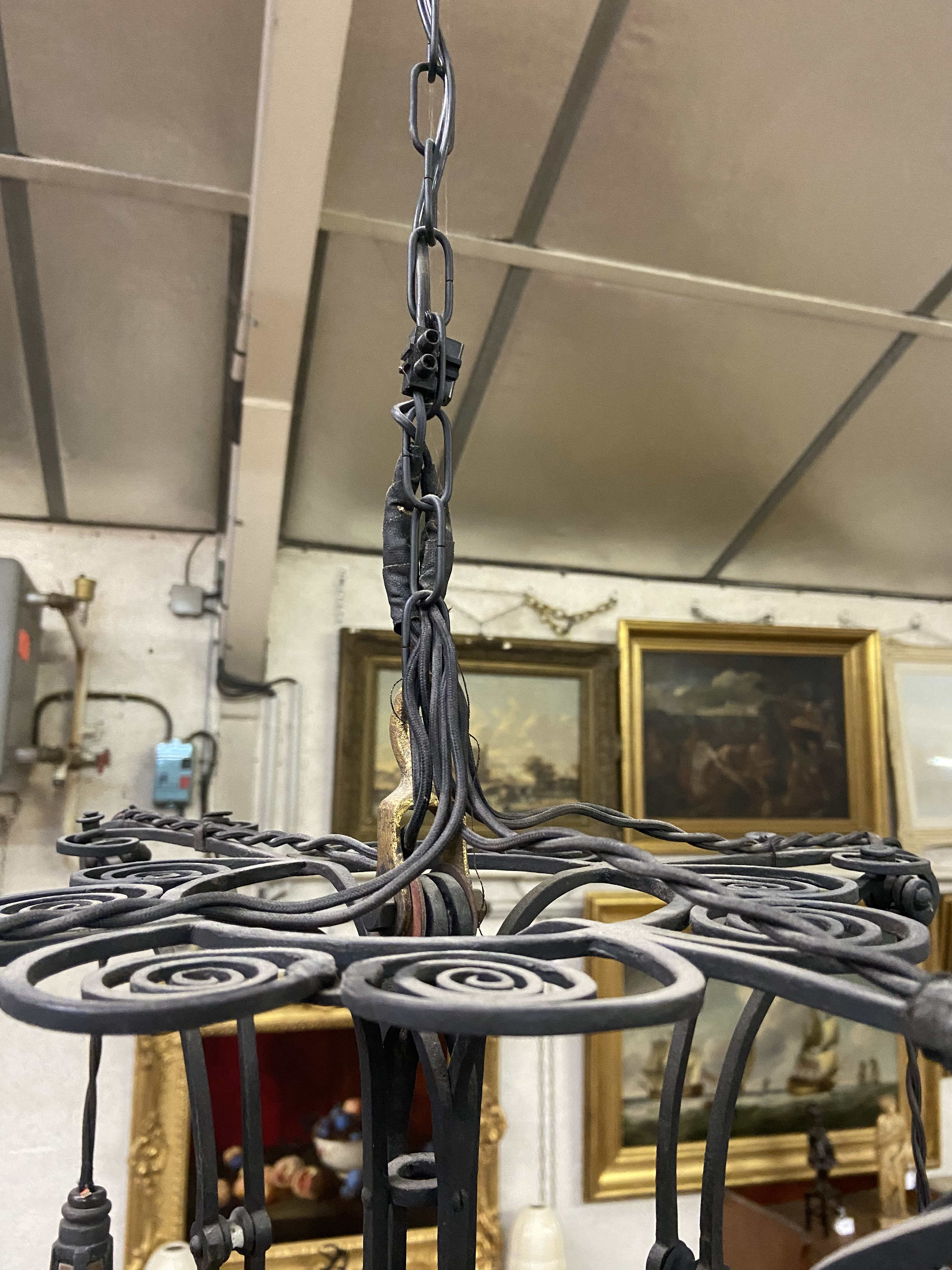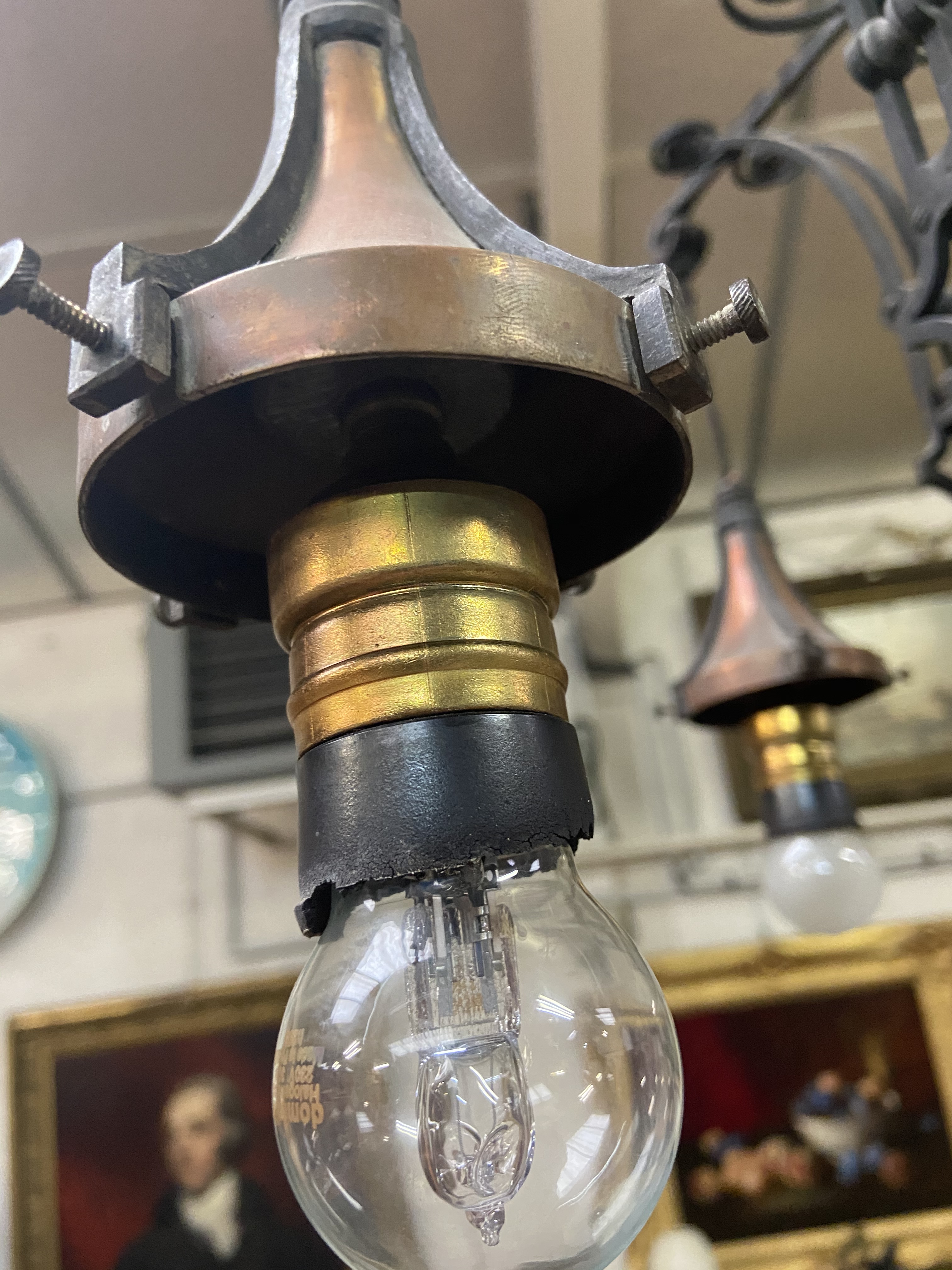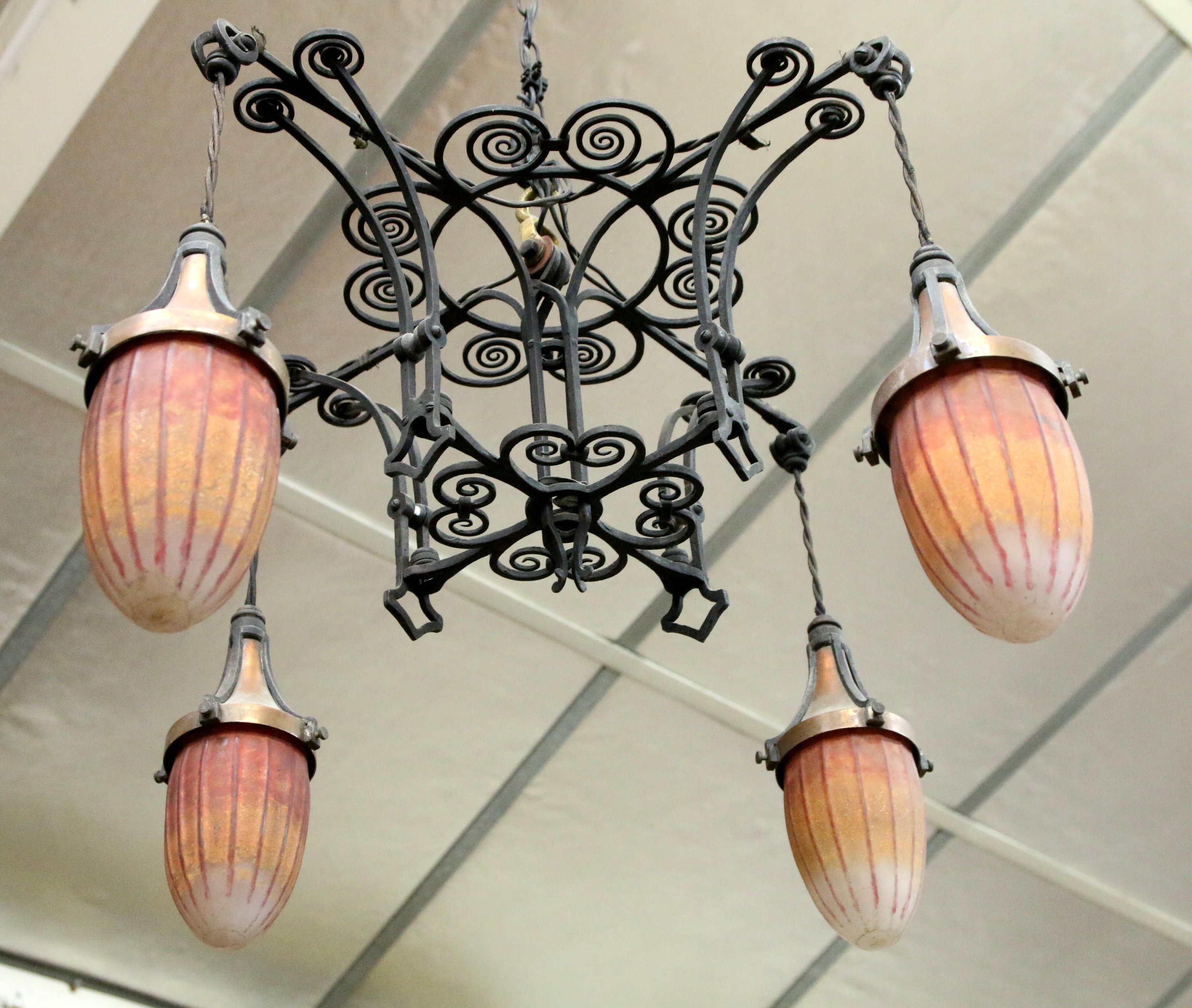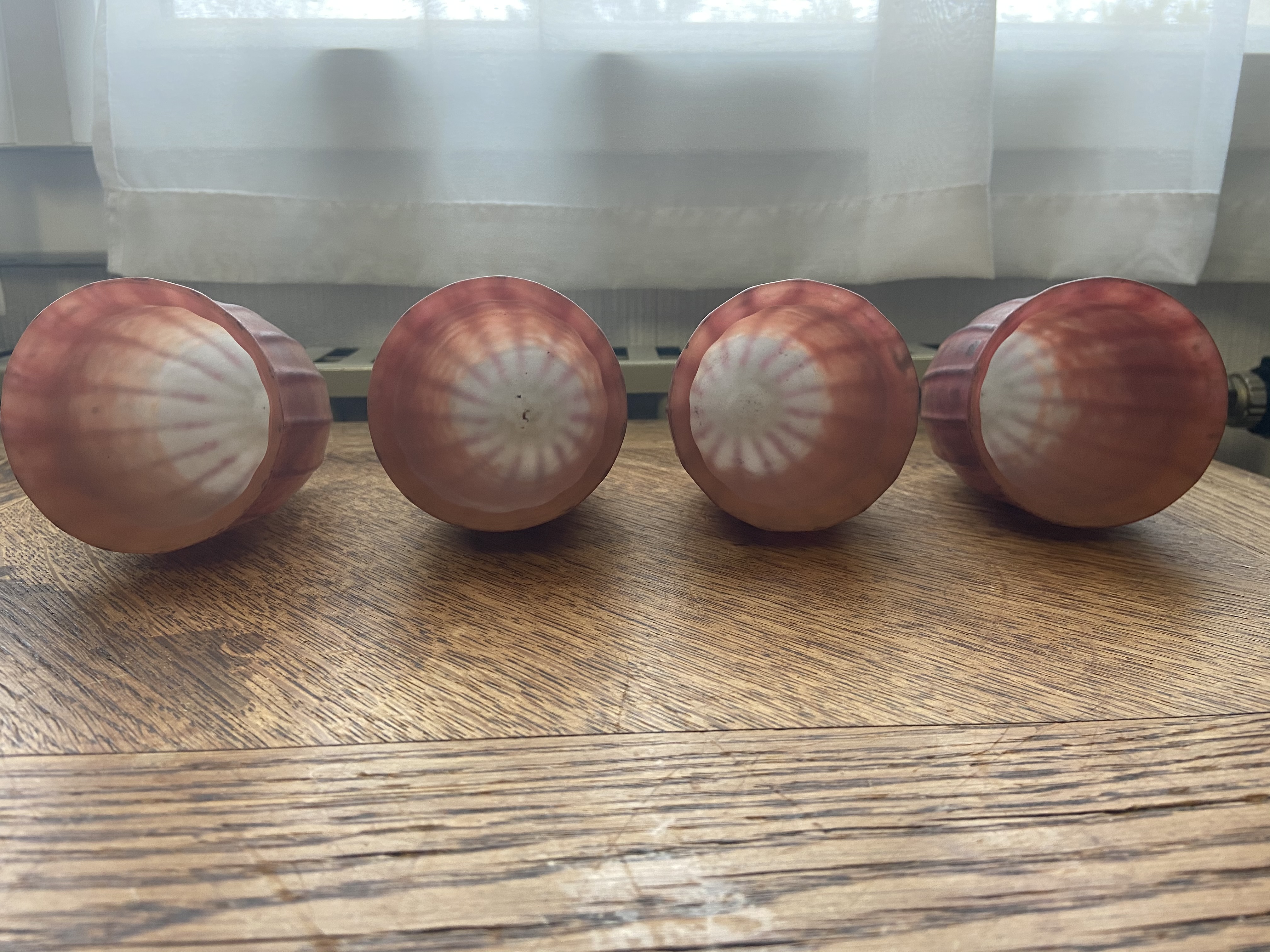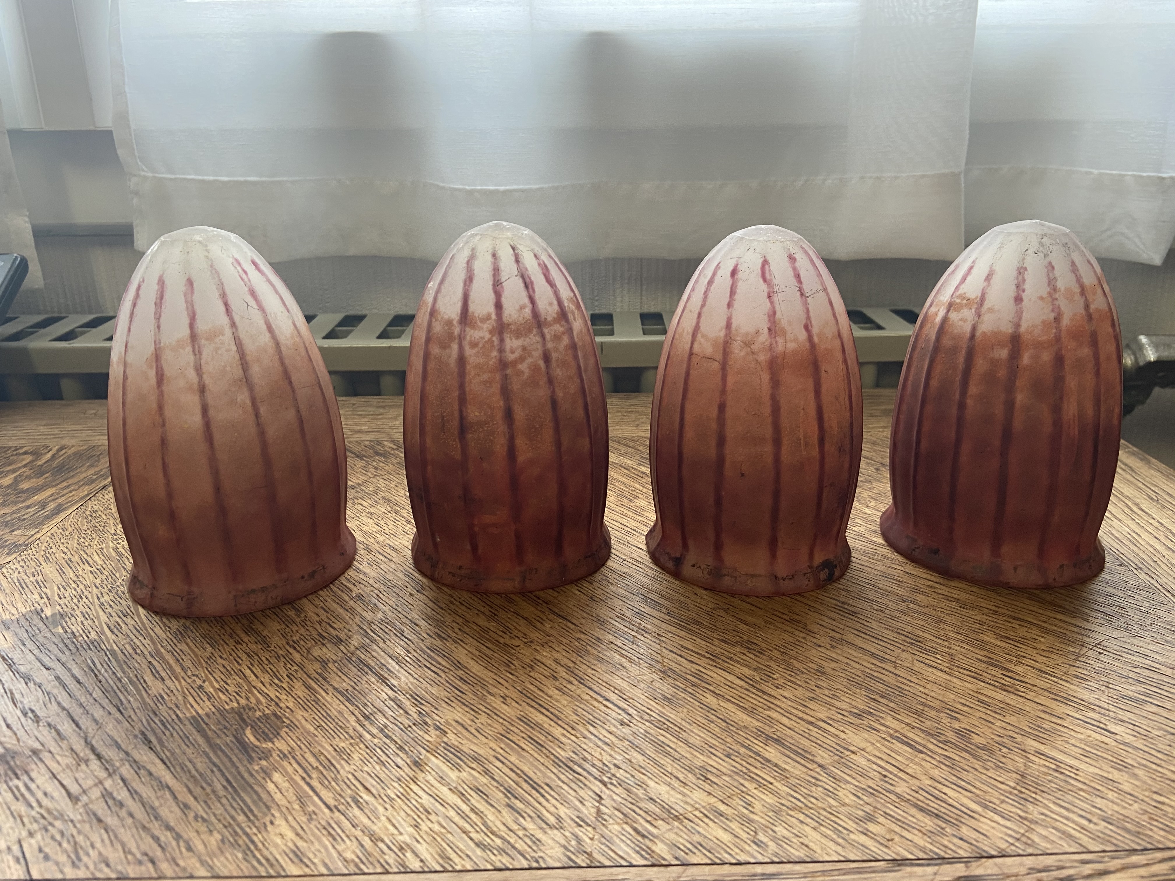 composé de quatre tulipes formant lumière en verre opaque à décor de striures et dégradé de couleur orange.