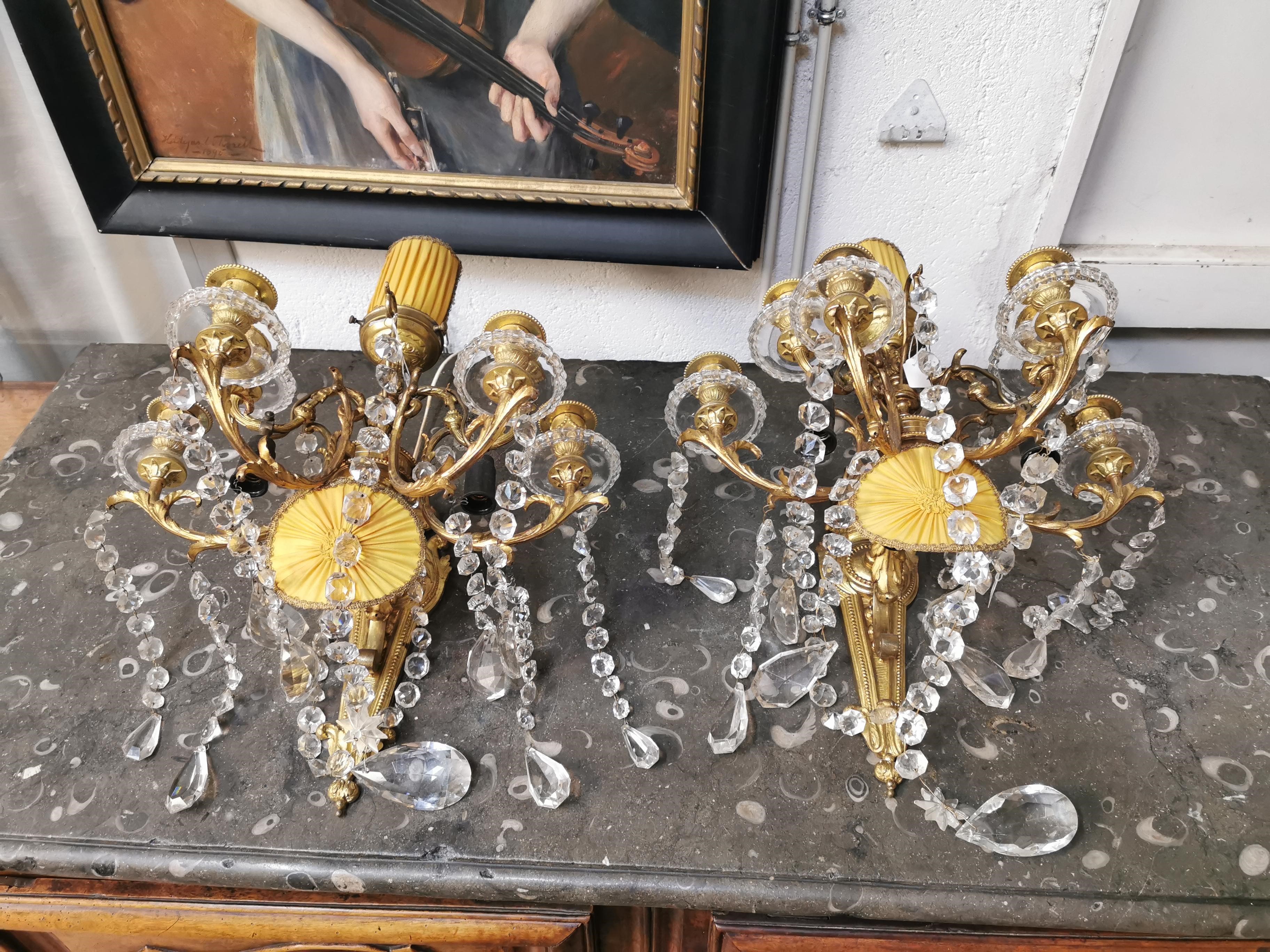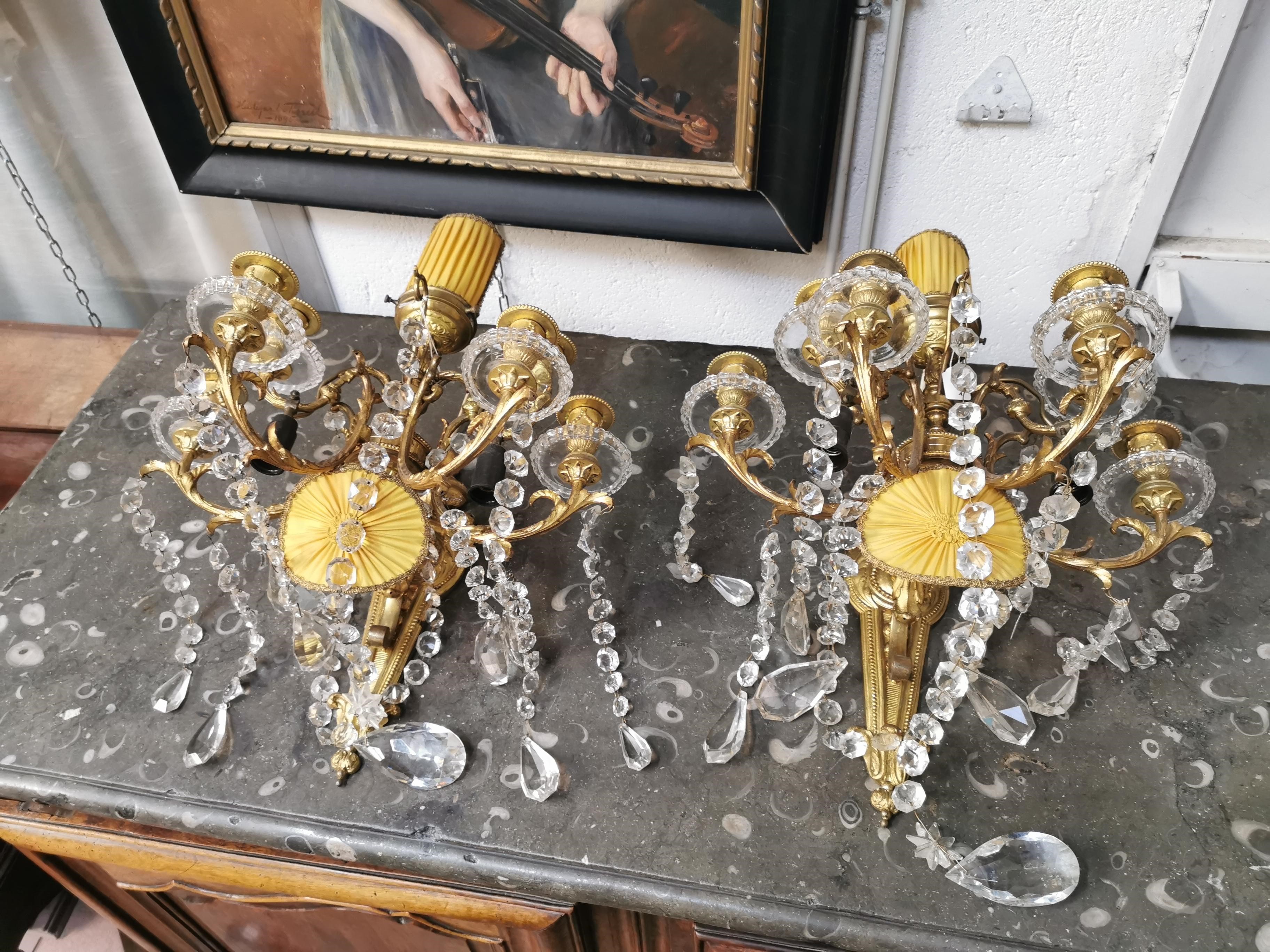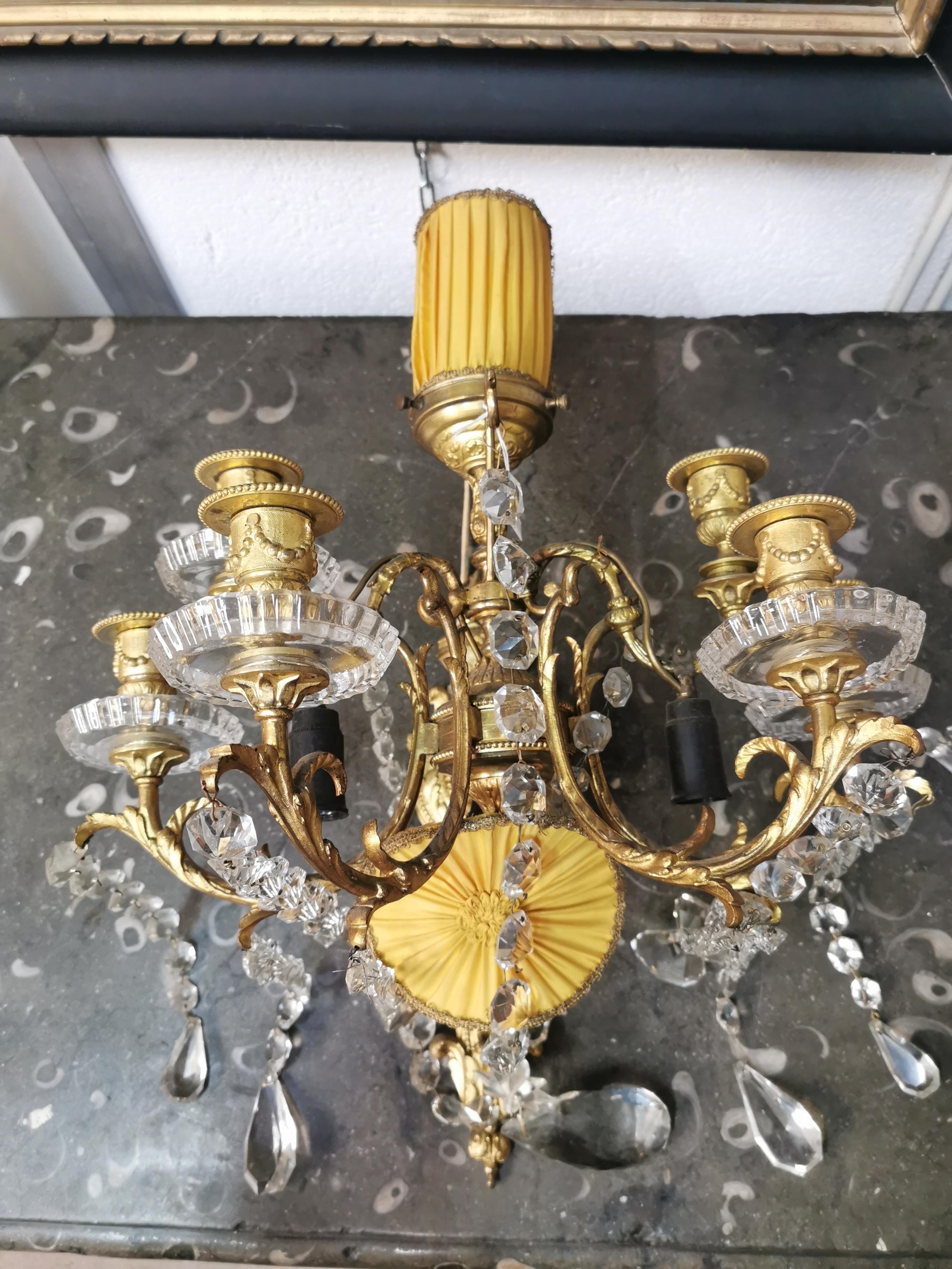 en bronze doré et pampilles en cristal, à sept bras de lumières feuillagés dont un électrifié surmonté d'un abat-jour, l'ensemble réunis par une plaque richement décorée de perles, feuilles et d'un pot à feu.