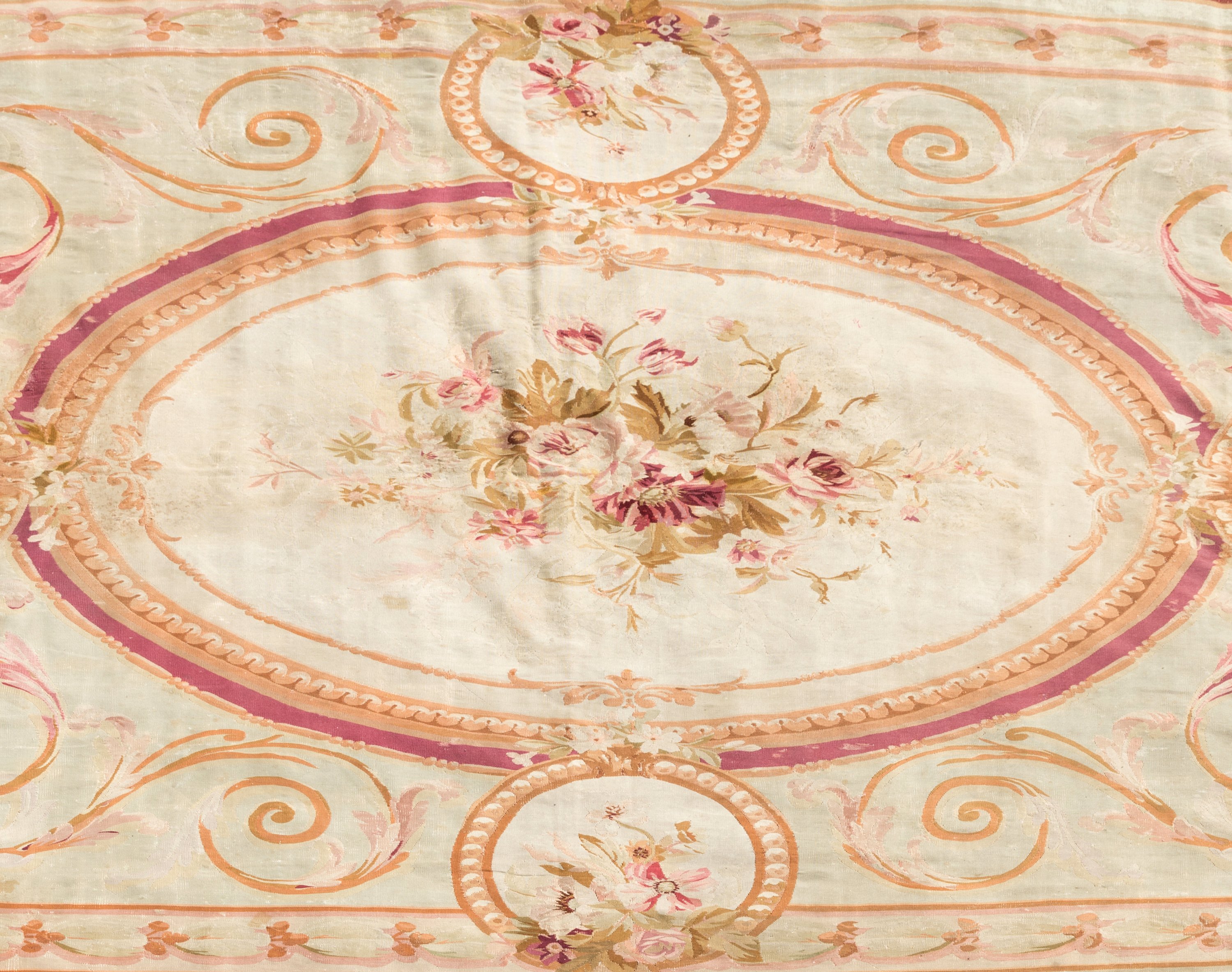 La manufacture d'Aubusson pousse à l'excellence la technique du point ras, reprenant la technique de la tapisserie, qui fait son renom. Au XIXe siècle, la surface des pièces est entièrement couverte par un textile, ce qui explique l'exceptionnelle superficie de plus de vingt-cinq mètres carrés de notre tapis, probablement réalisé sur mesure pour le salon d'apparat d'un hôtel particulier parisien ou d'un château en province, dont les tons sont assortis aux délicates couleurs de bouquets de roses.