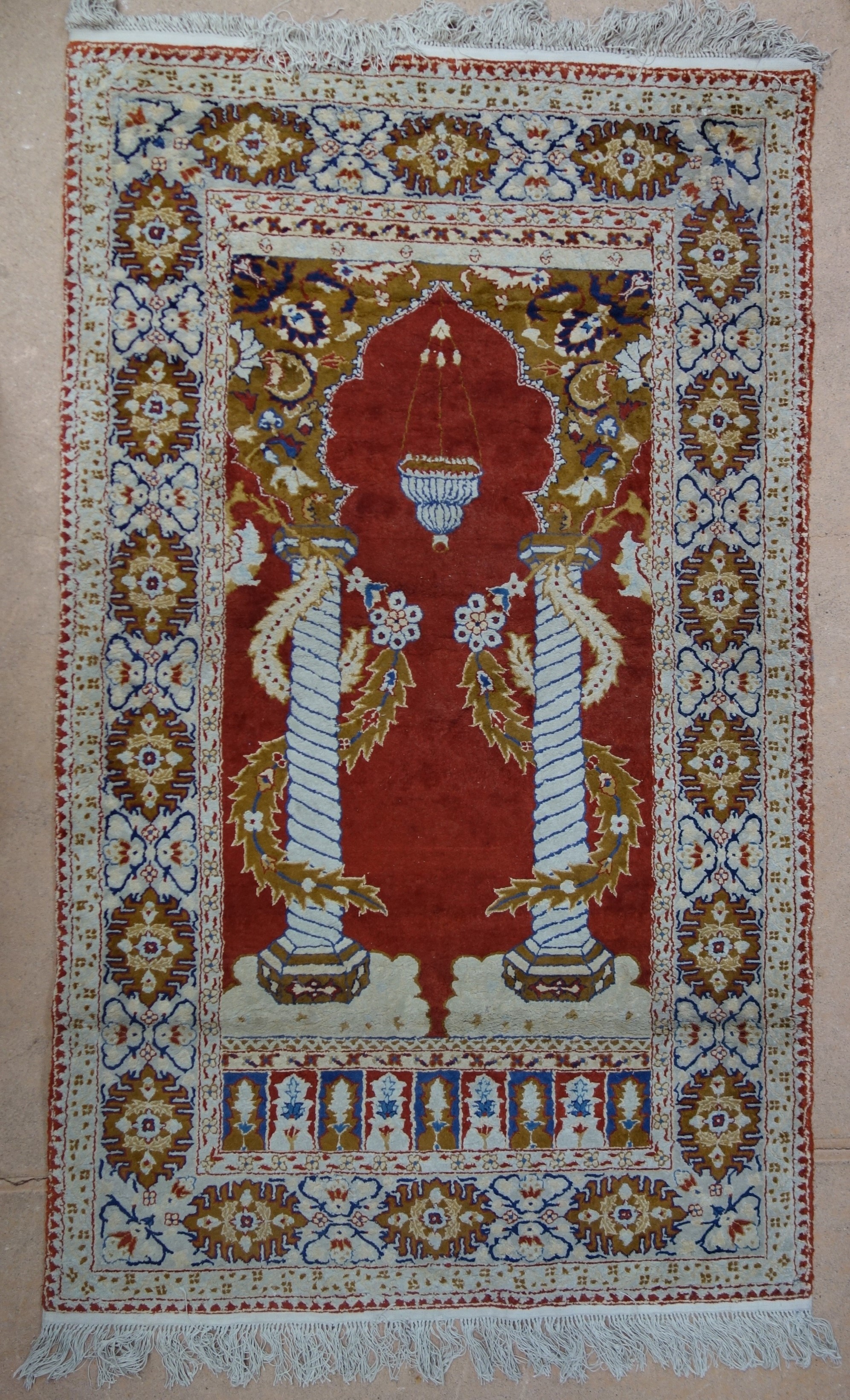 en laine et soie à points noués dit de prière à fond crème. Riche décor de feuillages stylisés centré d'un mirhab et d'une lampe de mosquée sur fond rouge.
