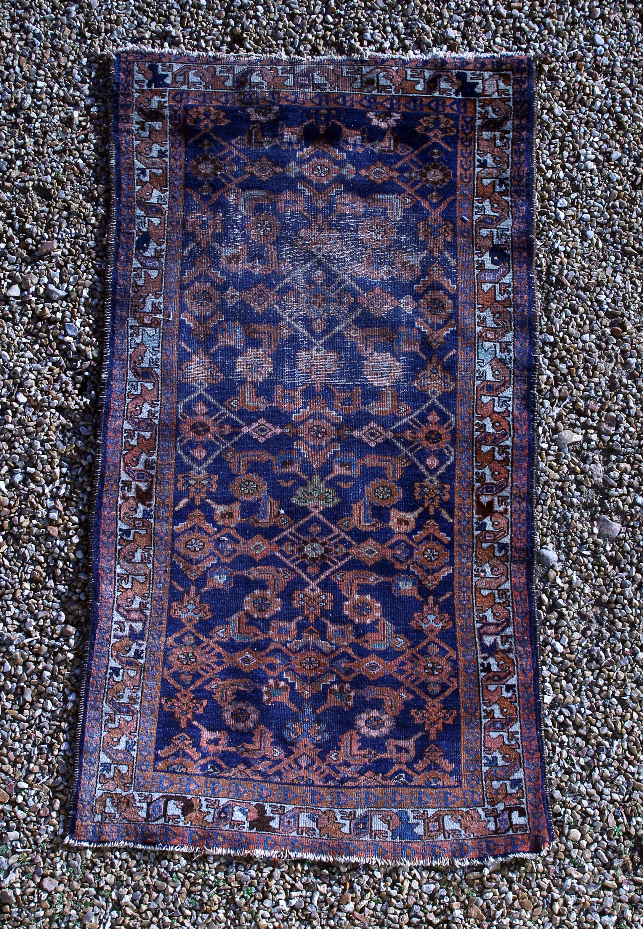 Tapis galerie, Nord Ouest de la Perse, fond bleu, décor rhylla de fleurs, bordure crème entre des galons (usures)