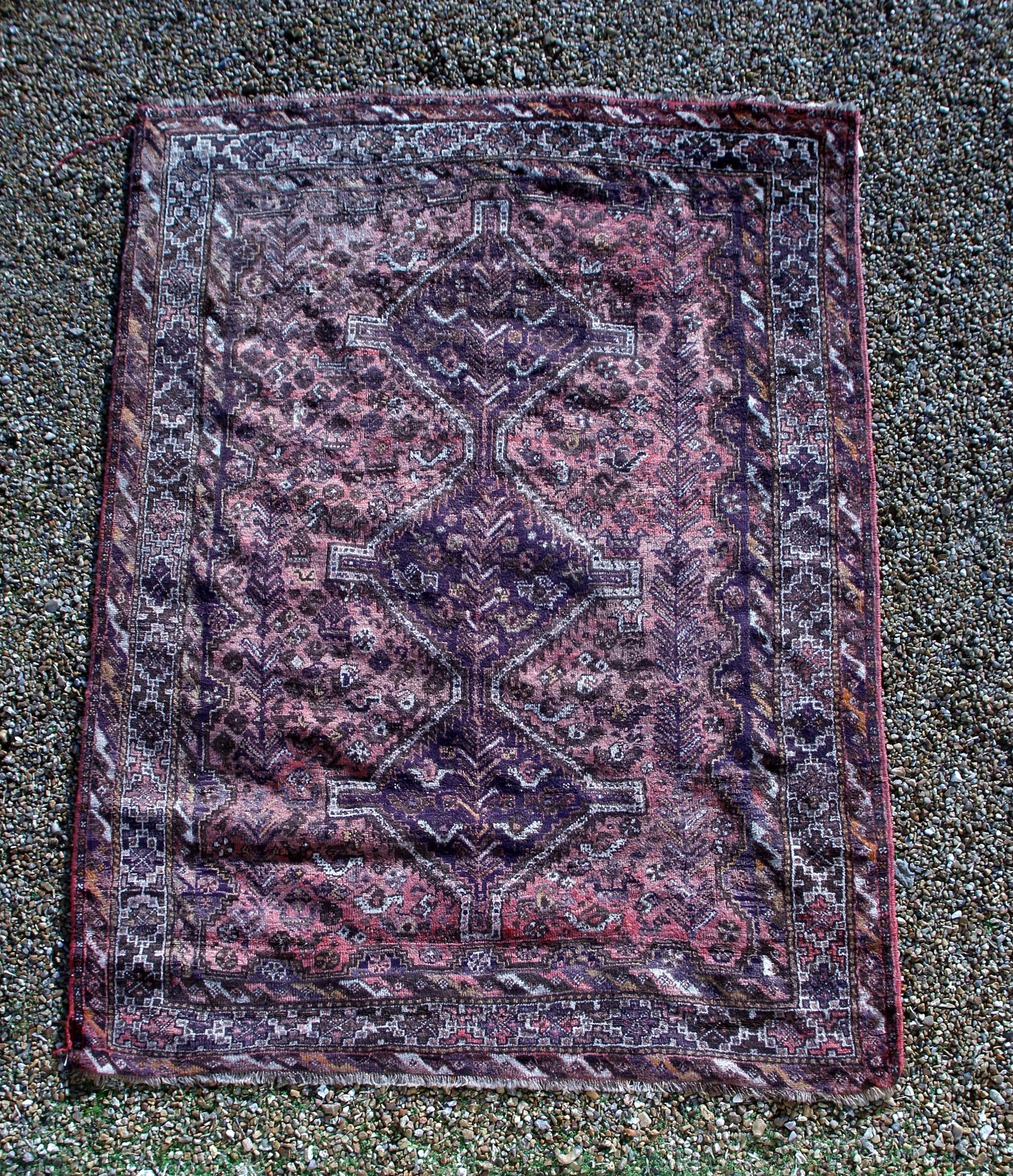Tapis Shiraz, fond rouge, décor d'un triple médaillon au milieu de fleurs et oiseaux, bordure crème de motifs géométriques (usures)