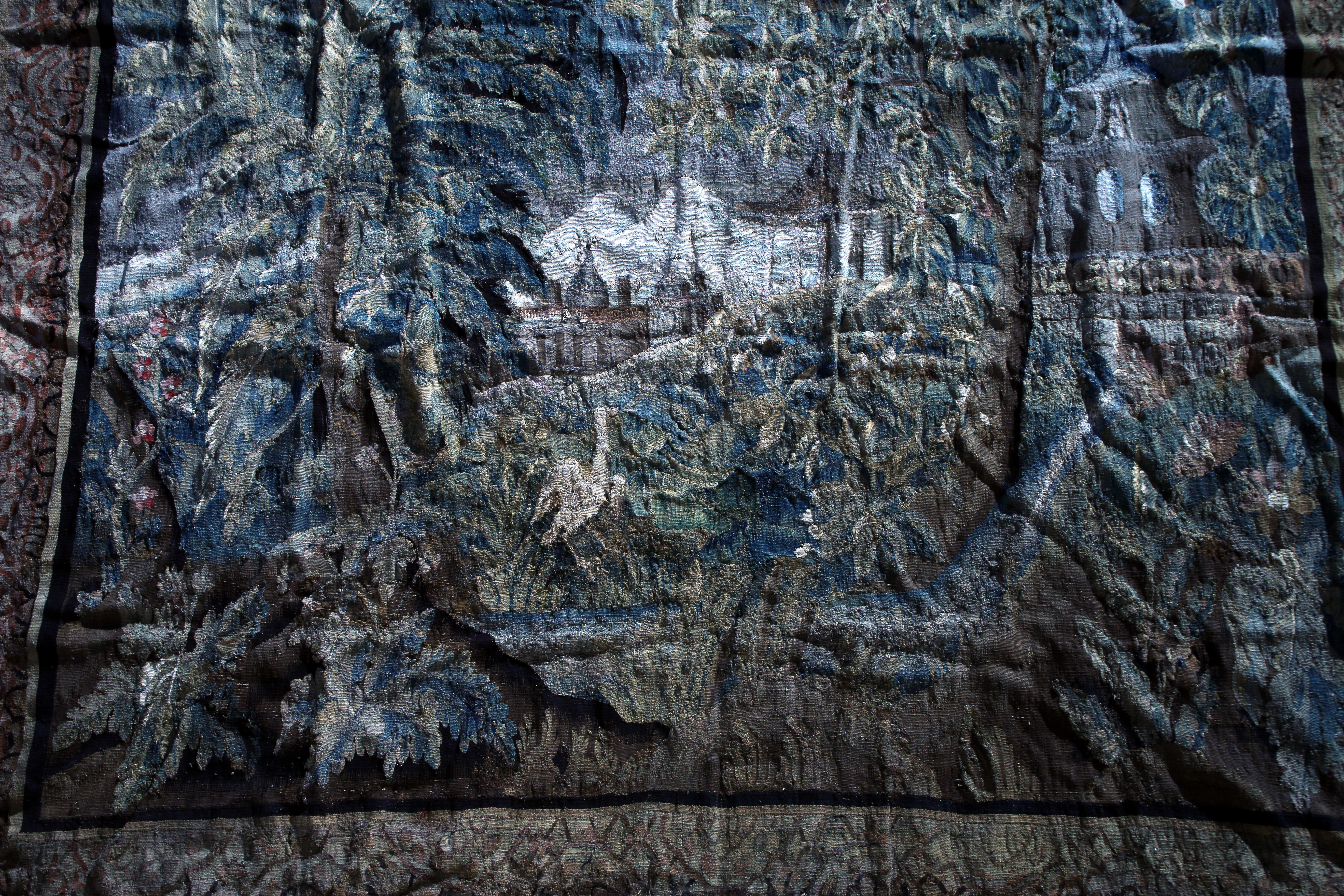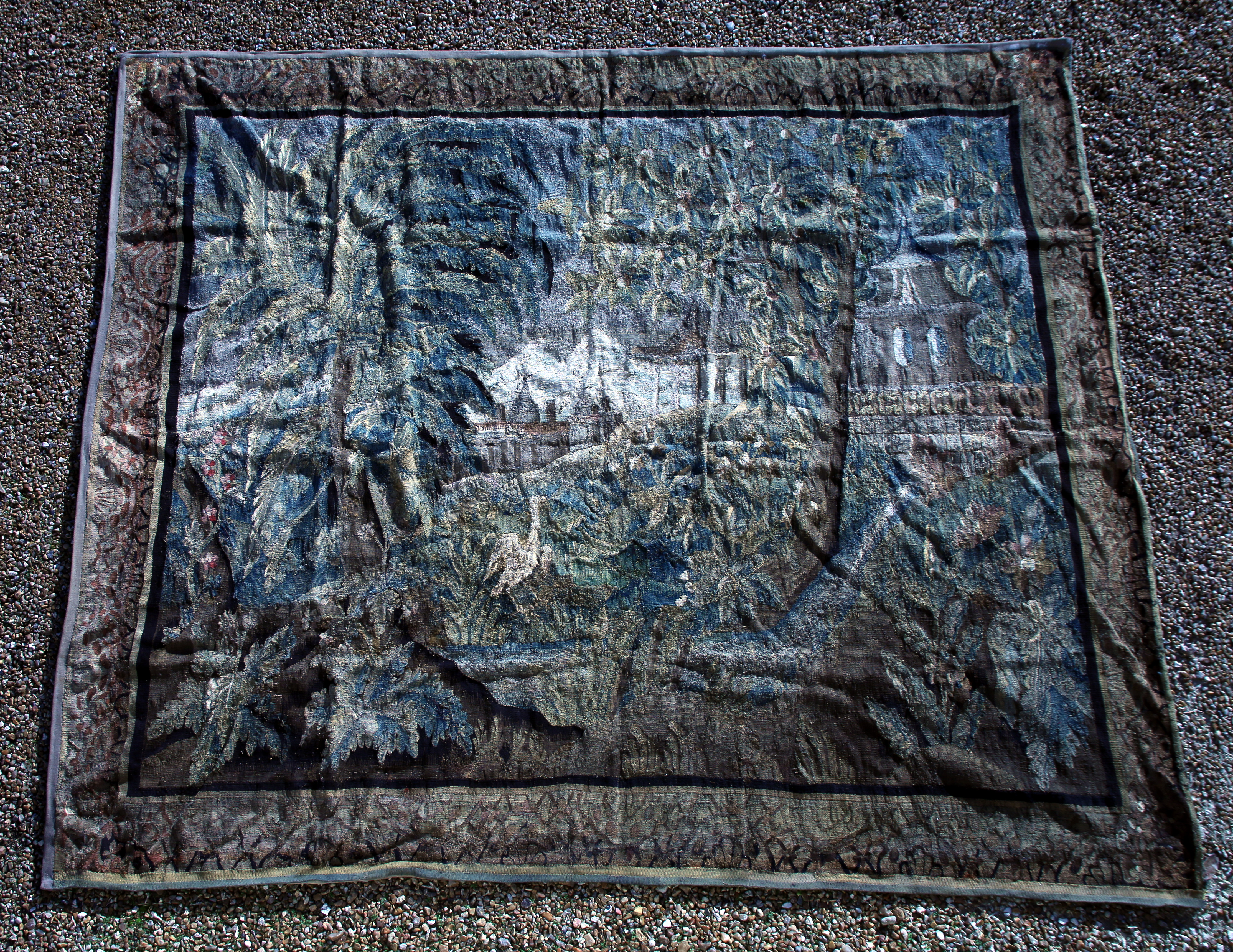 Tapisserie, laine et soie, Aubusson - Felletin, XVIIIème siècle, d'après Pillement, verdure dite exotique à la rivière, palmier, échassier, pagode et tente tartare, avec une bordure d'un cadre figuré (usures, bordure possiblement rentrayée)