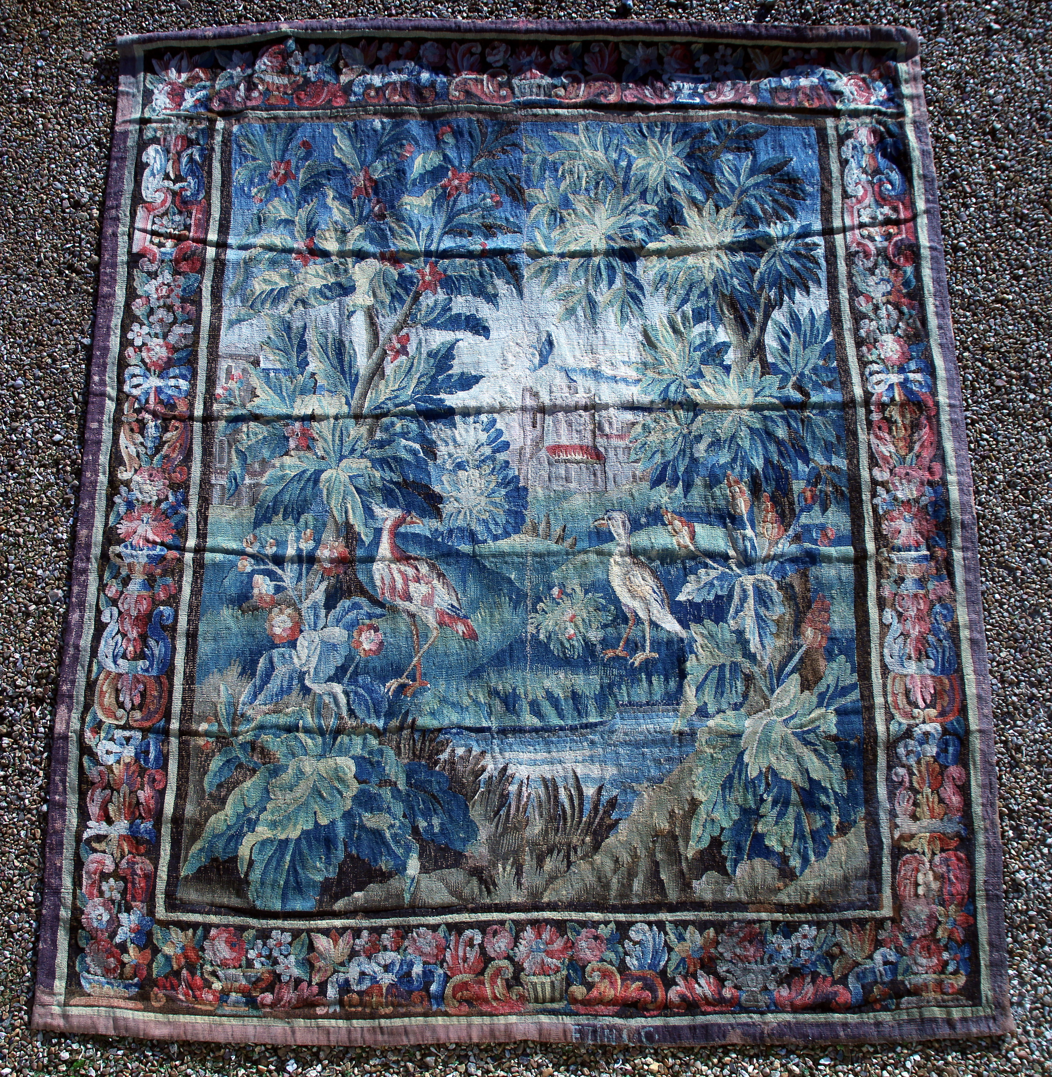 Verdure dite exotique dans la suite des cartons de Pillement, avec palmier, latanier, château, rivière et oiseau, bordure à fond noir de fleurs, palmes et rinceaux, porte la marque tissée "FTINC.C".