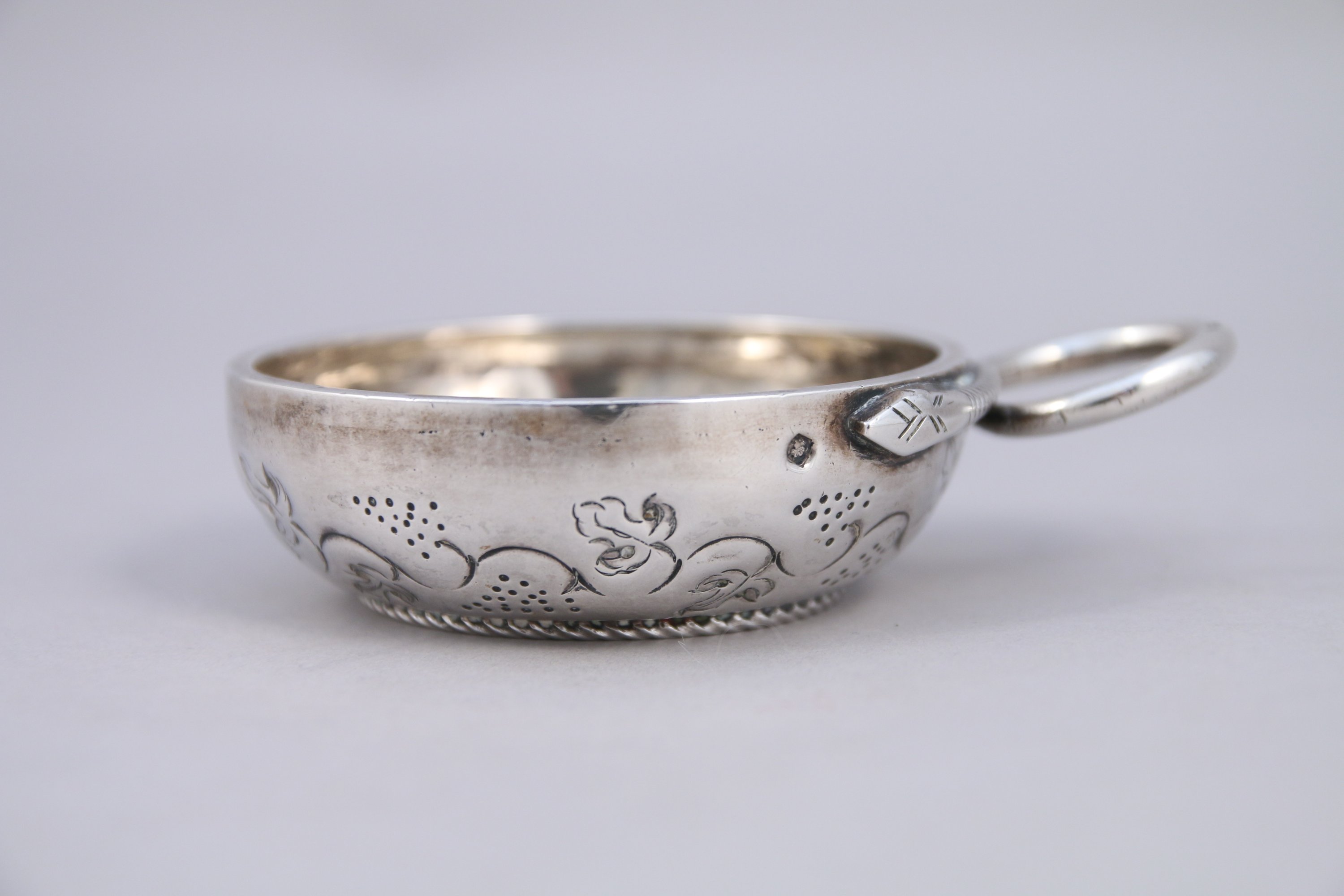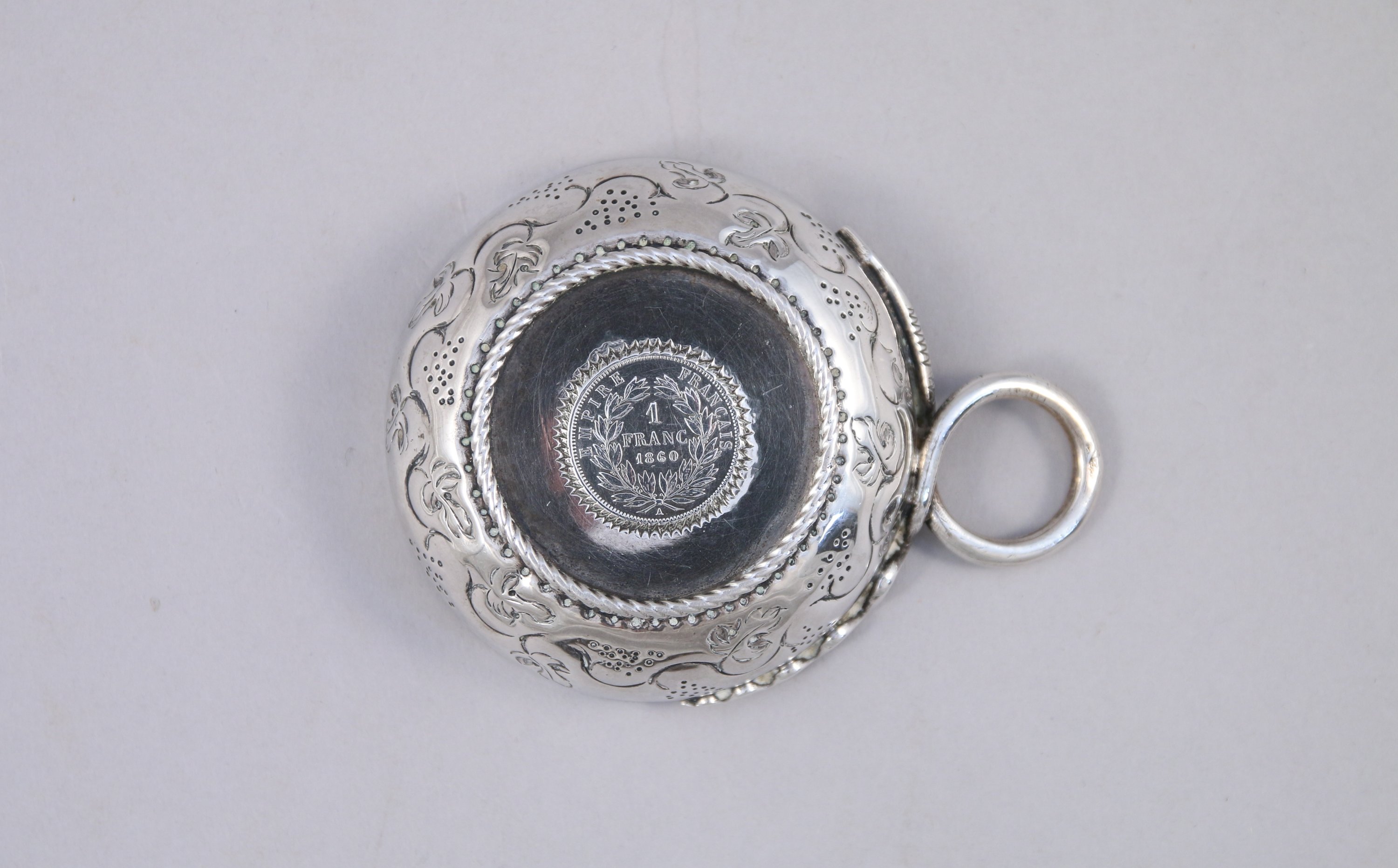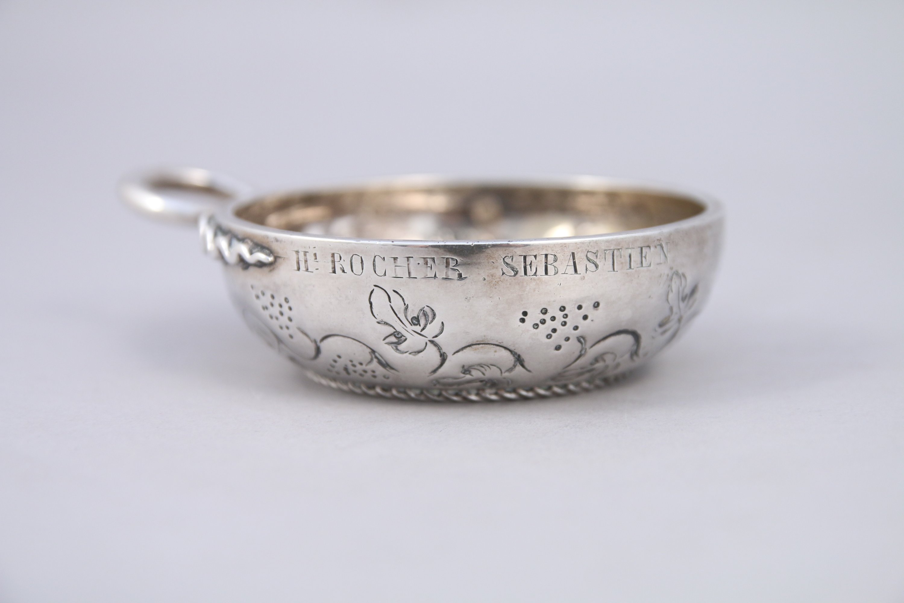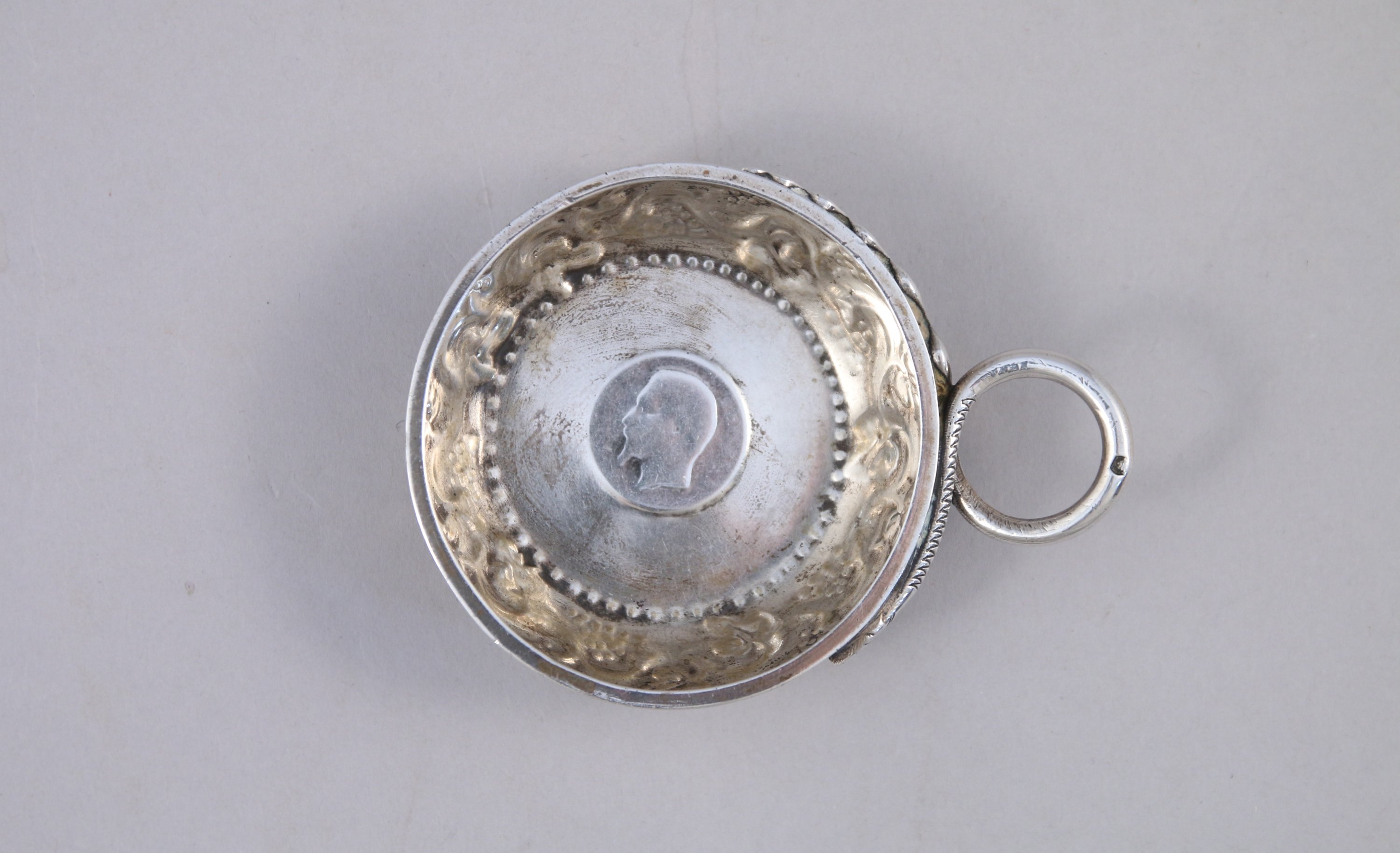 TASTE-VIN en argent la panse à décor en repoussé de pampres de vigne et raisins. La anse en forme de serpent stylisé. Le fond composé d'une pièce de 1 franc, 1860, Napoléon III. Inscrit sur le col "H. ROCHER SEBASTIEN".