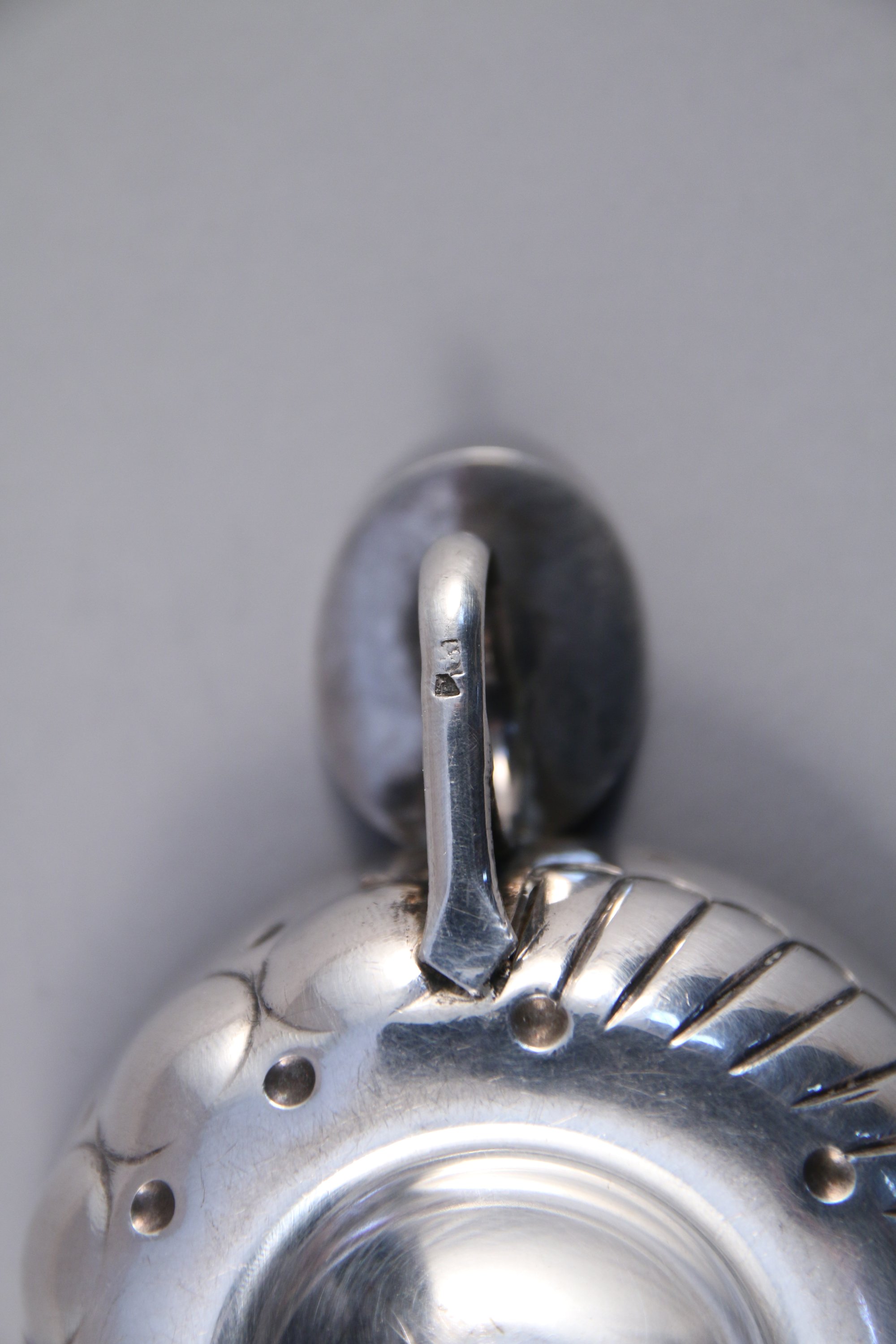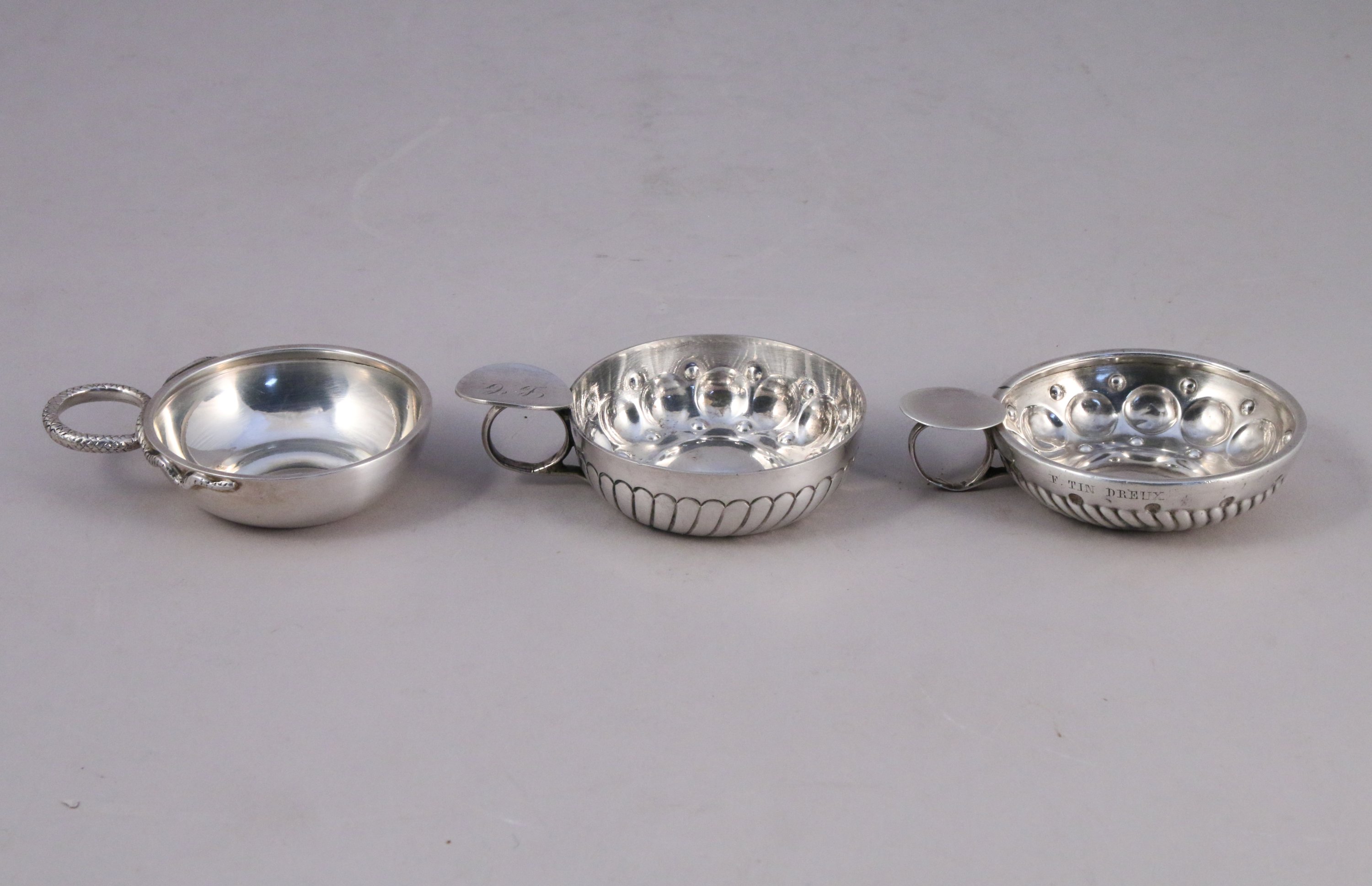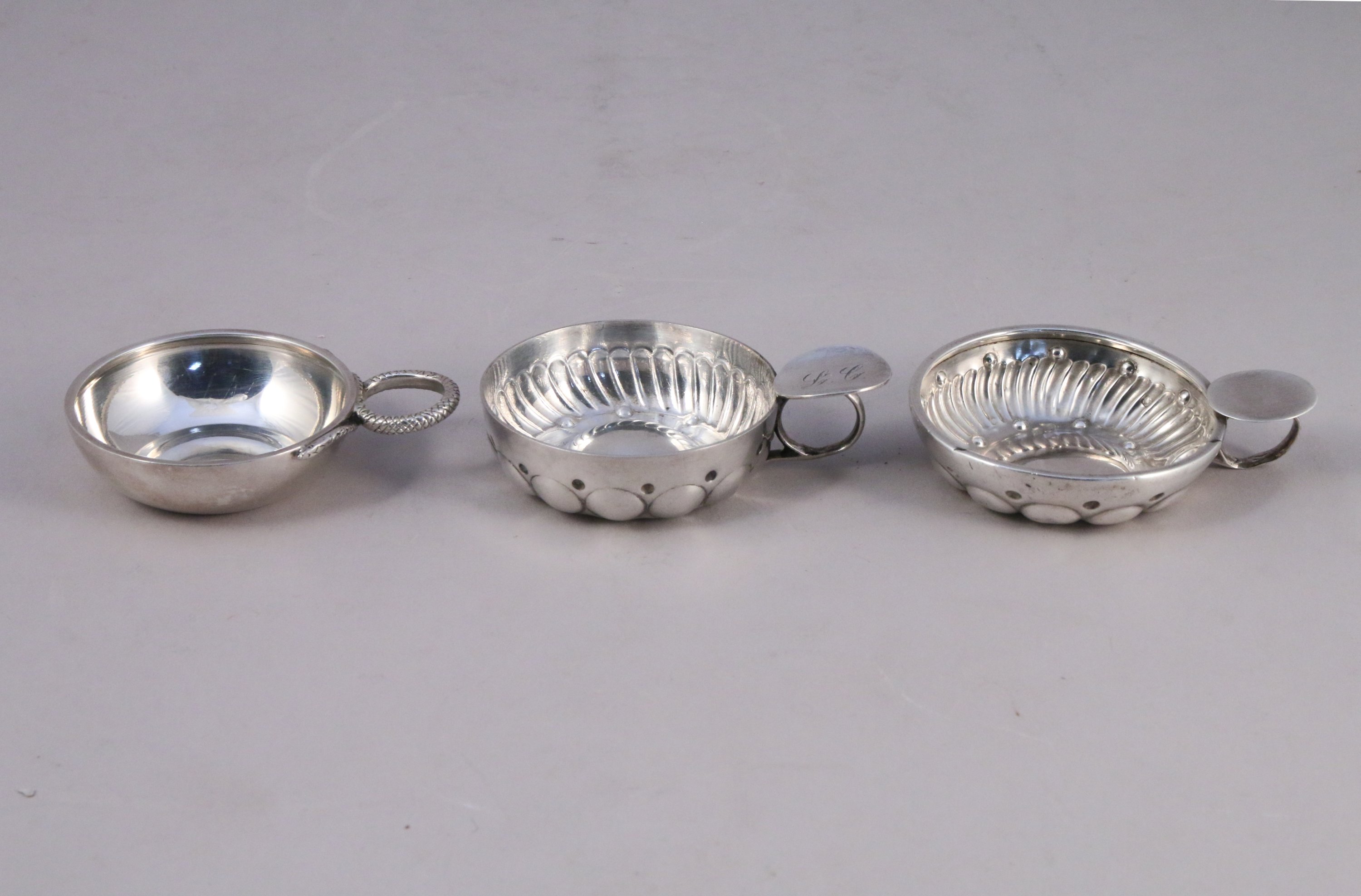 -TASTEVIN à décor de godrons, perles et cupules marqué "F TIN DREUX". Appui-pouce de forme ovale agrémenté d'une prise en anneau monogrammé. Poinçon Minerve XIXe. Diam. 7 cm. Poids 51 g.