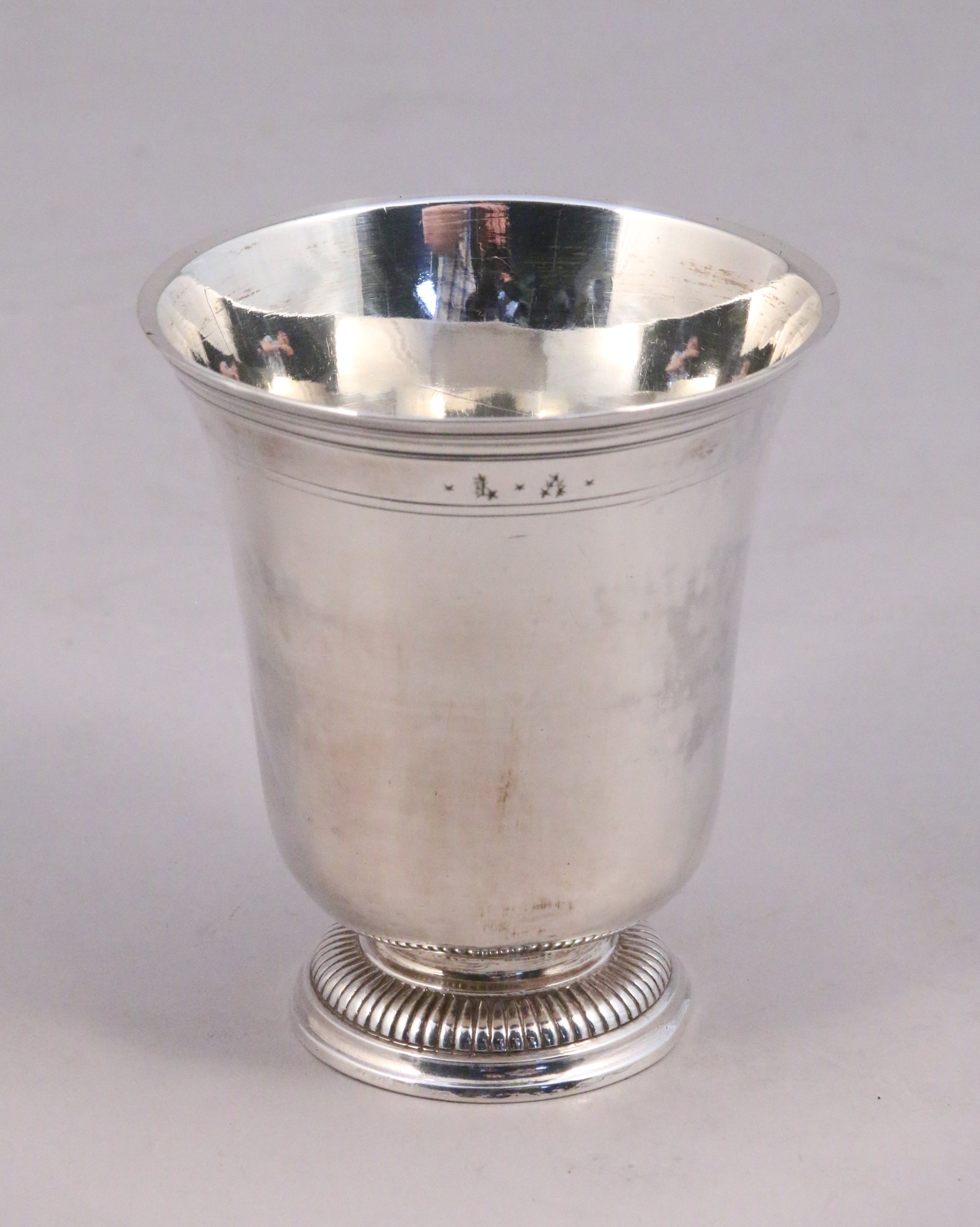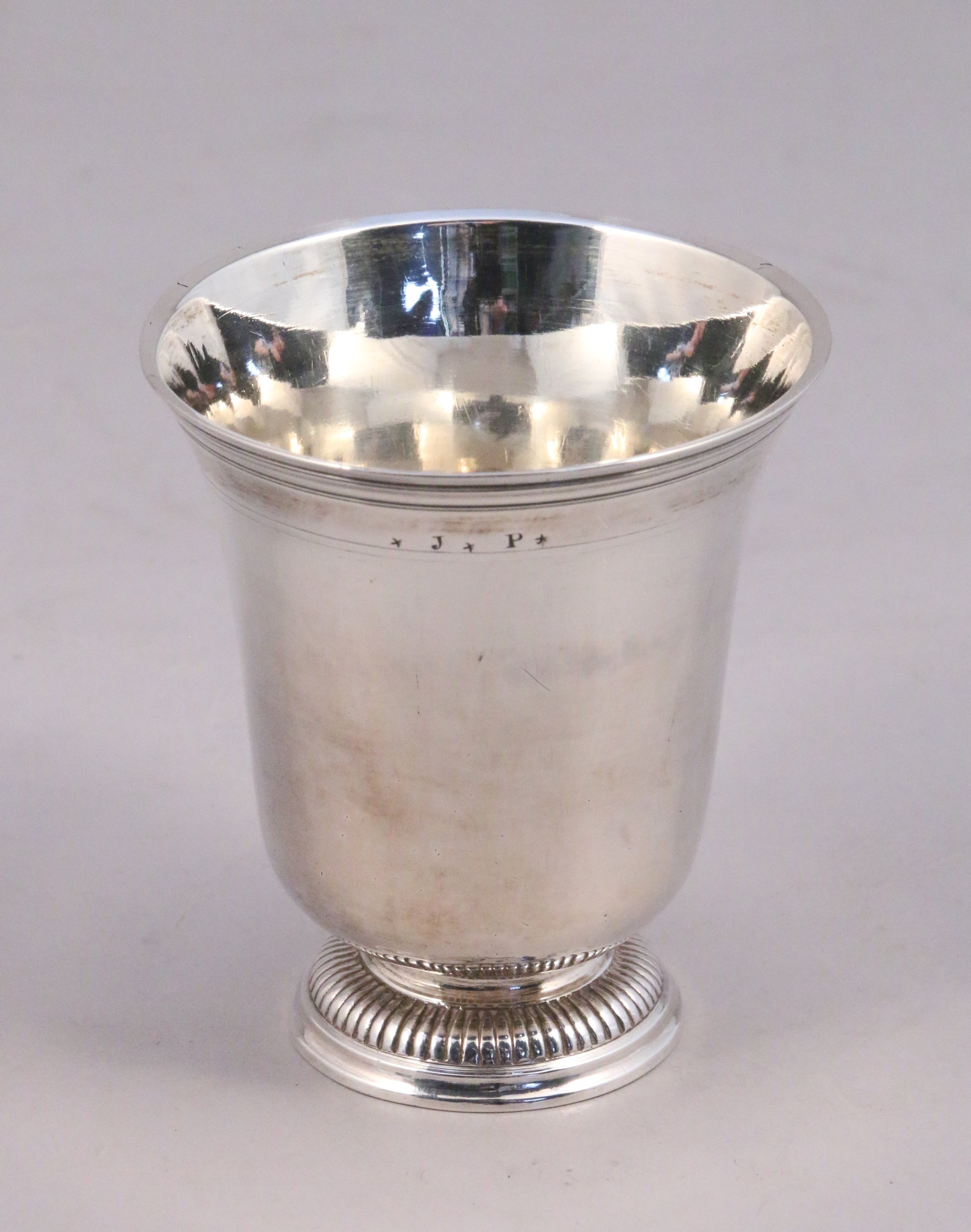 PARIS. TIMBALE TULIPE en argent uni reposant sur un piédouche orné d'une frise de godrons. Le col souligné de filets gravé des lettres "L A" et "JP"