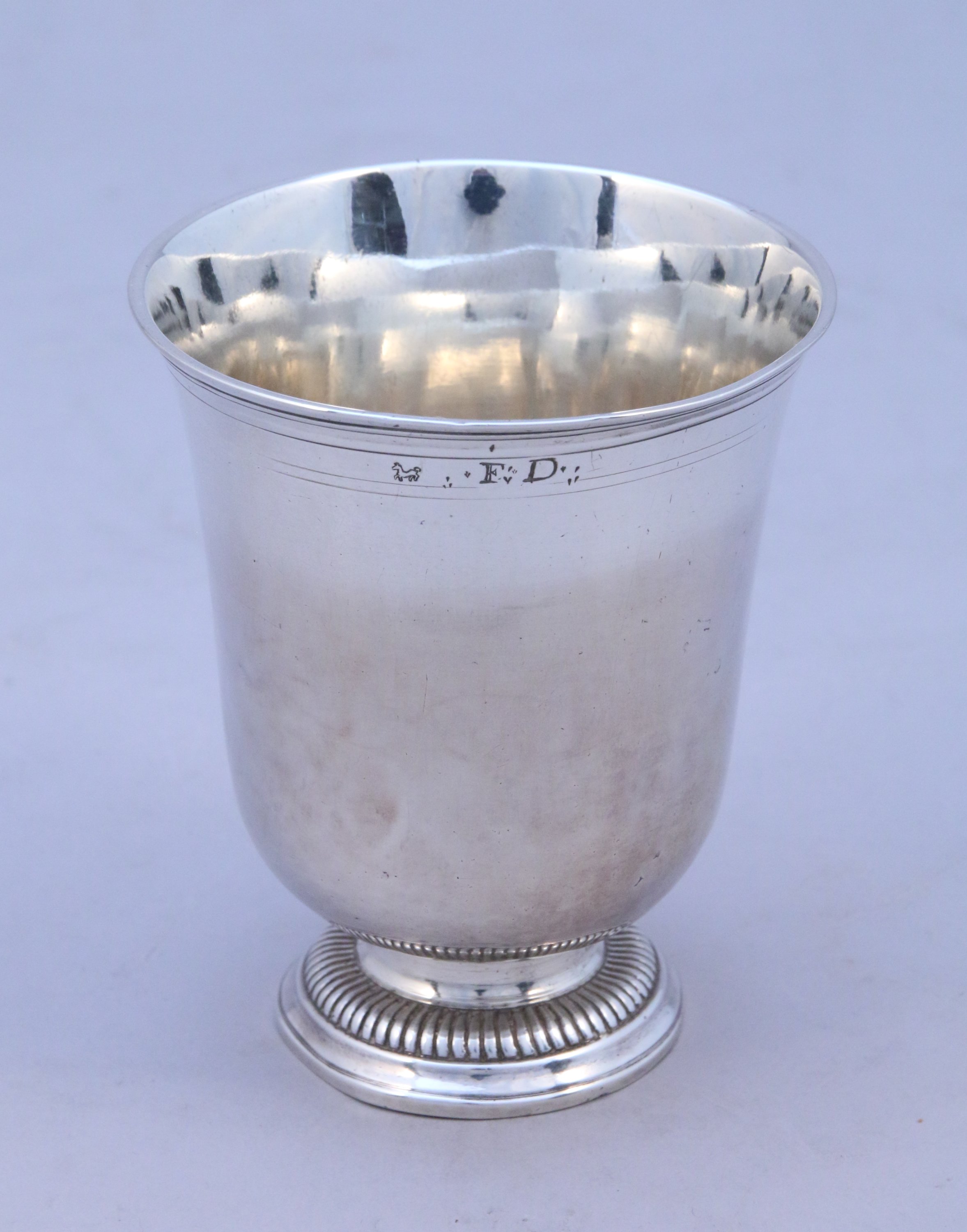 PARIS.TIMBALE TULIPE en argent uni reposant sur un piédouche orné d'une frise de godrons. Le col souligné de filets gravé des lettres "FD".
