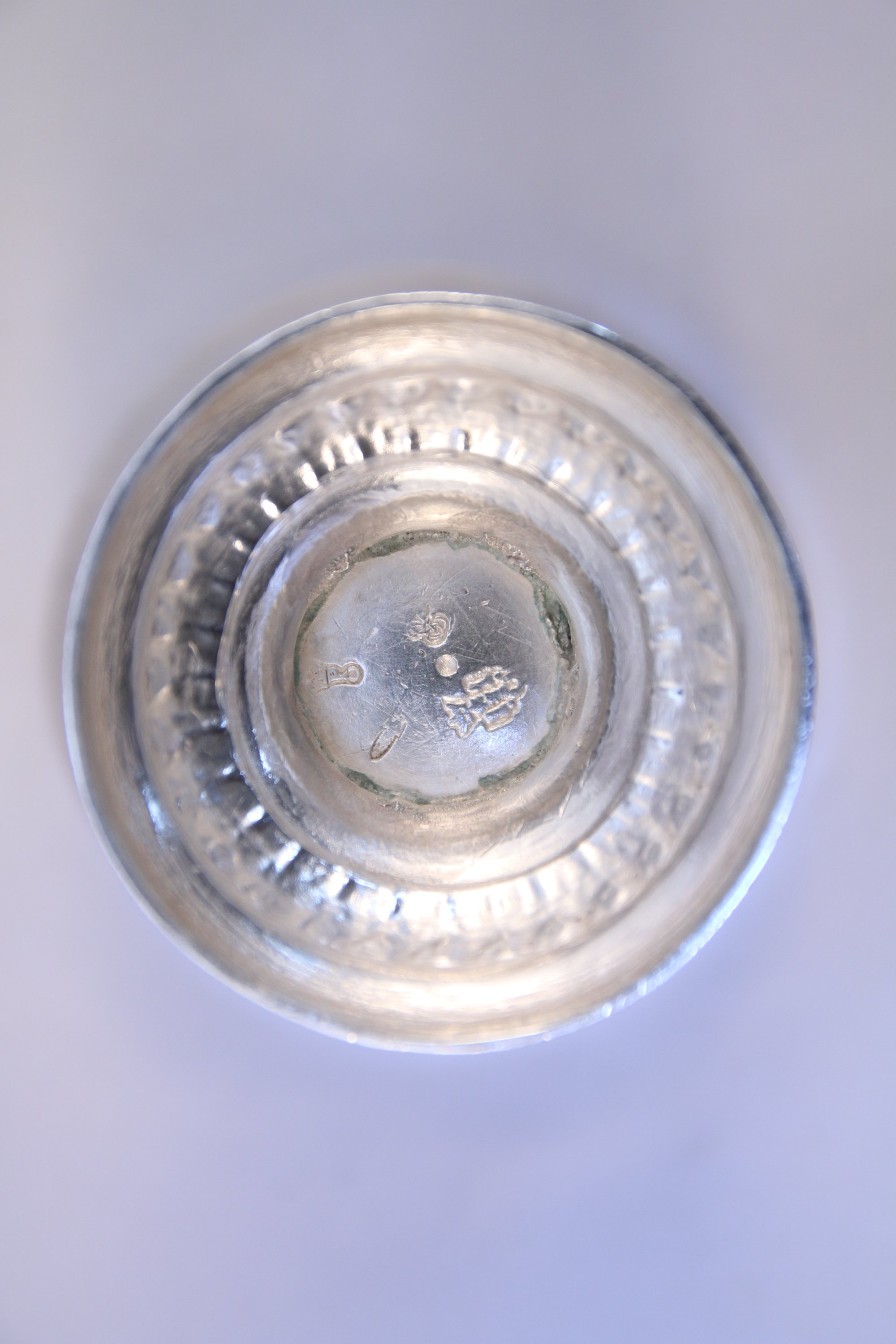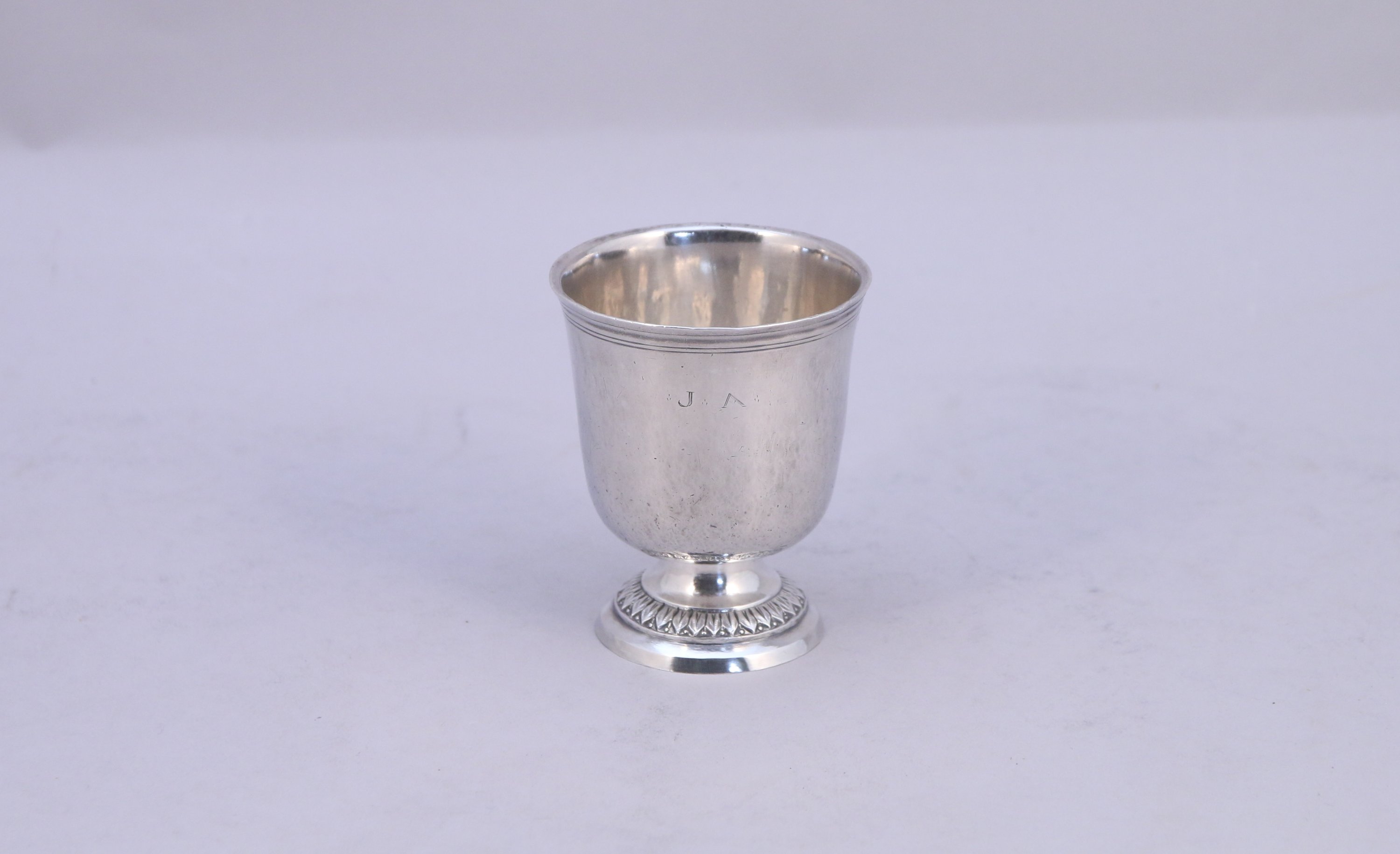 SAINTE-MENEHOULDE. TIMBALE TULIPE en argent, la bordure soulignée de filets. Piédouche à décor sur le pourtour d'un frise de feuilles d'eau.