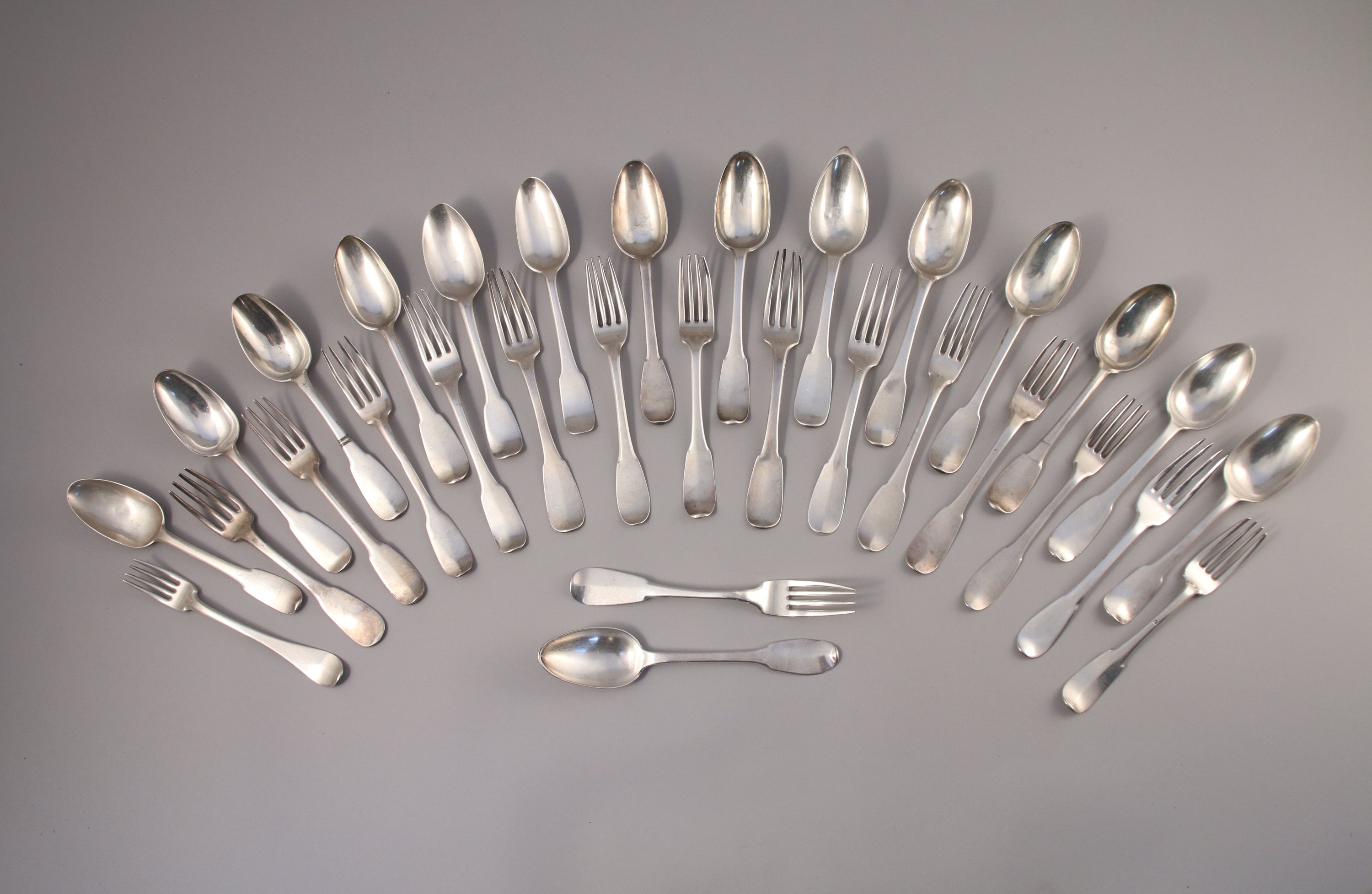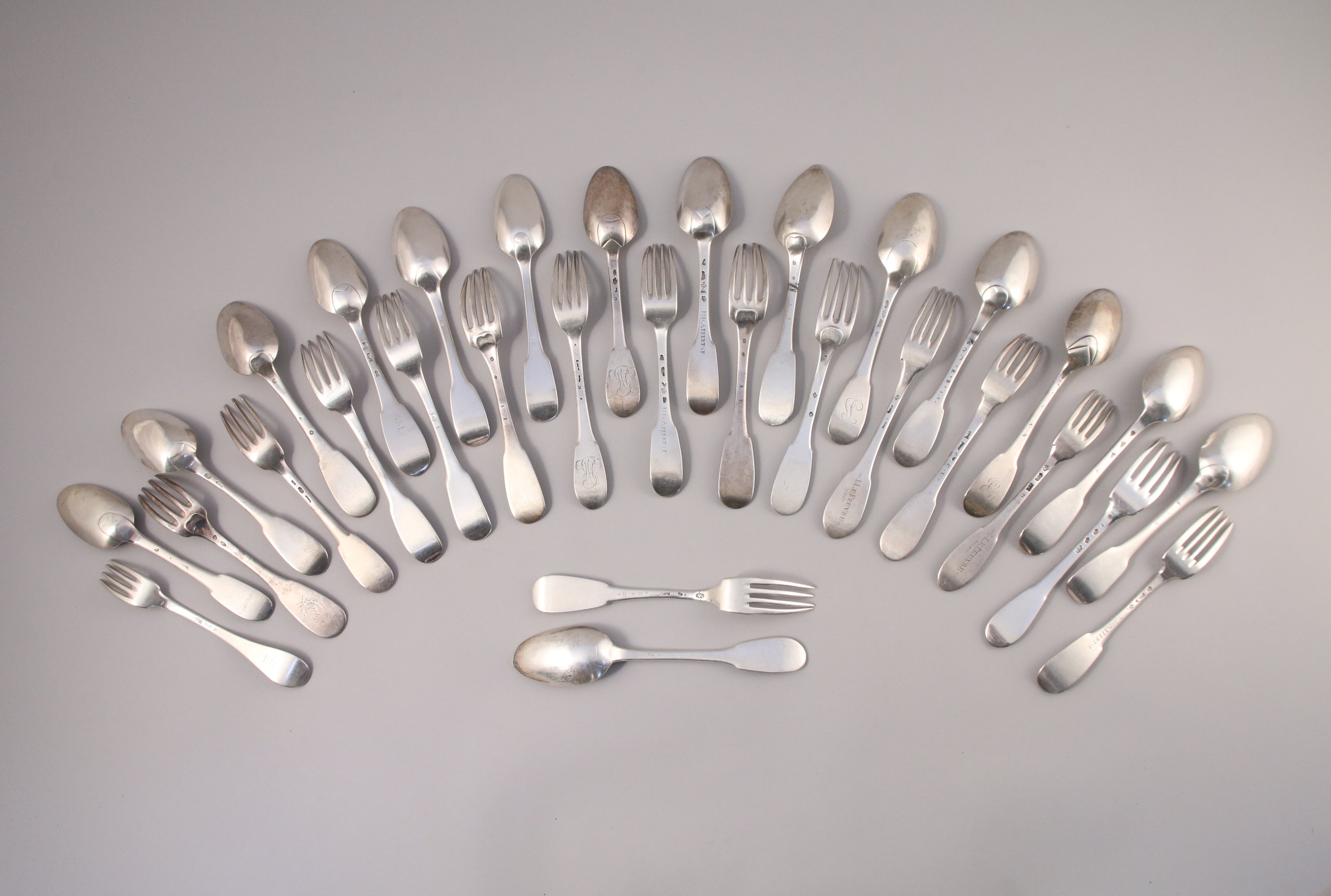 RENNES. RÉUNION de COUVERTS DE TABLE: Onze fourchettes et douze cuillères aux poinçons des fermiers généraux XVIIIe et trois cuillères et cinq fourchettes poinçon Vieillard et Minerve XIXe dont: