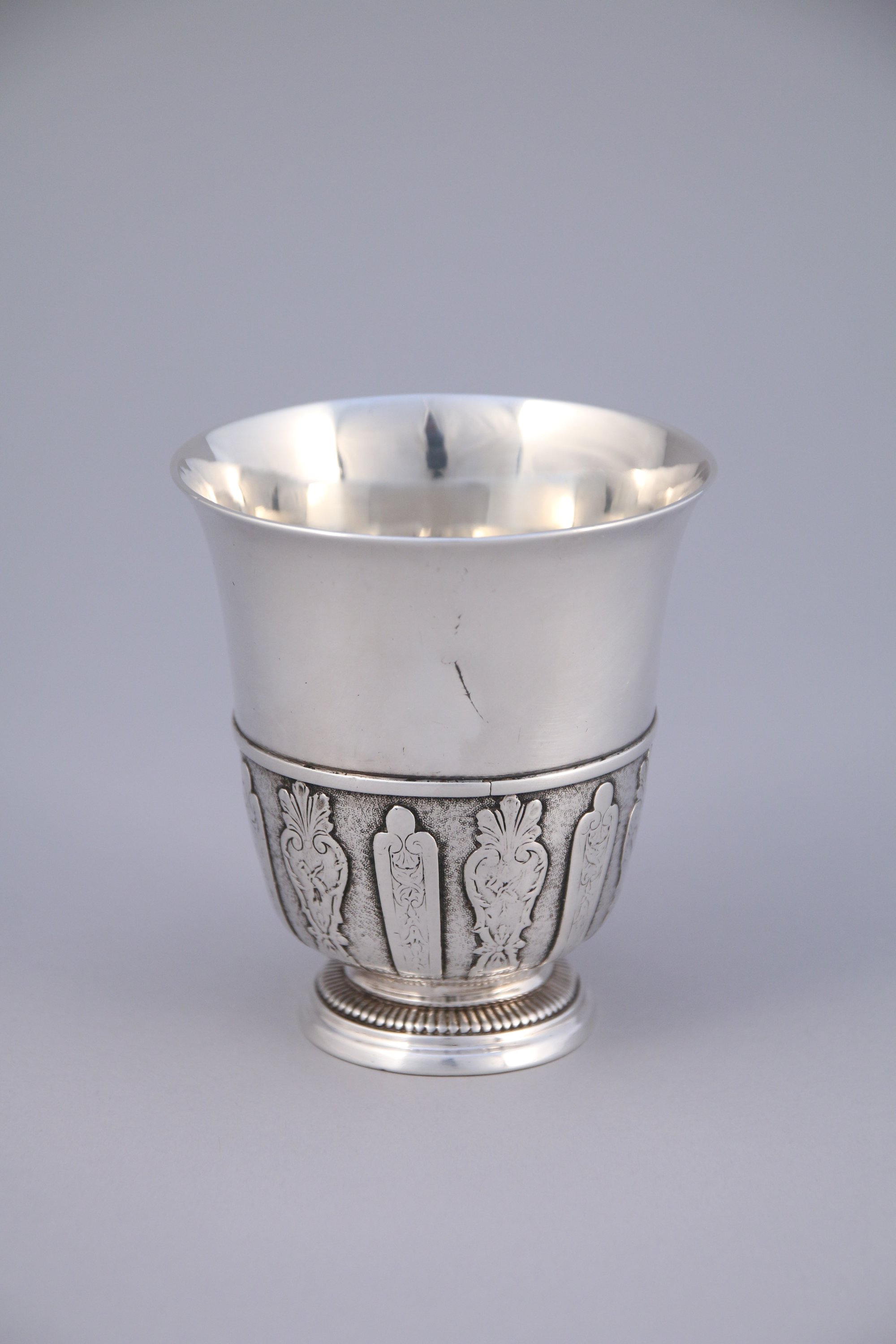 BORDEAUX. TIMBALE TULIPE en argent uni souligné à mi-corps par une moulure de filets. La partie inférieure reçoit un décor dappliques sur fond amati alternant lancéoles et lambrequins. Le piedouche à motifs de godrons.