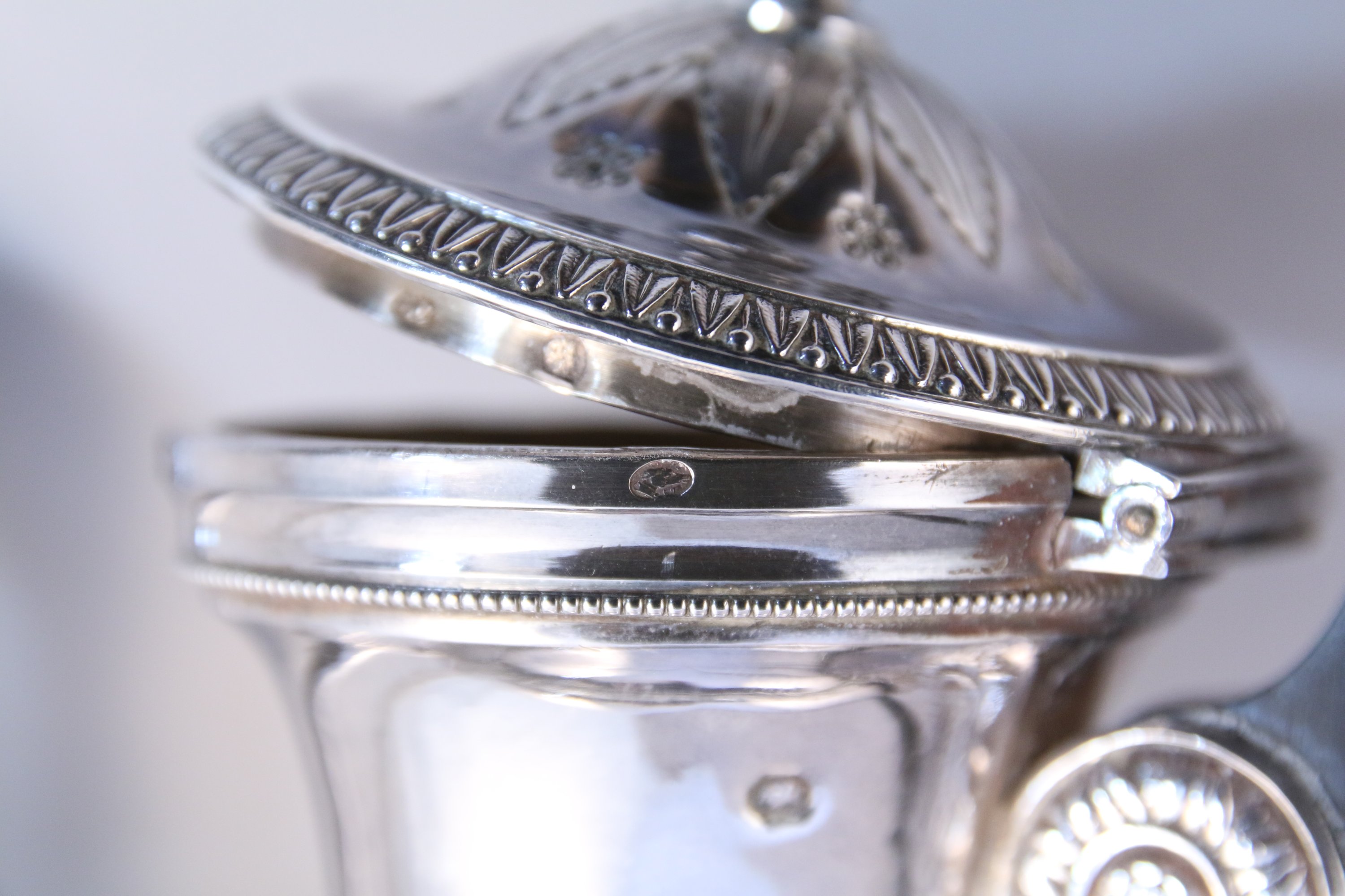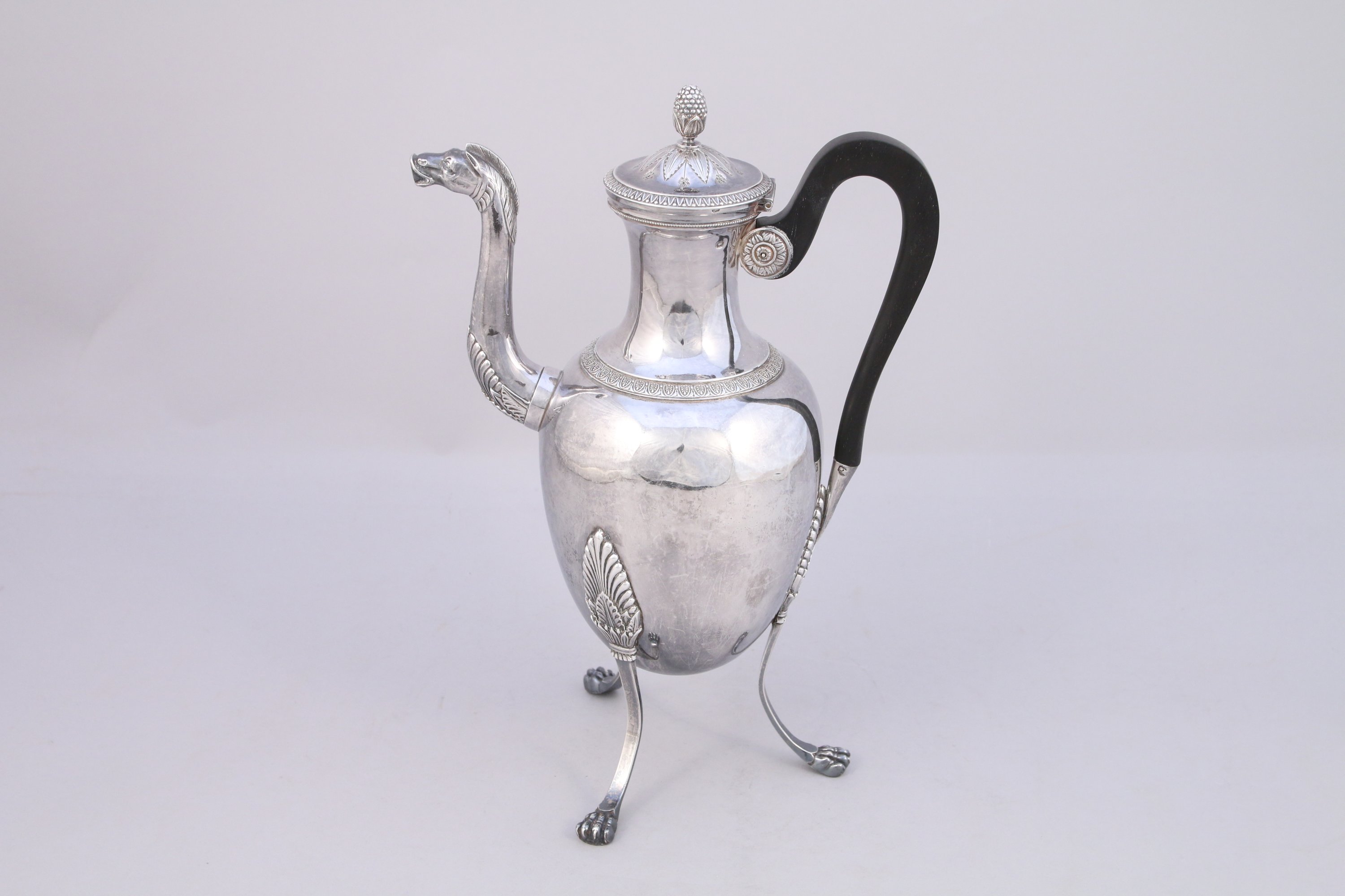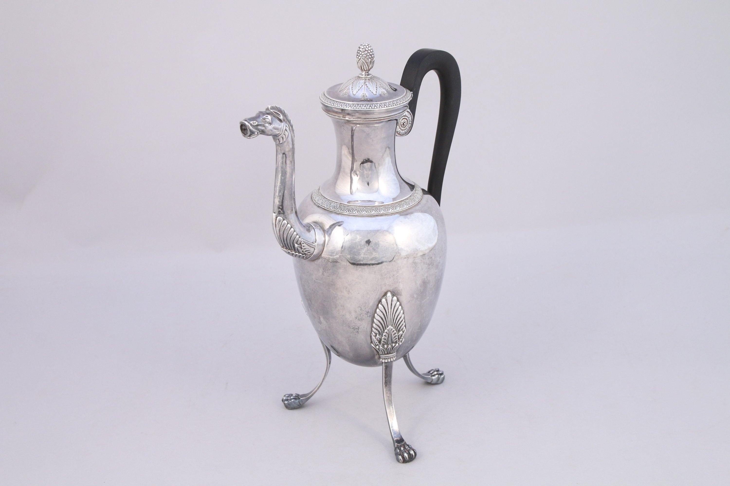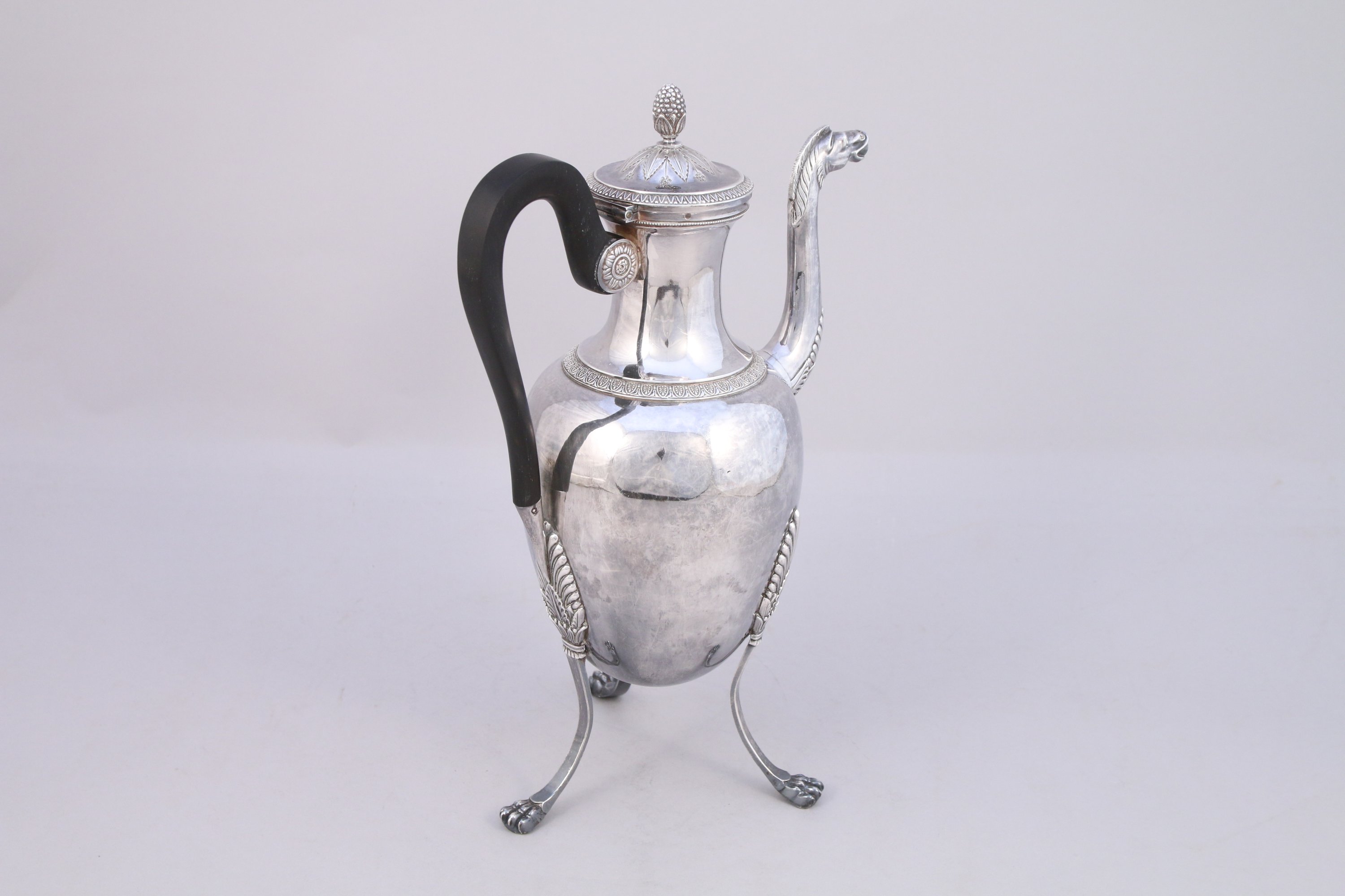 PARIS. CAFETIÈRE de forme ovoïde en argent à décor de frises d'oves et d'arces et de palmettes et raies de coeur. Couvercle à charnière à fretel en gland. Bec en tête de cheval. Anse en ébéne. Elle repose sur trois pieds en pattes de lion à larges attaches en palmettes.
