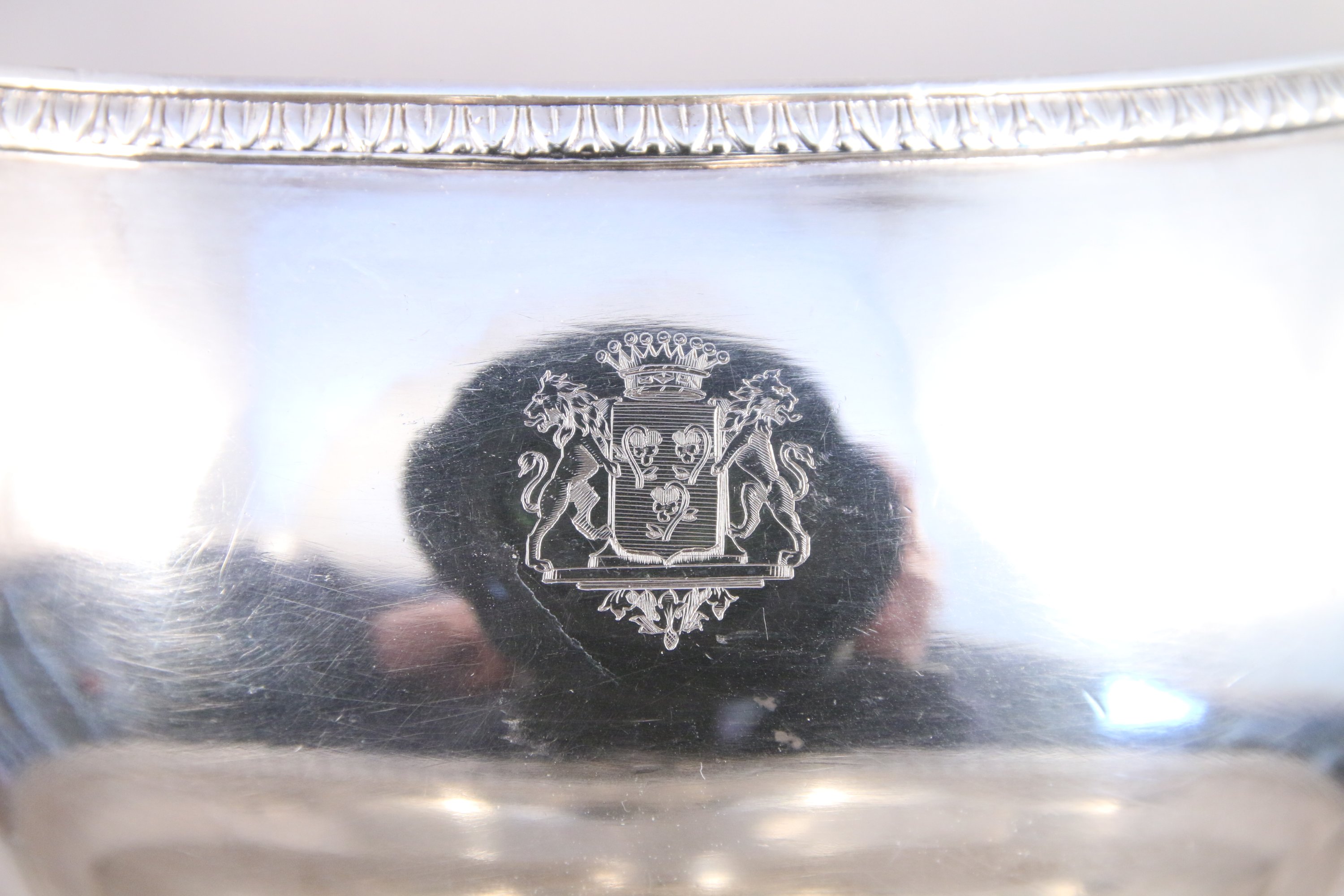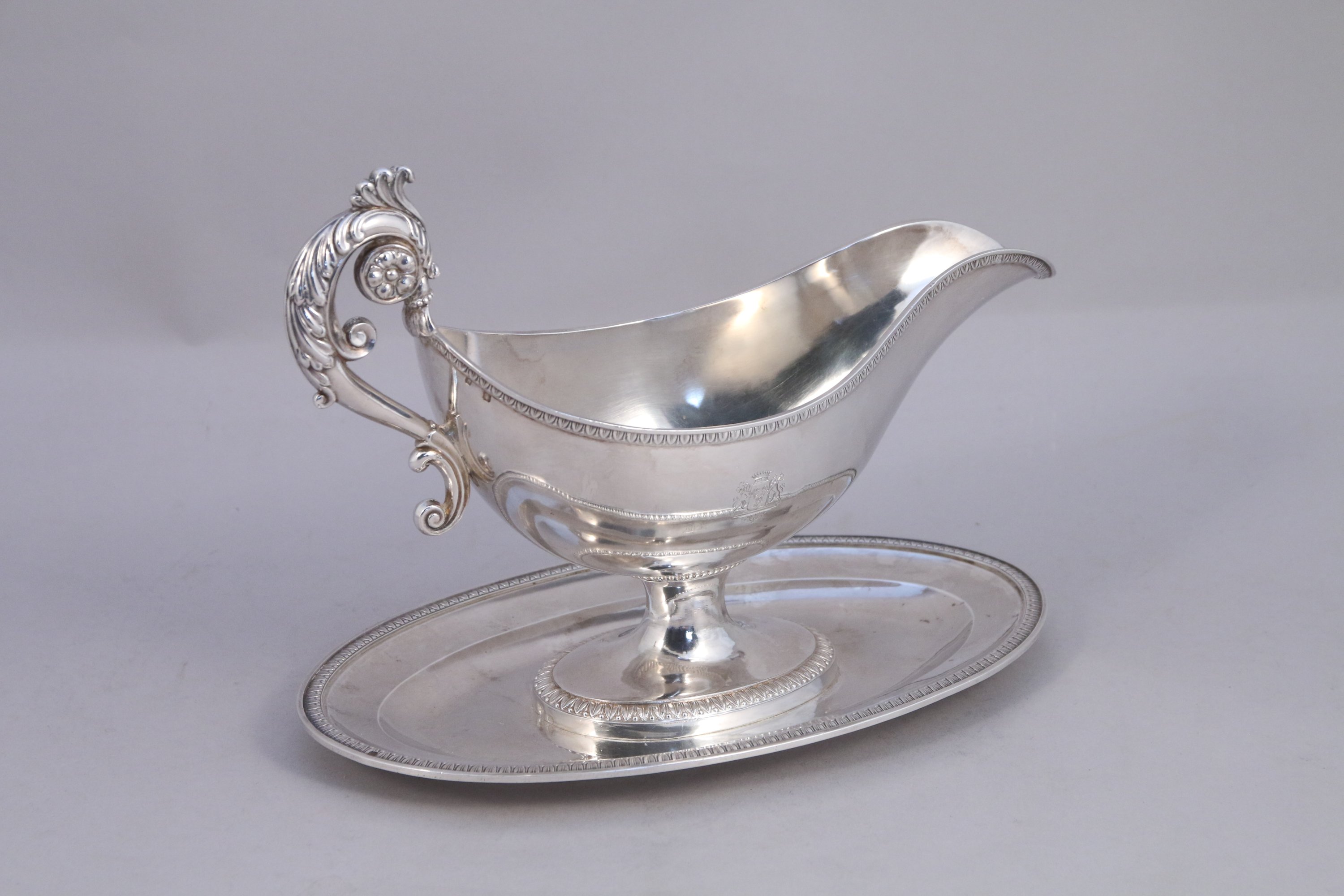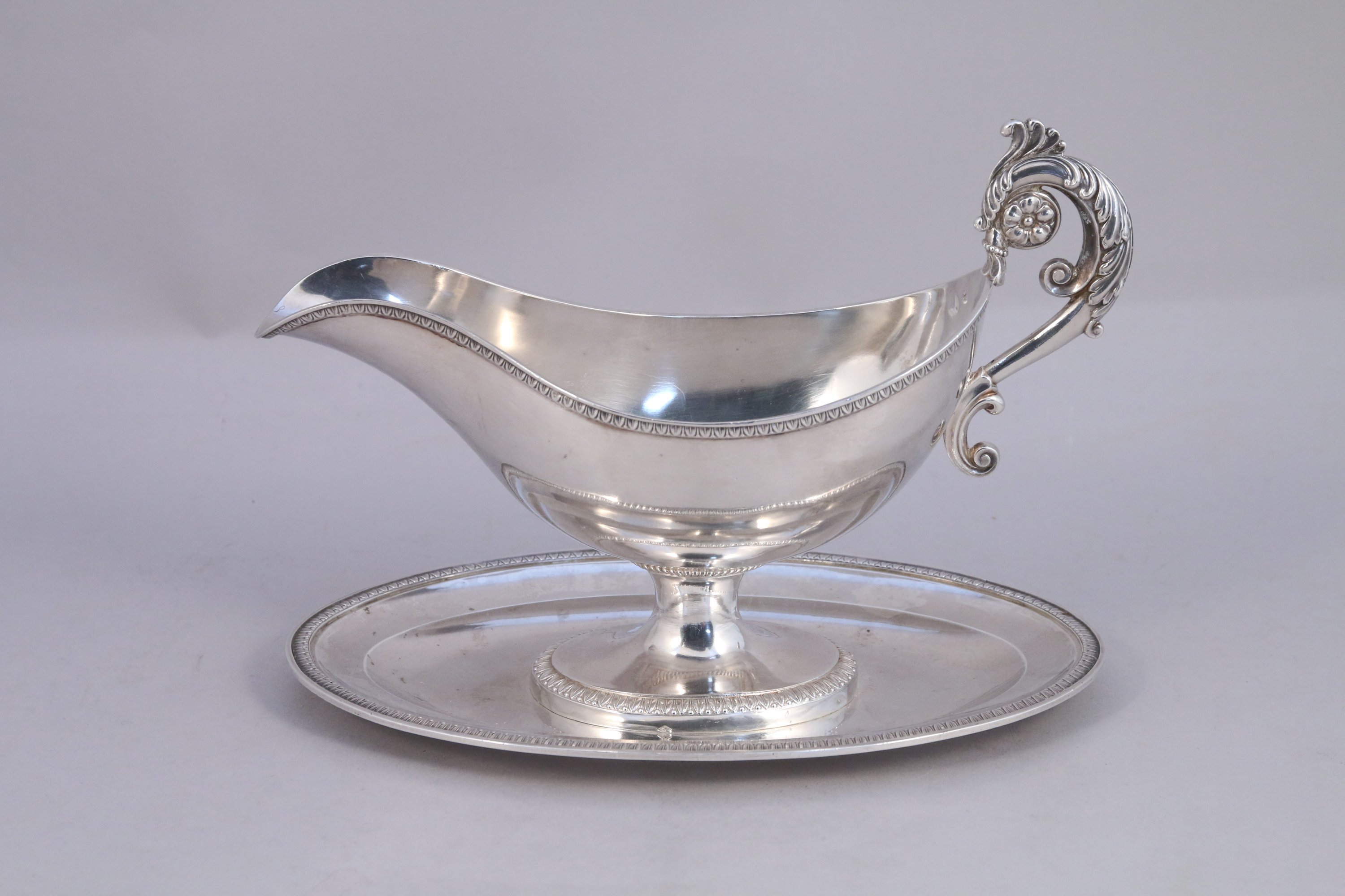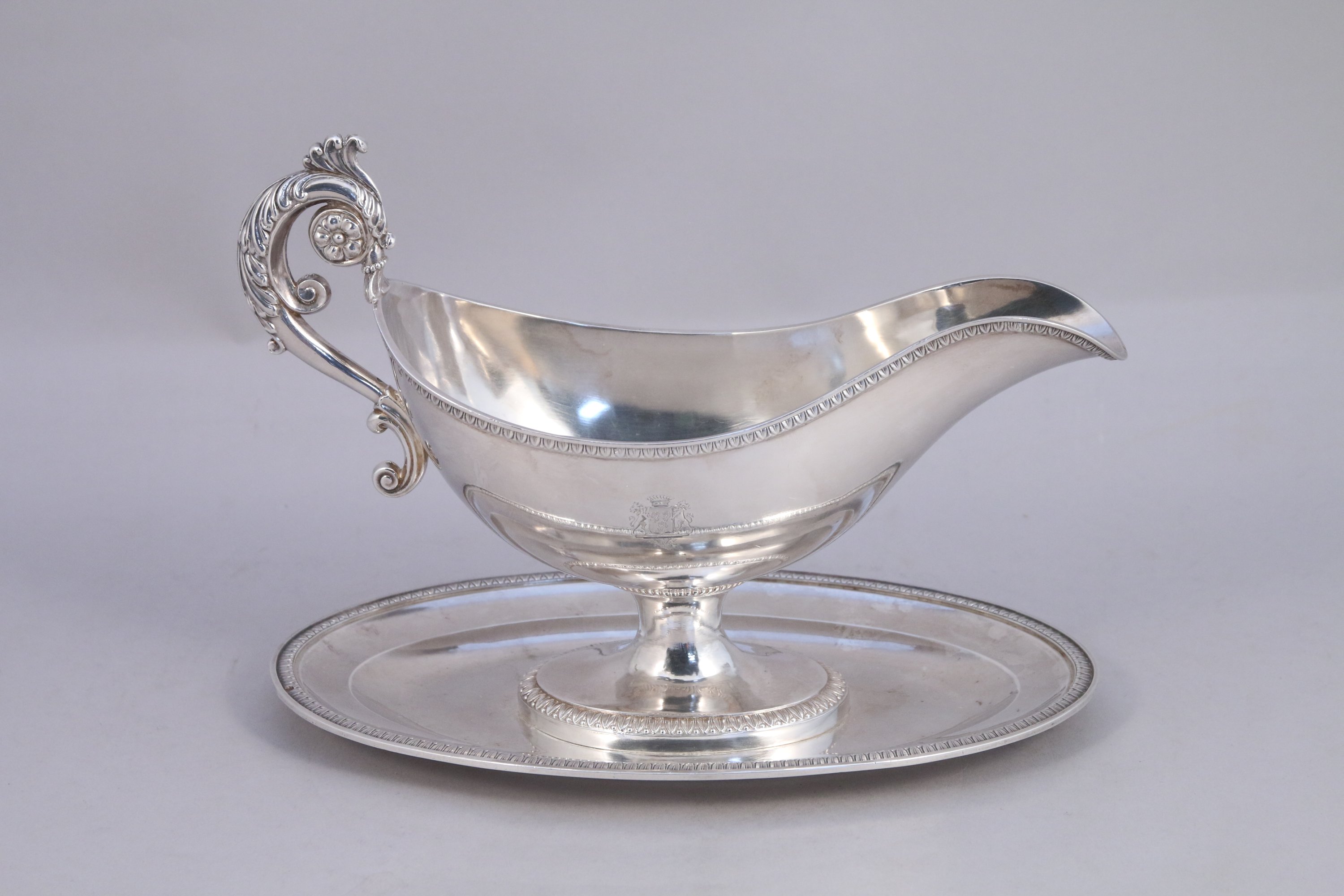 PARIS. SAUCIÈRE et son PLATEAU FIXE en argent, la saucière bordée d'une frise de feuilles d'eau repris à la base du piédouche, l'anse à enroulement feuillagé terminé par une fleurette. Le plateau oblong souligné d'une feuilles d'eau, le marly gravé d'un blason surmonté d'une couronne comtale entre deux lions.