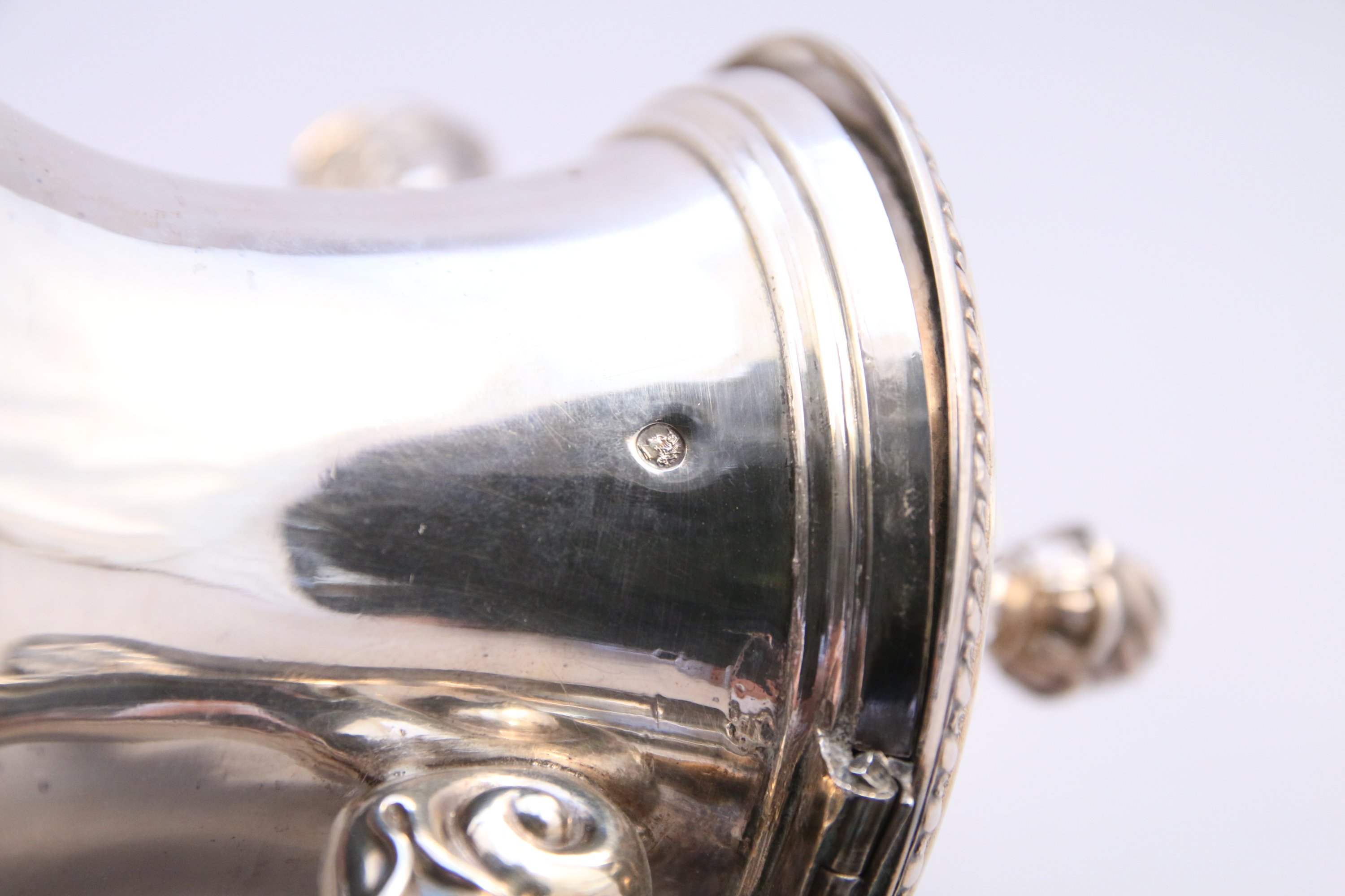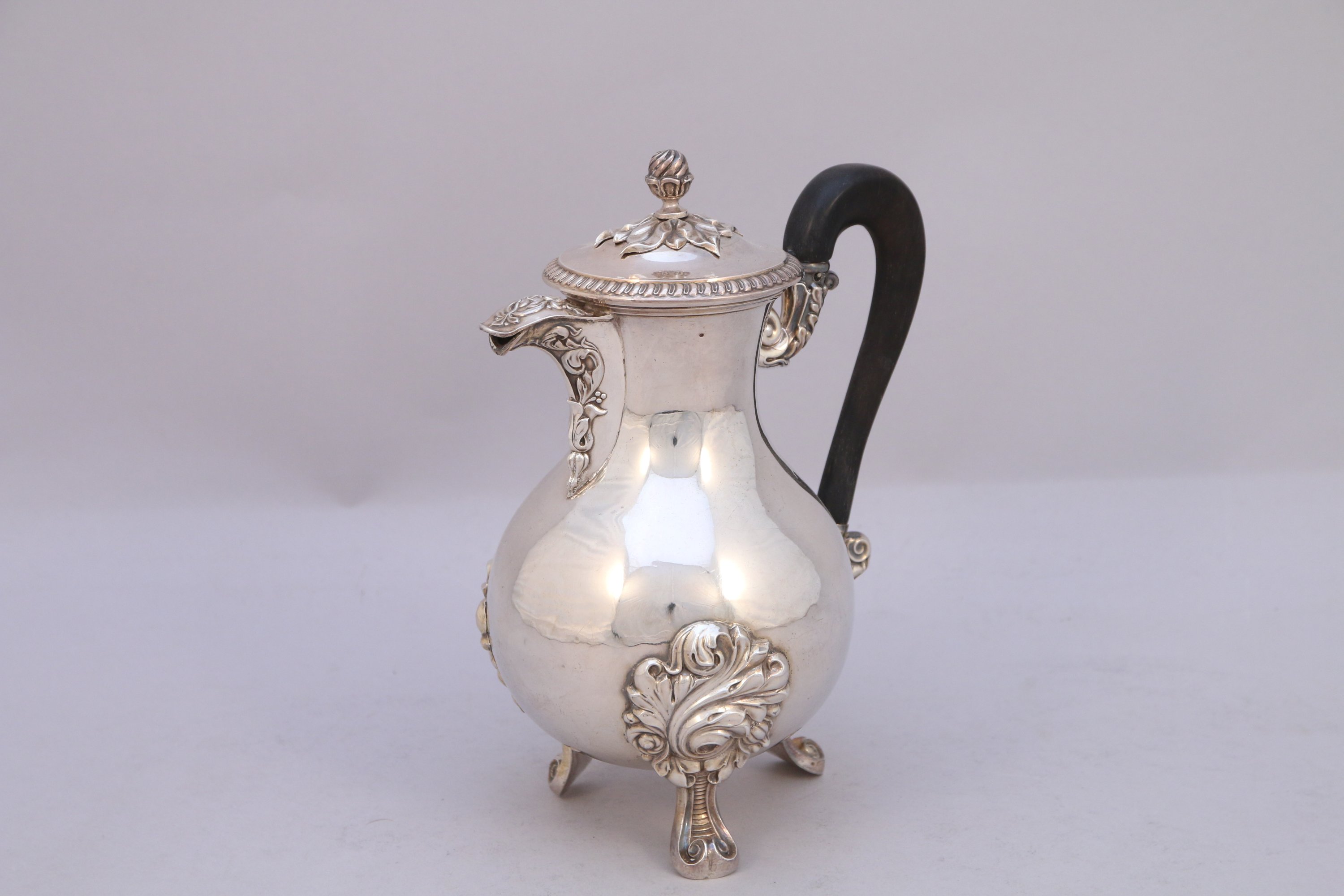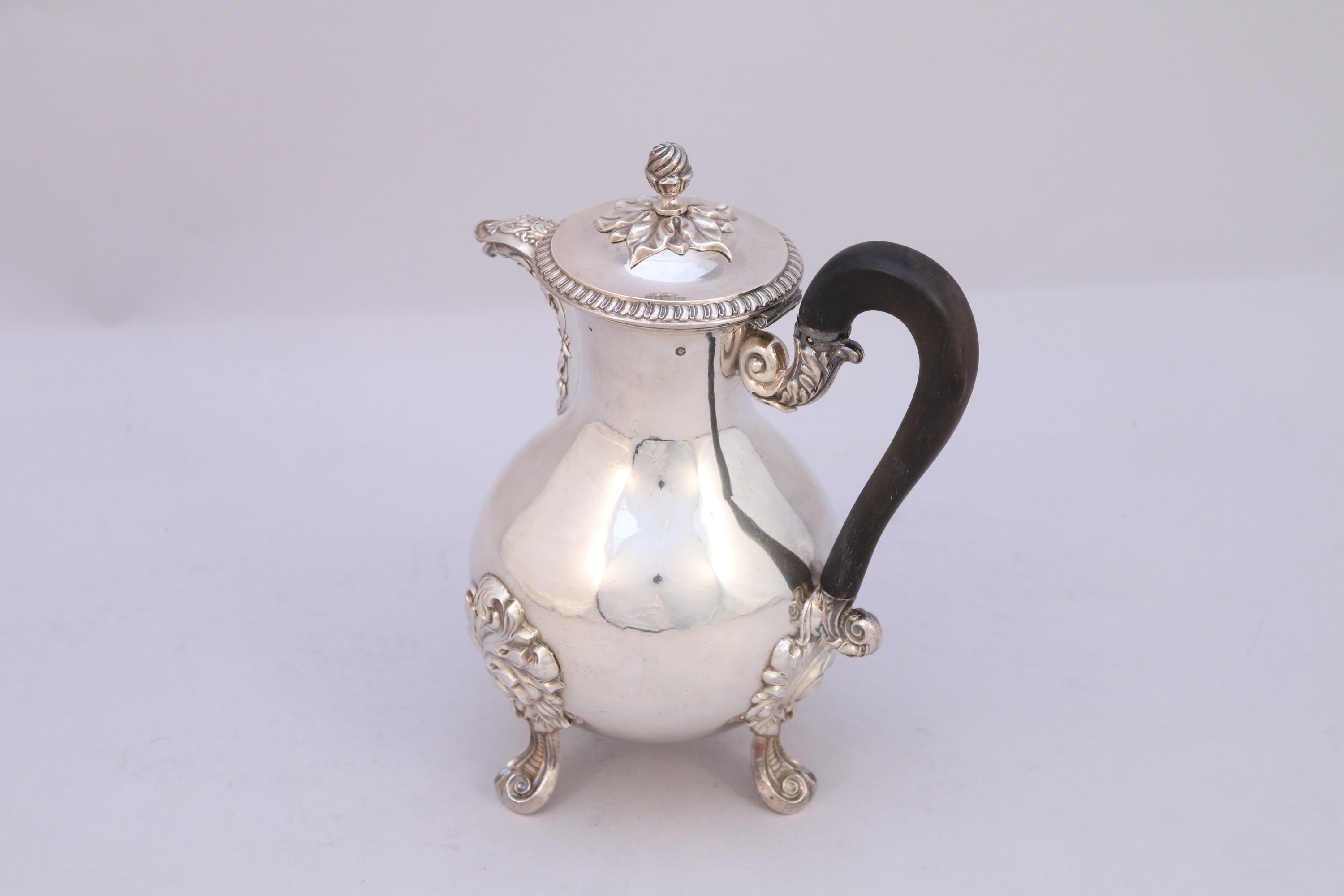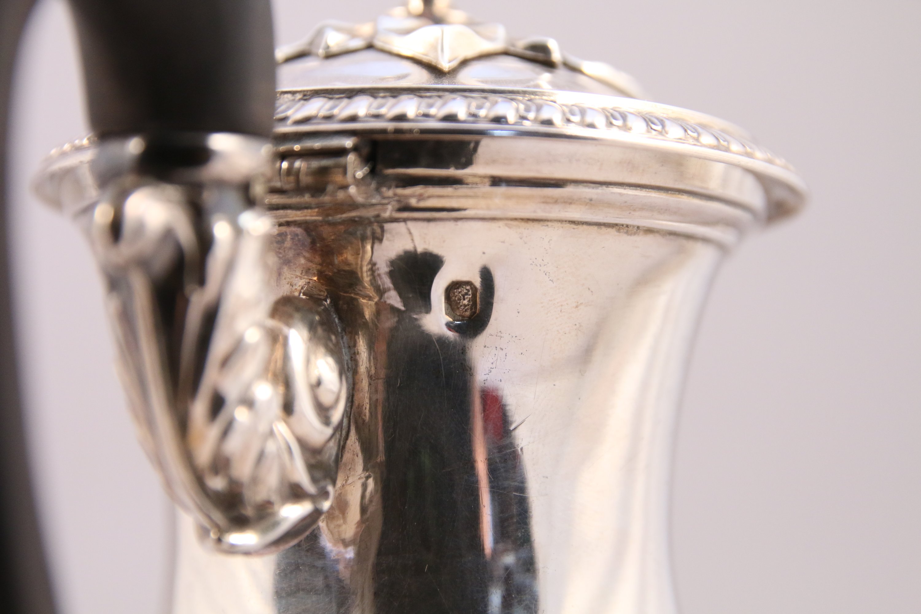 PARIS. VERSEUSE piriforme en argent. Le couvercle grodronné surmonté d'un fretel figurant une graine reposant sur une terrasse feuillagée. Le bec est orné d'un feuillage stylisé. Elle repose sur trois pieds à larges attaches feuillagées. Manche latéral en bois noirci.