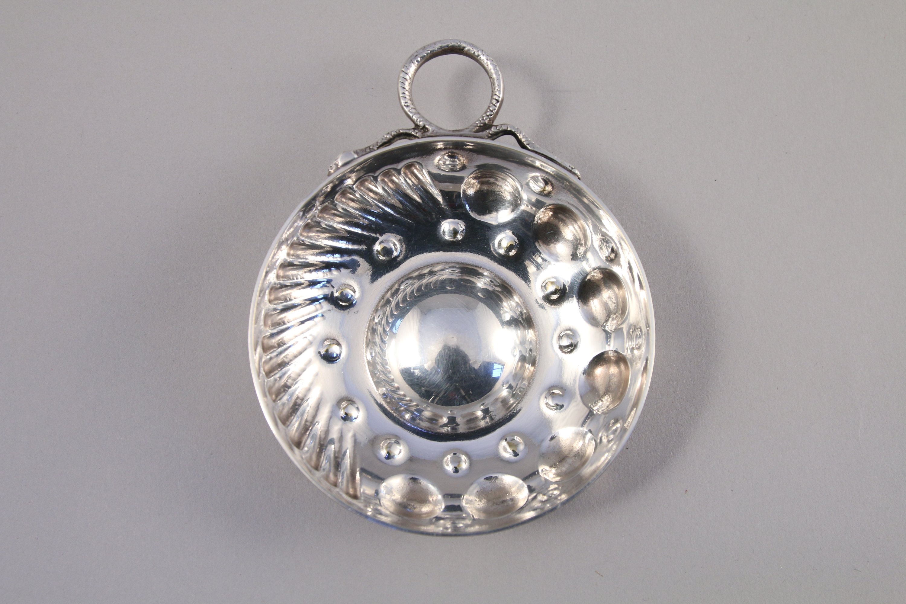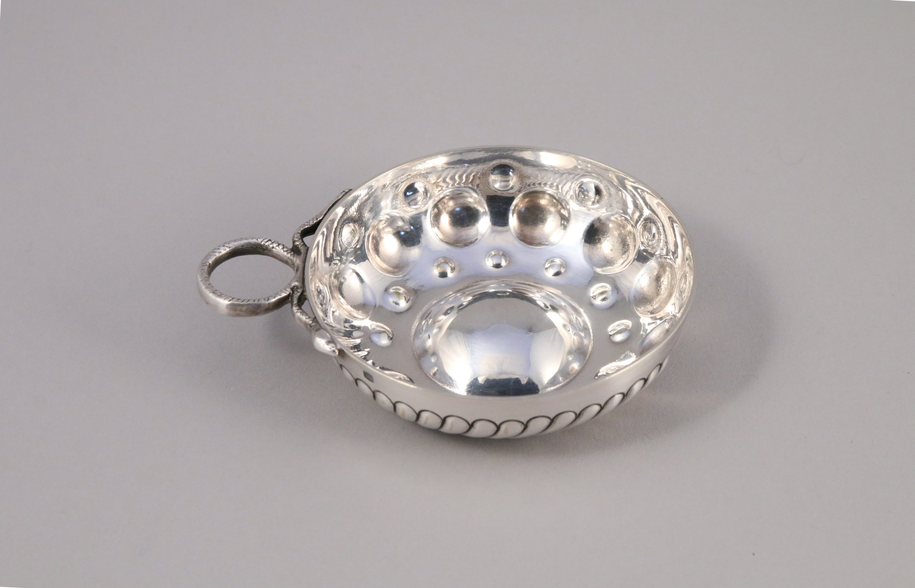 JOINT: Un TASTE-VIN en métal argenté. Décor de godrons et cupules. Diam. 8,3 cm.