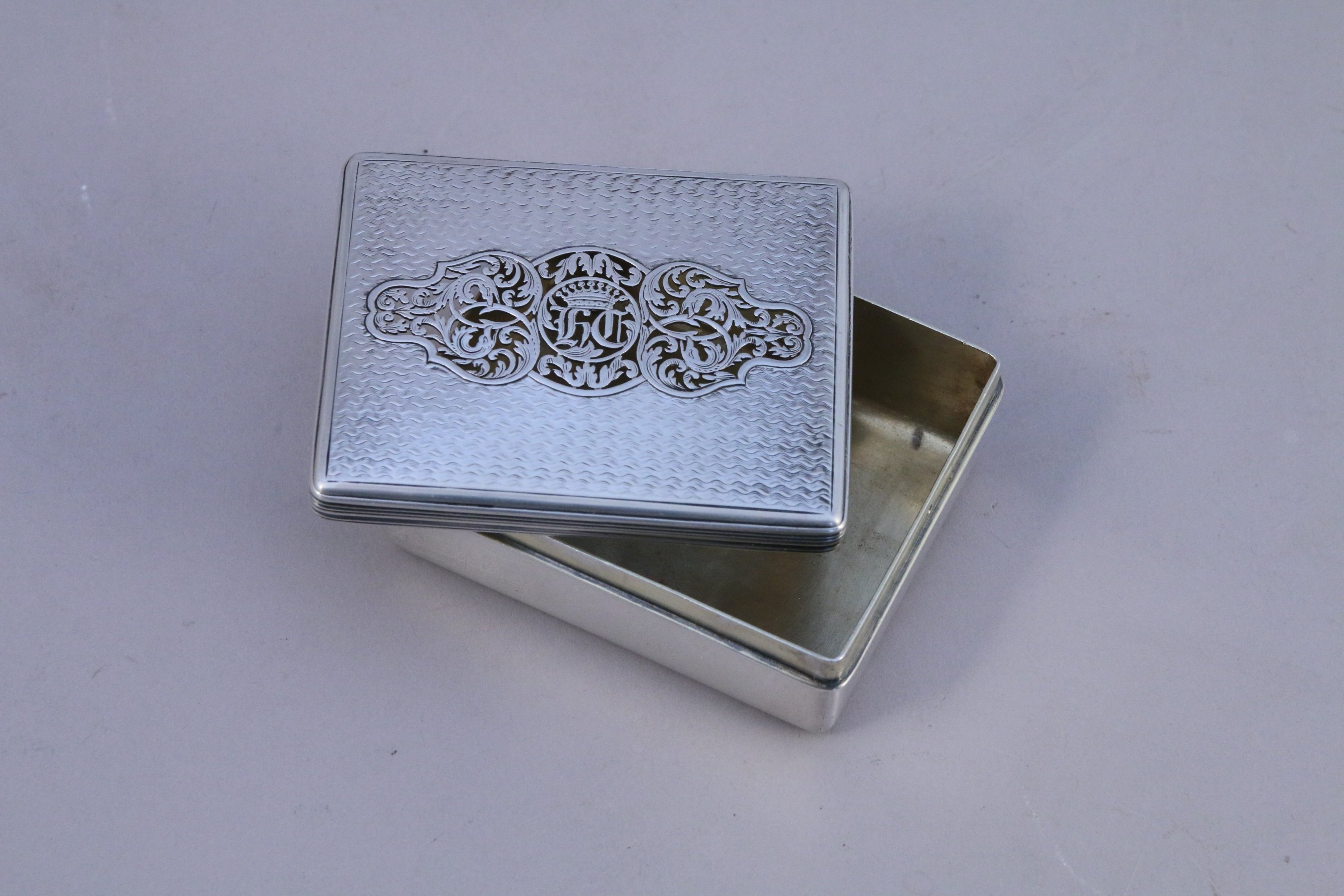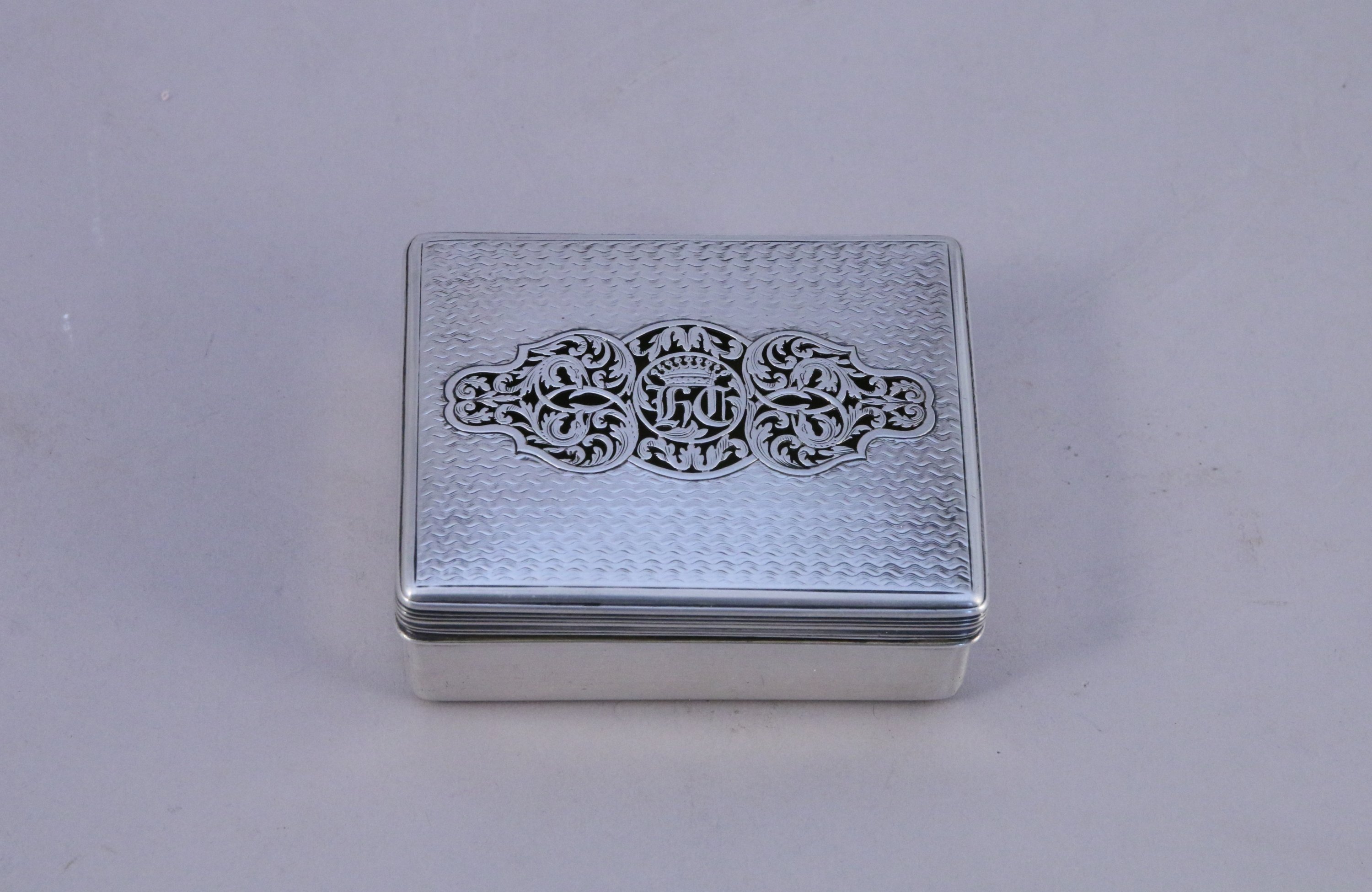BOITE en argent de forme quadrangulaire, le couvercle à décor guilloché de vagues et gravé au centre d'un cartouche ajouré d'un enroulement feuillagé et du monogramme "H D" surmonté d'une couronne comtale. Intérieur vermeillé.