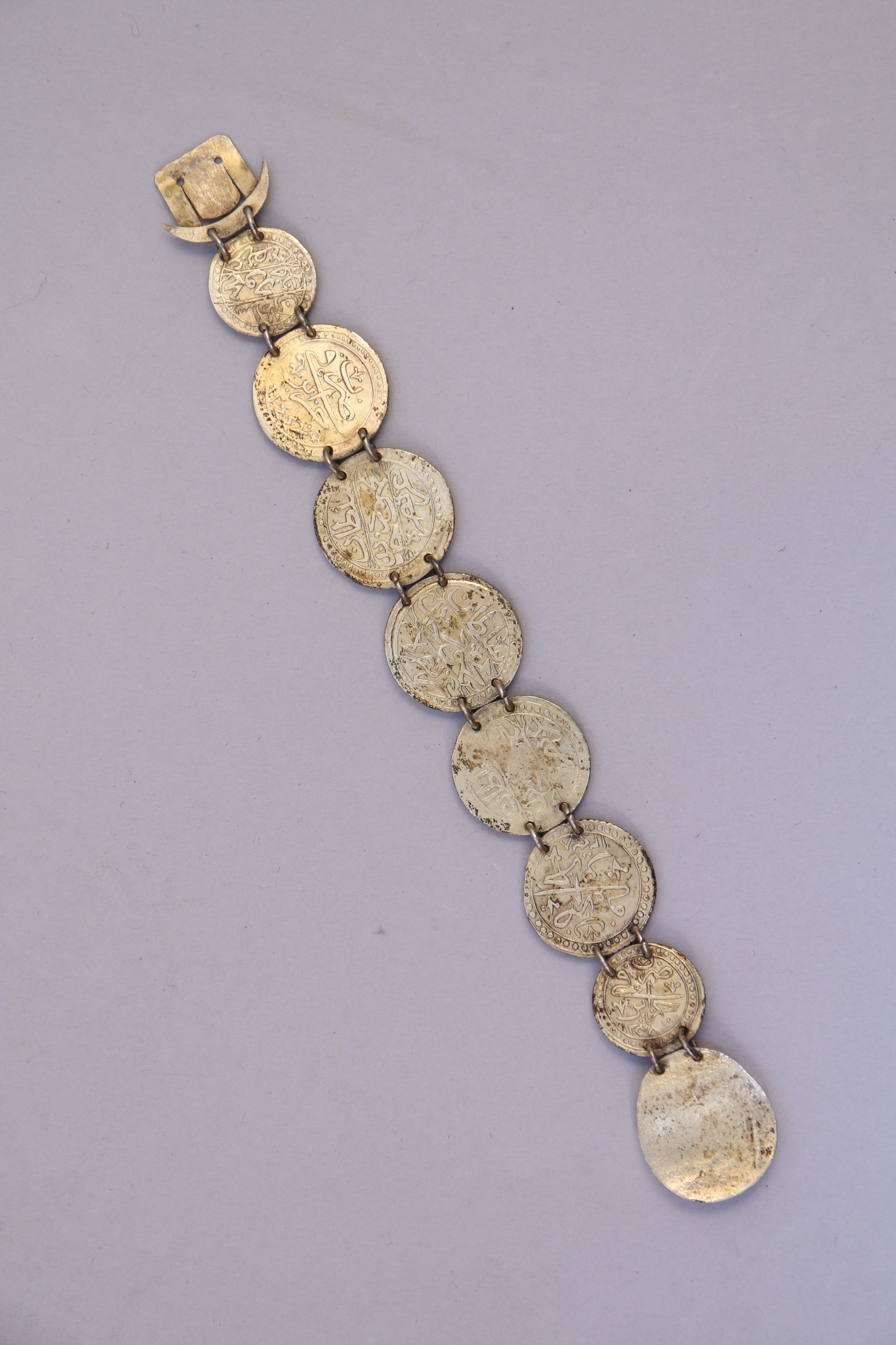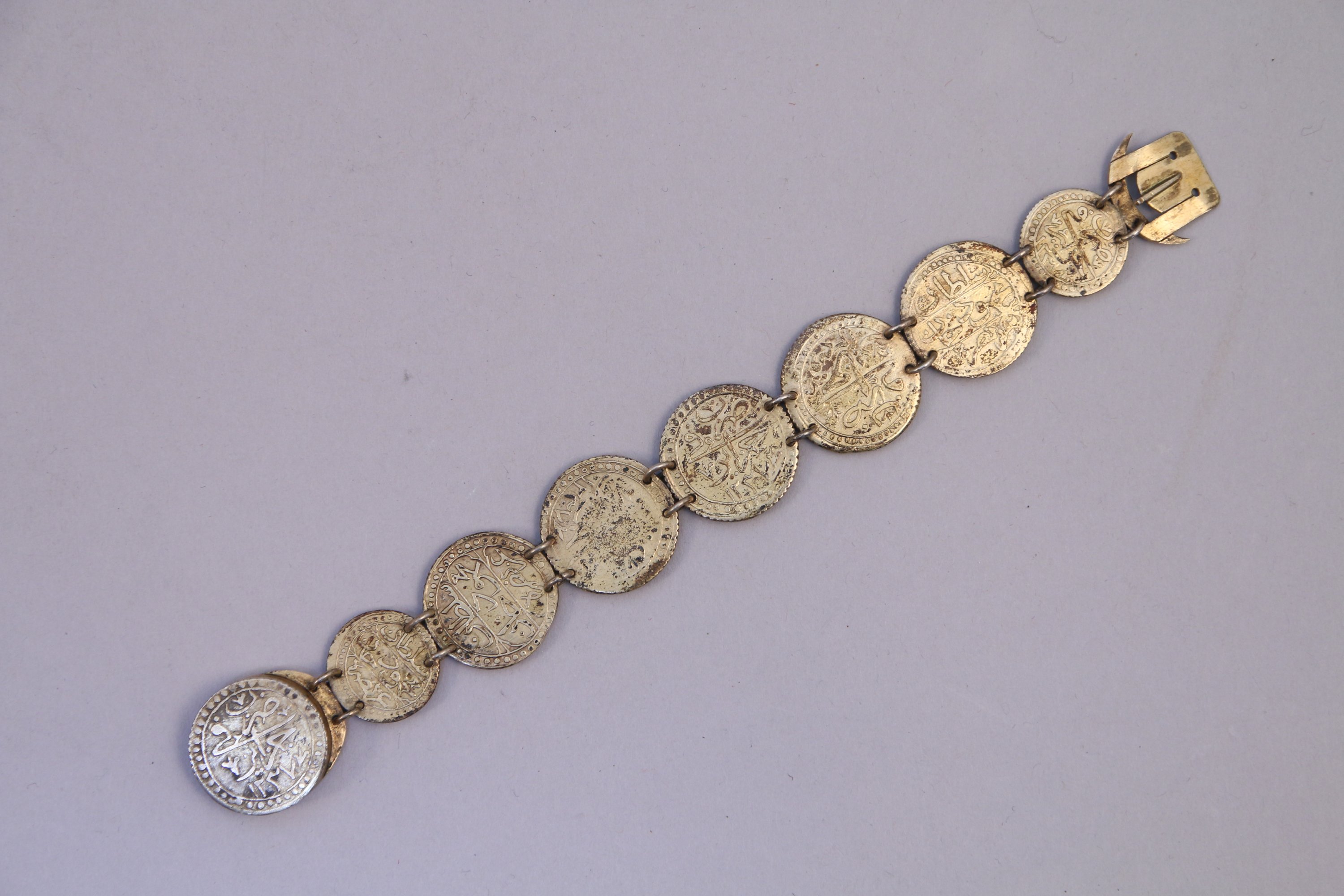 - BRACELET articulé orné de HUIT pièces de monnaie étrangères en métal. Long. 17,5 cm.