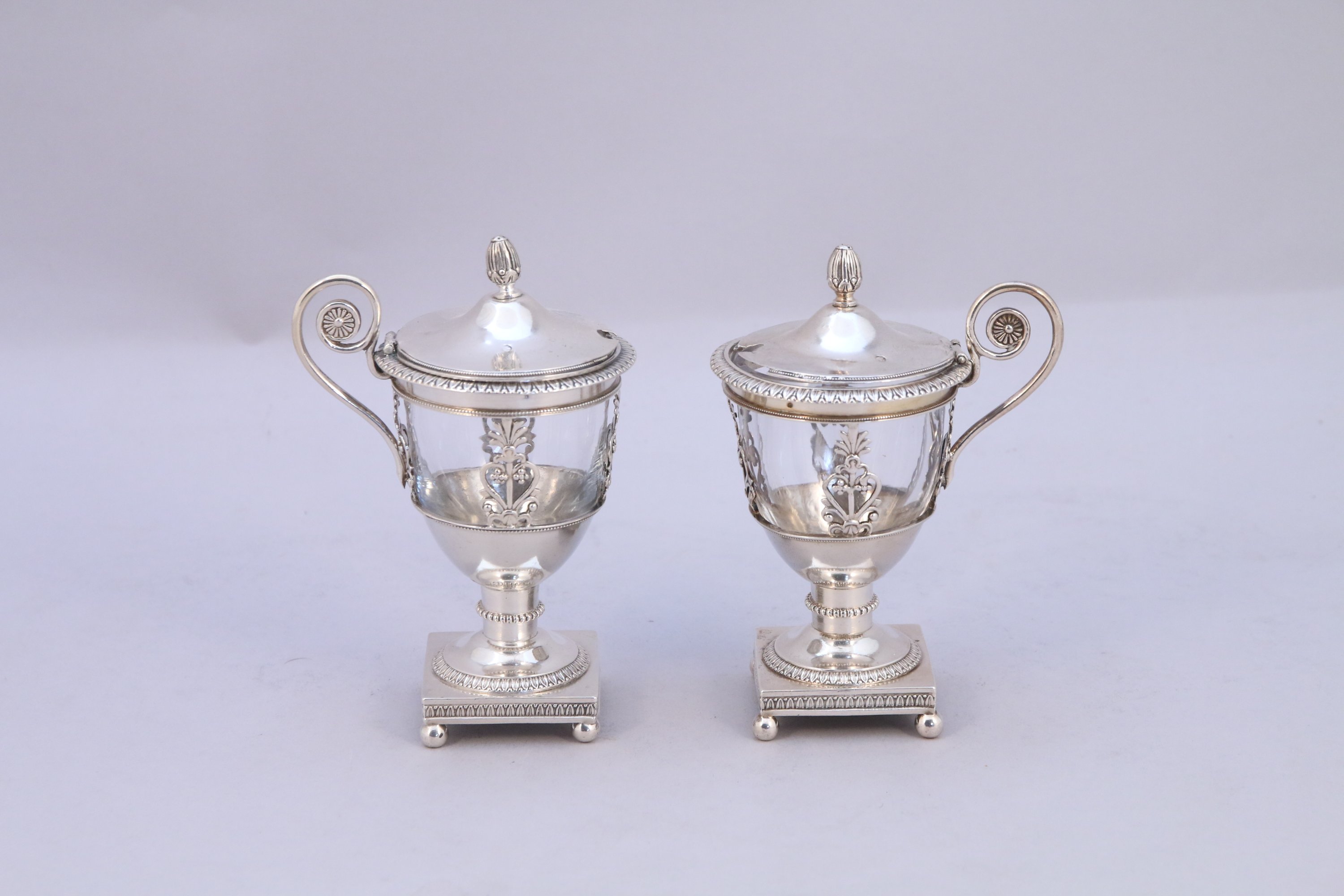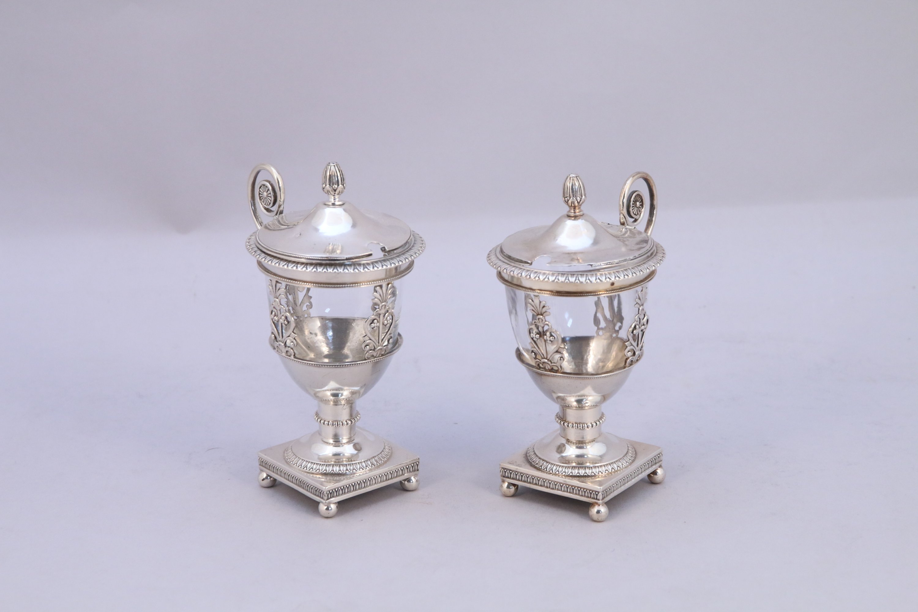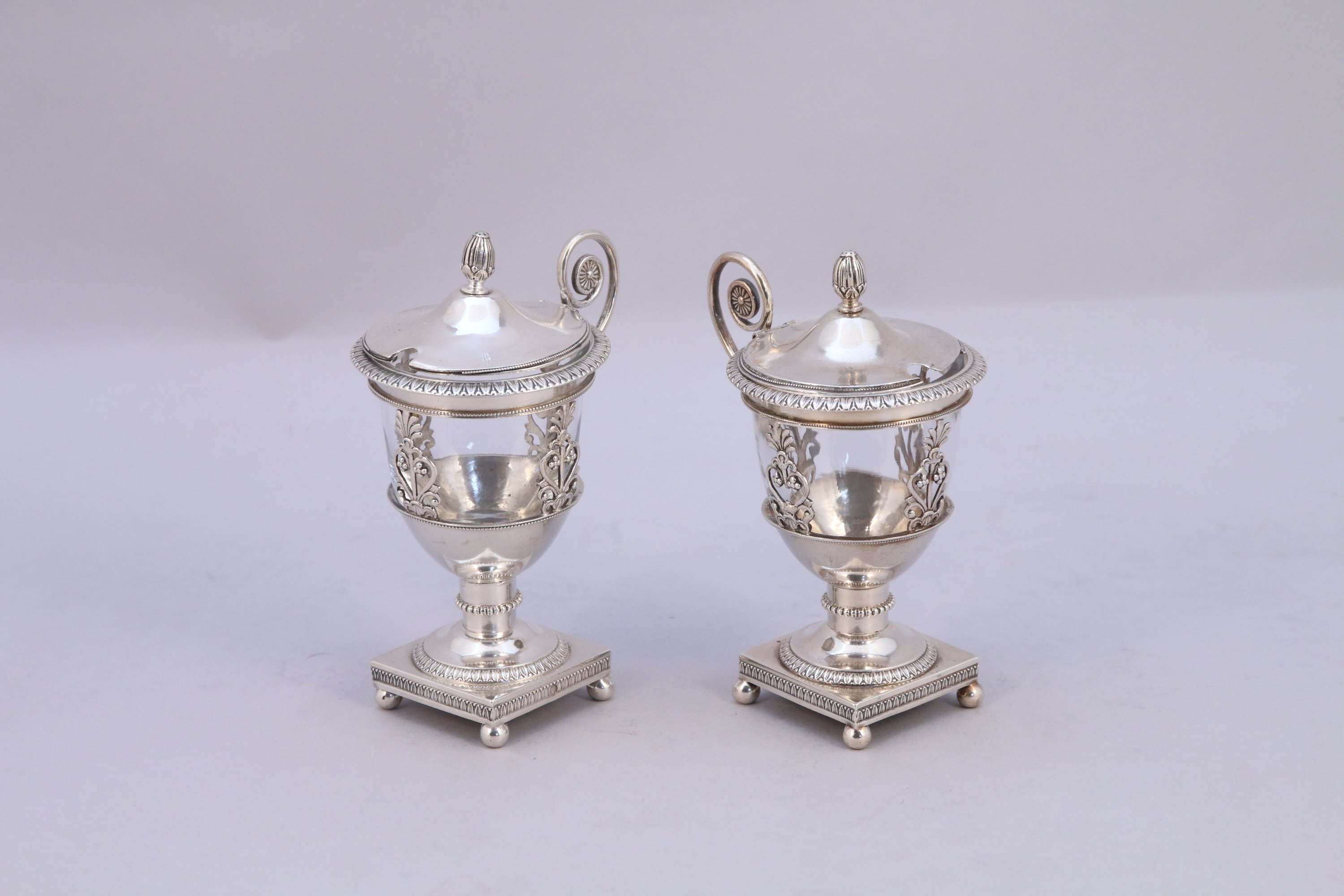 PAIRE de MOUTARDIERS en argent, le couvercle de forme circulaire orné d'une frise de feuilles d'eau. Panse ajourée d'un motif de palmettes, le piédouche repose sur une base quadrangulaire ornée de frises de feuilles d'eau, soutenue par quatre pieds en sphères aplaties. Frétel en pomme de pin, anse latérale à enroulement terminée par une rosace. Godet de verre.